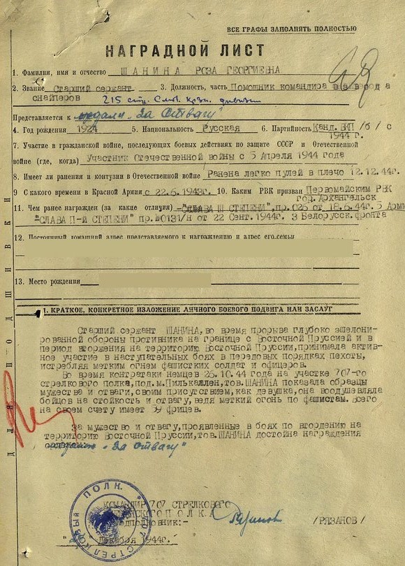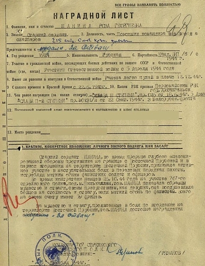 Шанина Роза Георгиевна (1924–1945) – старший сержант, советский снайпер, одна из первых женщин-снайперов, удостоенная ордена Славы. Родилась 3 апреля 1924 года в деревне Едьма Архангельской области. В 14 лет уехала в Архангельск на учёбу в педагогическом училище, подрабатывала воспитательницей в детском саду. После начала Великой Отечественной войны оставила учёбу. В июне 1943 года добровольцем вступила в ряды Красной Армии. Прошла всевобуч, затем с отличием окончила Центральную женскую школу снайперской подготовки в городе Подольске (Московская область). С апреля 1944 года в действующей армии. 17 апреля 1944 года ефрейтор Шанина была представлена командованием части к первой награде за уничтожение 13 солдат и офицеров противника. 18 апреля 1944 года награждена орденом Славы 3-й степени. 16 сентября 1944 года старший сержант Шанина была награждена орденом Славы II степени за уничтожение 53 солдат и офицеров противника. 27 декабря 1944 года помощник командира взвода снайперов 215-й стрелковой Смоленской Краснознамённой дивизии (5-я Армия, 3-й Белорусский фронт) старший сержант Шанина получила медаль «За отвагу». 27 января 1945 года старший сержант Шанина, прикрывшая раненого командира артиллерийского подразделения, была смертельно ранена в грудь. К тому времени на её личном счету числилось, по различным источникам, от 63 до 75 уничтоженных фашистов, в том числе 12 снайперов.