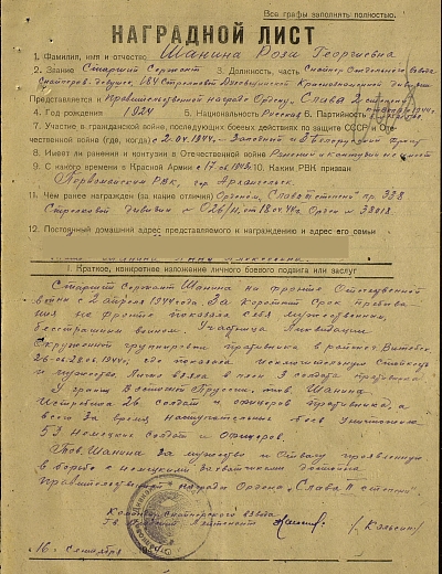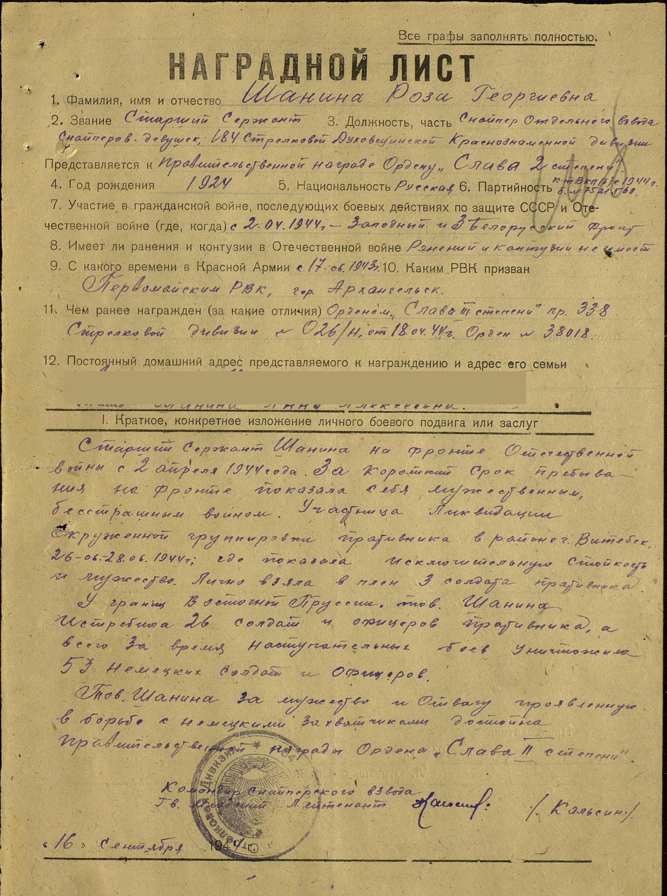 Шанина Роза Георгиевна (1924–1945) – старший сержант, советский снайпер, одна из первых женщин-снайперов, удостоенная ордена Славы. Родилась 3 апреля 1924 года в деревне Едьма Архангельской области. В 14 лет уехала в Архангельск на учёбу в педагогическом училище, подрабатывала воспитательницей в детском саду. После начала Великой Отечественной войны оставила учёбу. В июне 1943 года добровольцем вступила в ряды Красной Армии. Прошла всевобуч, затем с отличием окончила Центральную женскую школу снайперской подготовки в городе Подольске (Московская область). С апреля 1944 года в действующей армии. 17 апреля 1944 года ефрейтор Шанина была представлена командованием части к первой награде за уничтожение 13 солдат и офицеров противника. 18 апреля 1944 года награждена орденом Славы 3-й степени. 16 сентября 1944 года старший сержант Шанина была награждена орденом Славы II степени за уничтожение 53 солдат и офицеров противника. 27 декабря 1944 года помощник командира взвода снайперов 215-й стрелковой Смоленской Краснознамённой дивизии (5-я Армия, 3-й Белорусский фронт) старший сержант Шанина получила медаль «За отвагу». 27 января 1945 года старший сержант Шанина, прикрывшая раненого командира артиллерийского подразделения, была смертельно ранена в грудь. К тому времени на её личном счету числилось, по различным источникам, от 63 до 75 уничтоженных фашистов, в том числе 12 снайперов.