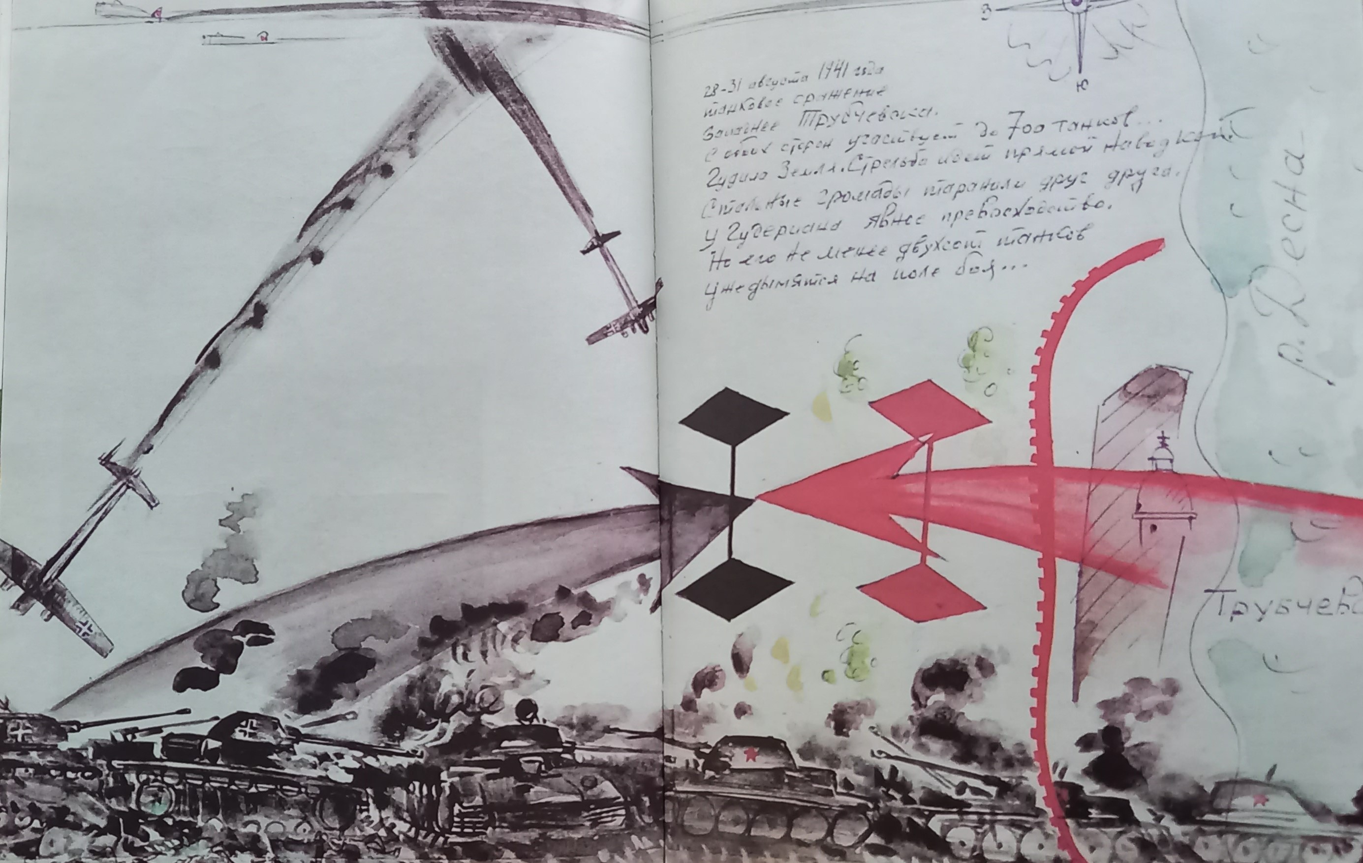 Харис Абдрахманович Якупов родился 23 декабря 1919 года в рабочей семье, в 1939-м окончил Казанское художественное училище. В январе 1940-го был призван в армию. С первых дней Великой Отечественной войны находился в рядах действующей армии. Участвовал в боях на Курской дуге, Украине, Польше, Чехословакии и Германии. Принимал участие в освобождении Освенцима. День Победы 9 мая 1945 года встретил в Праге в звании старшины. Всю войну прошёл, не расставаясь с карандашом и бумагой. В трёх сохранившихся альбомах художника – целая галерея фронтовых зарисовок и портретов советских солдат и офицеров, среди которых можно найти и эту фронтовую зарисовку с места танкового сражения на Десне около города Трубчевска.