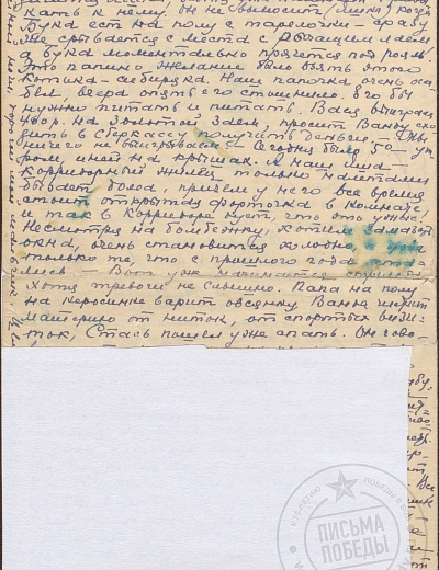 Из спроводительного документа: брат Михаил (1916 г.р.) в начале войны был на гастролях с оркестром Утесова в Москве и избежал блокадных мук. Вот ему-то и адресованы письма, мама писала ему почти ежедневно (июль 1941—июнь 1942). Сохранилось примерно 150 писем. Ветхий документ. Разрывы. Сгибы. Замятия. Пожелтения бумаги.