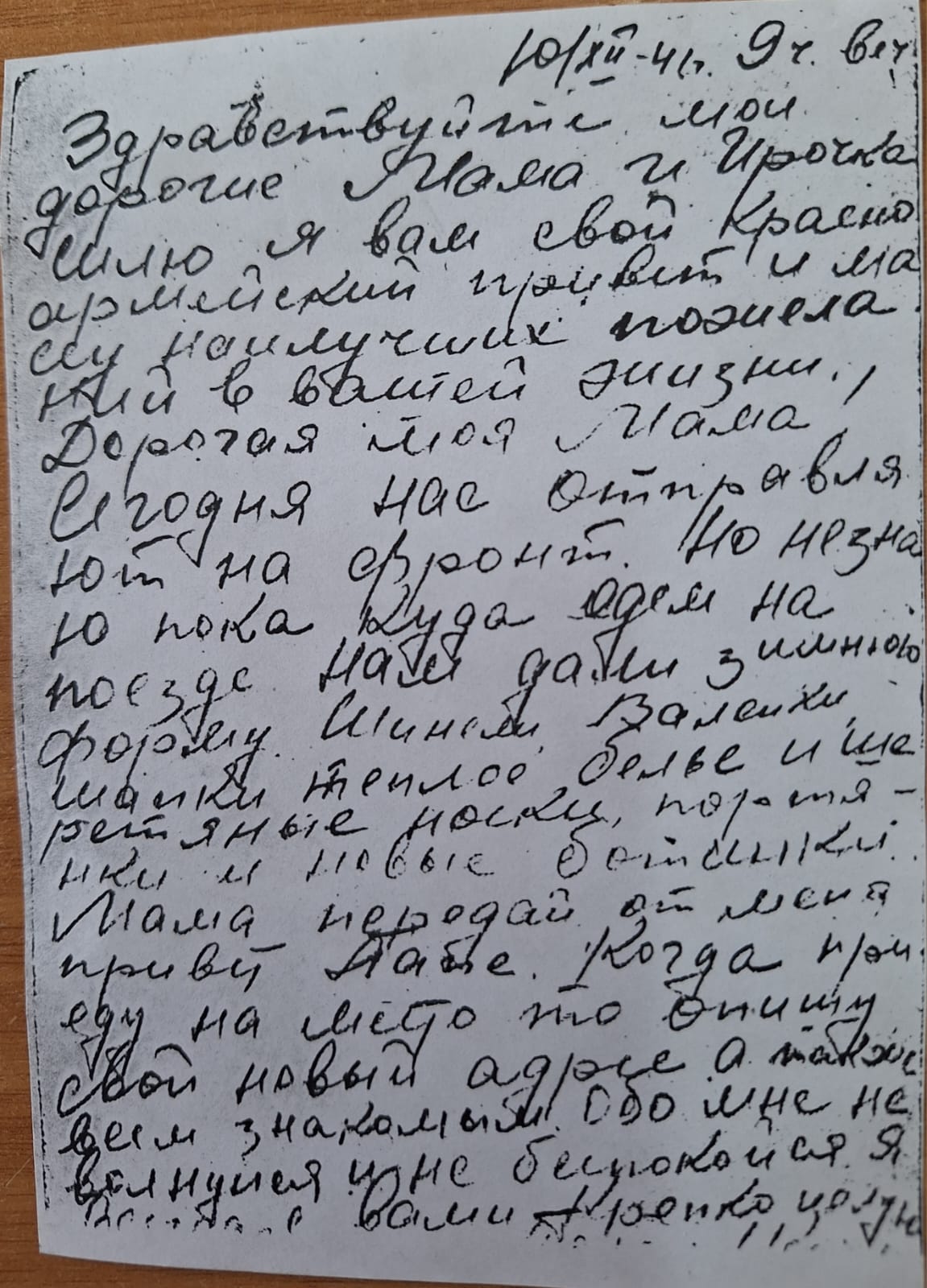 В письмах своей матери он писал: «Дорогая моя мама! Сегодня нас отправляют на фронт. Но не знаю пока, куда едем на поезде. Нам дали зимнюю форму, шинели, валенки, теплое белье и шерстяные носки, портянки и новые ботинки. Когда приеду на место, напишу».