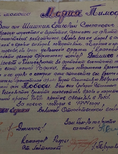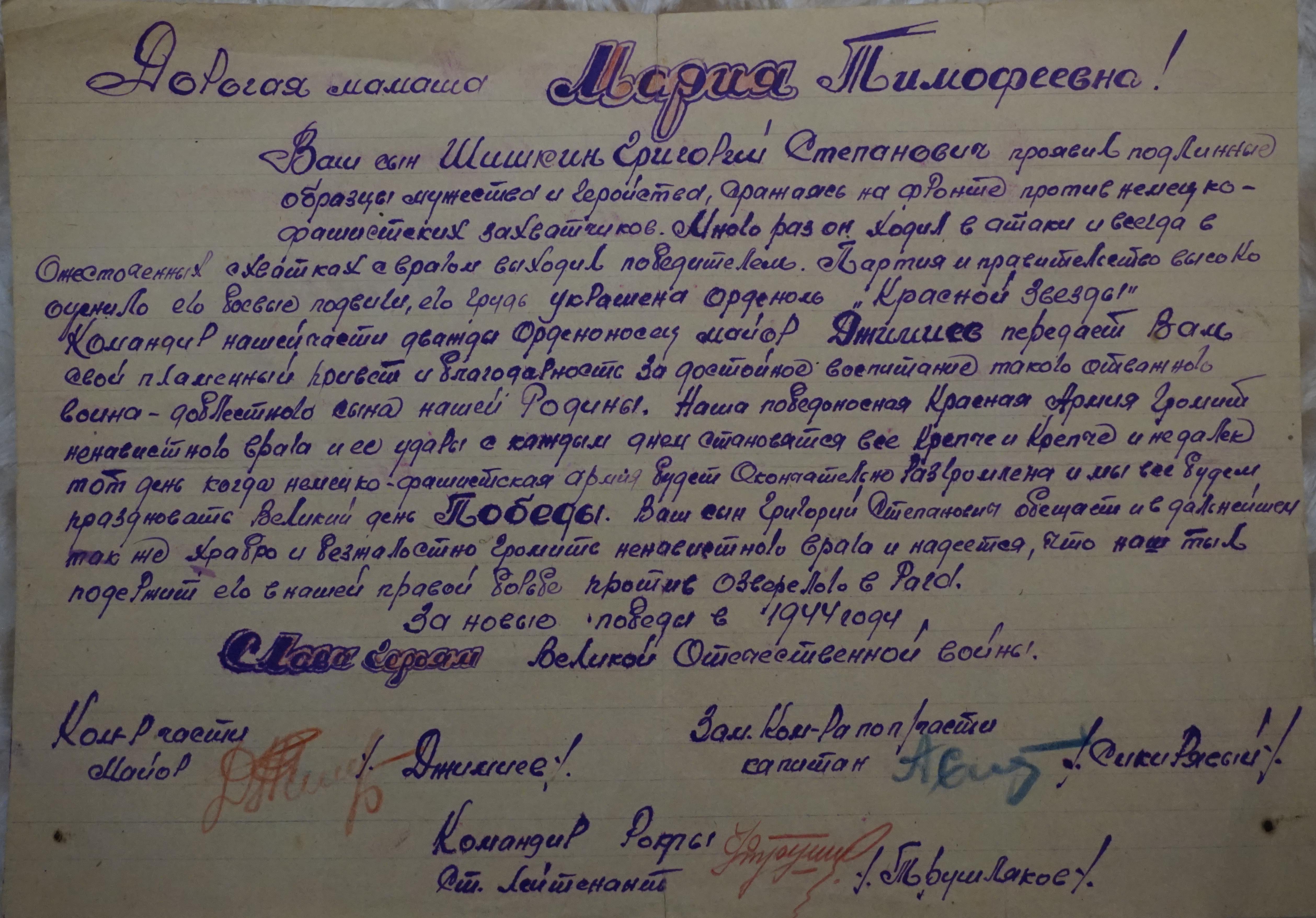 Письмо командования части, где воевал Григорий Степанович Шишкин, его матери. Шишкин Григорий Степанович родился 27 ноября 1924 года в селе Старая Криуша Воронежской области. До ВОВ учился в школе, был Комсомольским активистом. Сообщение о начале войны застало его когда он отдыхал у своих дедушки и бабушки. Заканчивает 10 - ый класс в 1942 году и был призван в Красную Армию. Попал в танковое училище, закончил его, получил танк с завода и был направлен в 1 - ый танковый батальон 118 - ой отдельной танковой бригады. Был командиром танка, комсоргом, а потом командиром танкового взвода. Сражался доблестно и храбро, о чём свидетельствуют четыре боевых ордена, но в бою 20 - го июля 1944 года получил тяжёлое ранение в руку. К сожалению, руку пришлось ампутировать, но Григорий Степанович не сдался - поступил и окончил Московский институт народного хозяйства им. Плеханова, работал, последняя должность - начальник отдела Государственного Комитета по ценам.