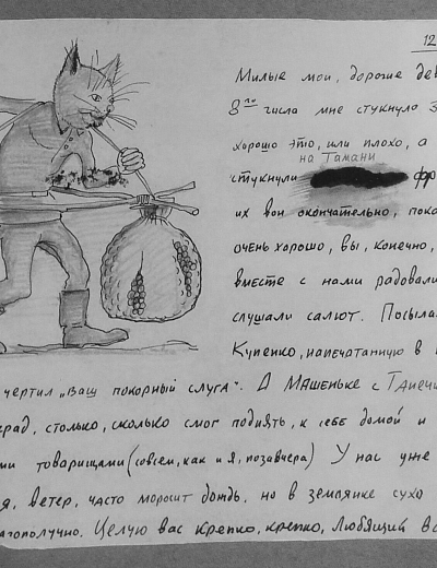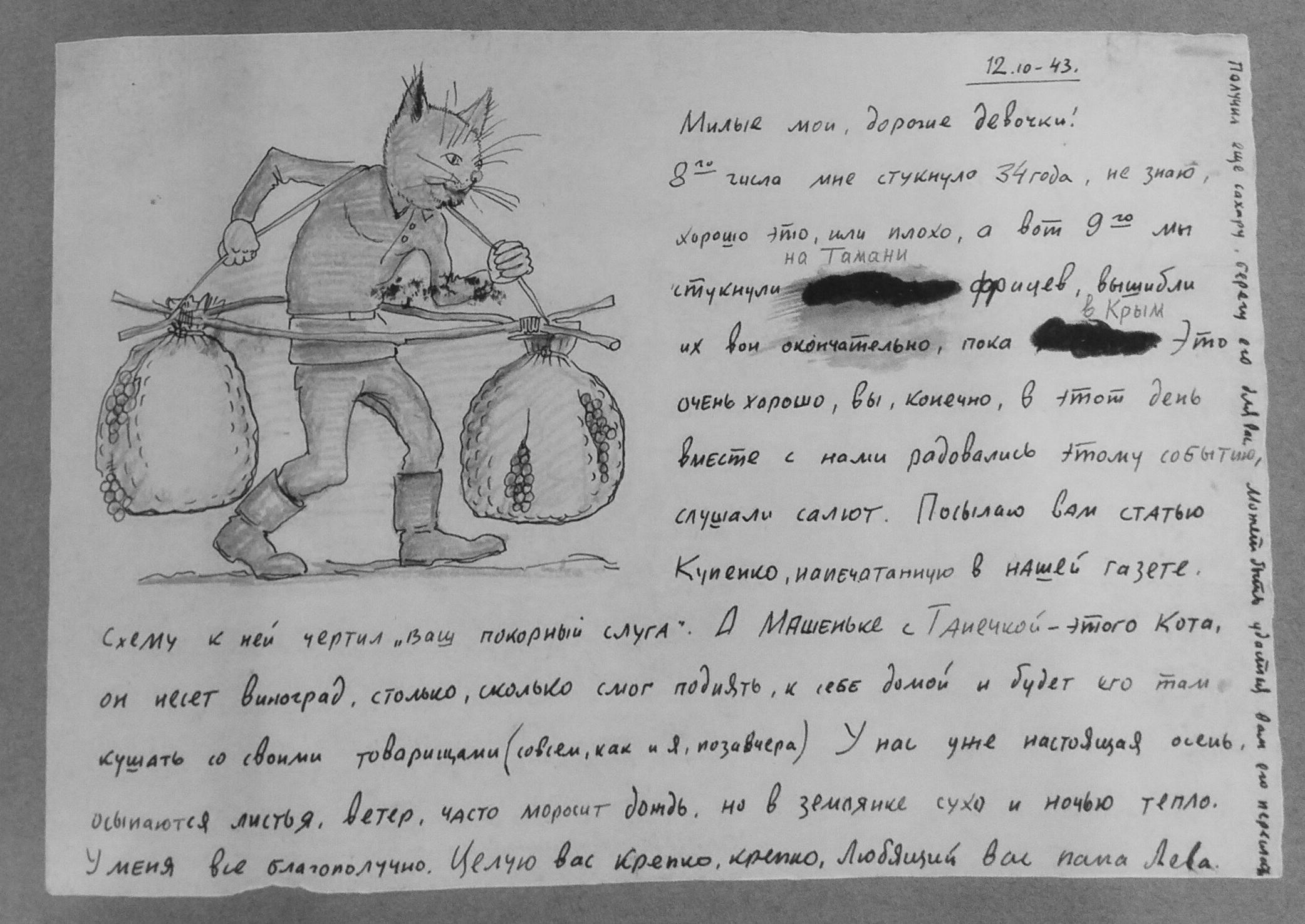 Лев Городский — известный художник-график, иллюстратор, шрифтовик во время Великой отечественной войны служил в штабе Южного фронта, развед-отделах Северо-Кавказского фронта, Отдельной Приморской армии, в Центральном управлении Генштаба Красной армии в должности картежника-картографа. Несмотря на тяжелейшие военные условия, он присылал письма своим маленьким дочкам. Письма не только полные любви, ласки, но еще и с утешающими рисунками, со сказочными зверушками, по-детски трогательными, мирными. Все они помещены в новой уникальной книге огромного формата «Л.Городский. Из писем с фронта домой.1943-1944».