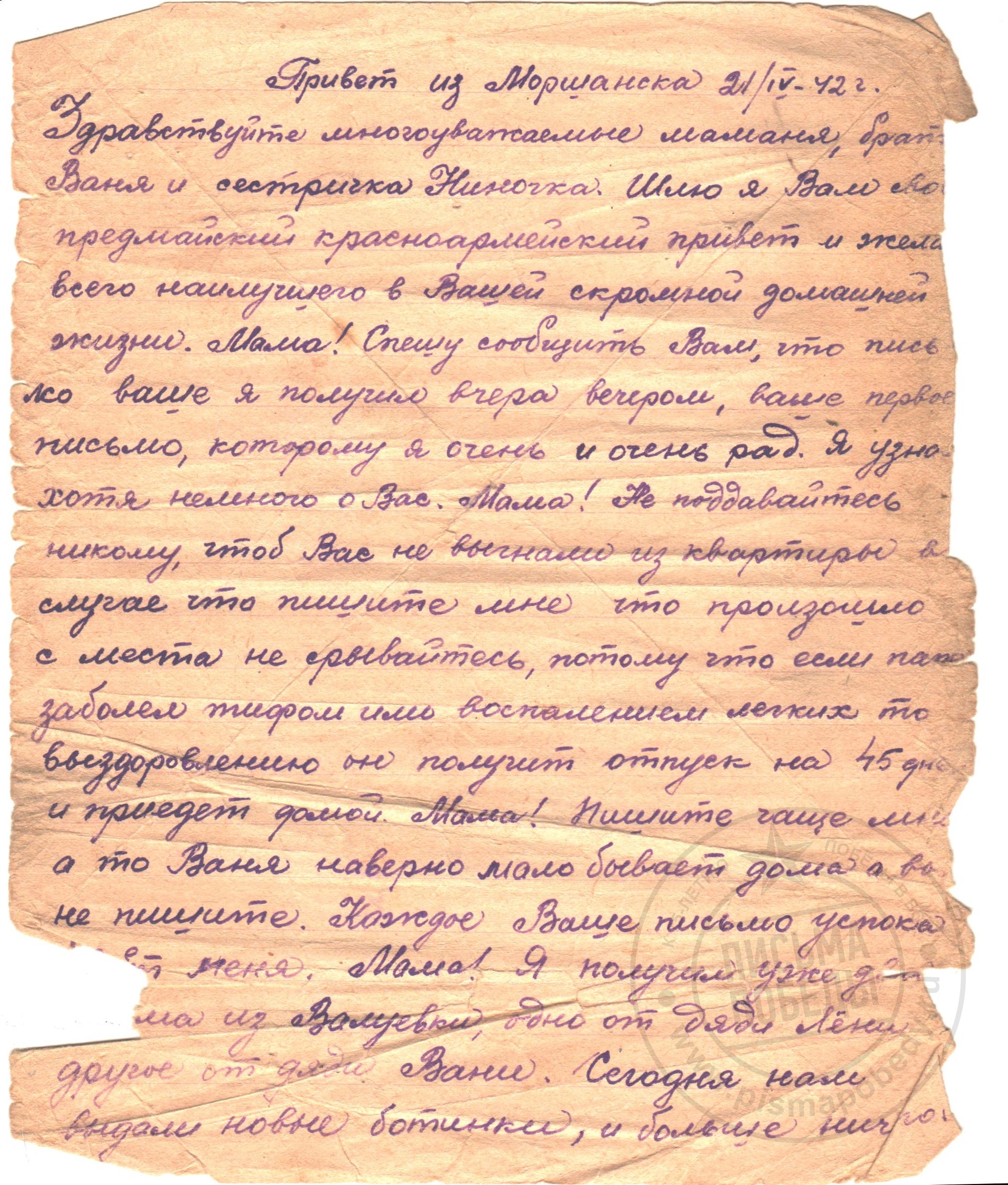 Письмо написано маме и родственникам. Семья В.И. Чижова проживала в Саратовской области, Красно-Кутский р-н, Карпенское п/о, с. Шендорф, мельница 136