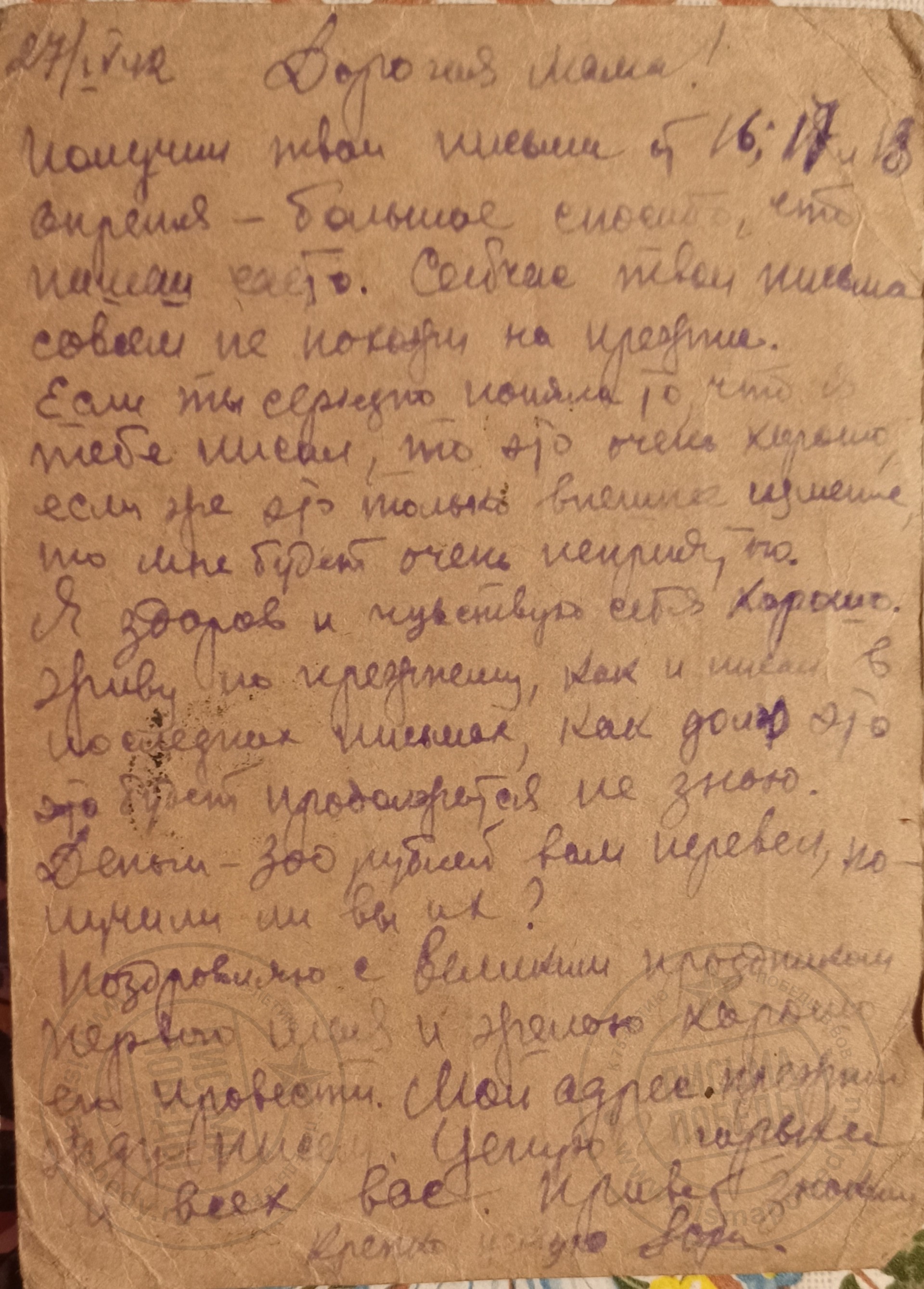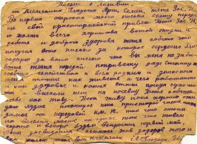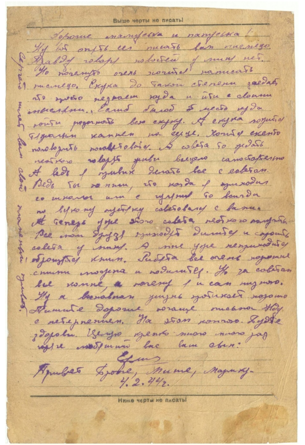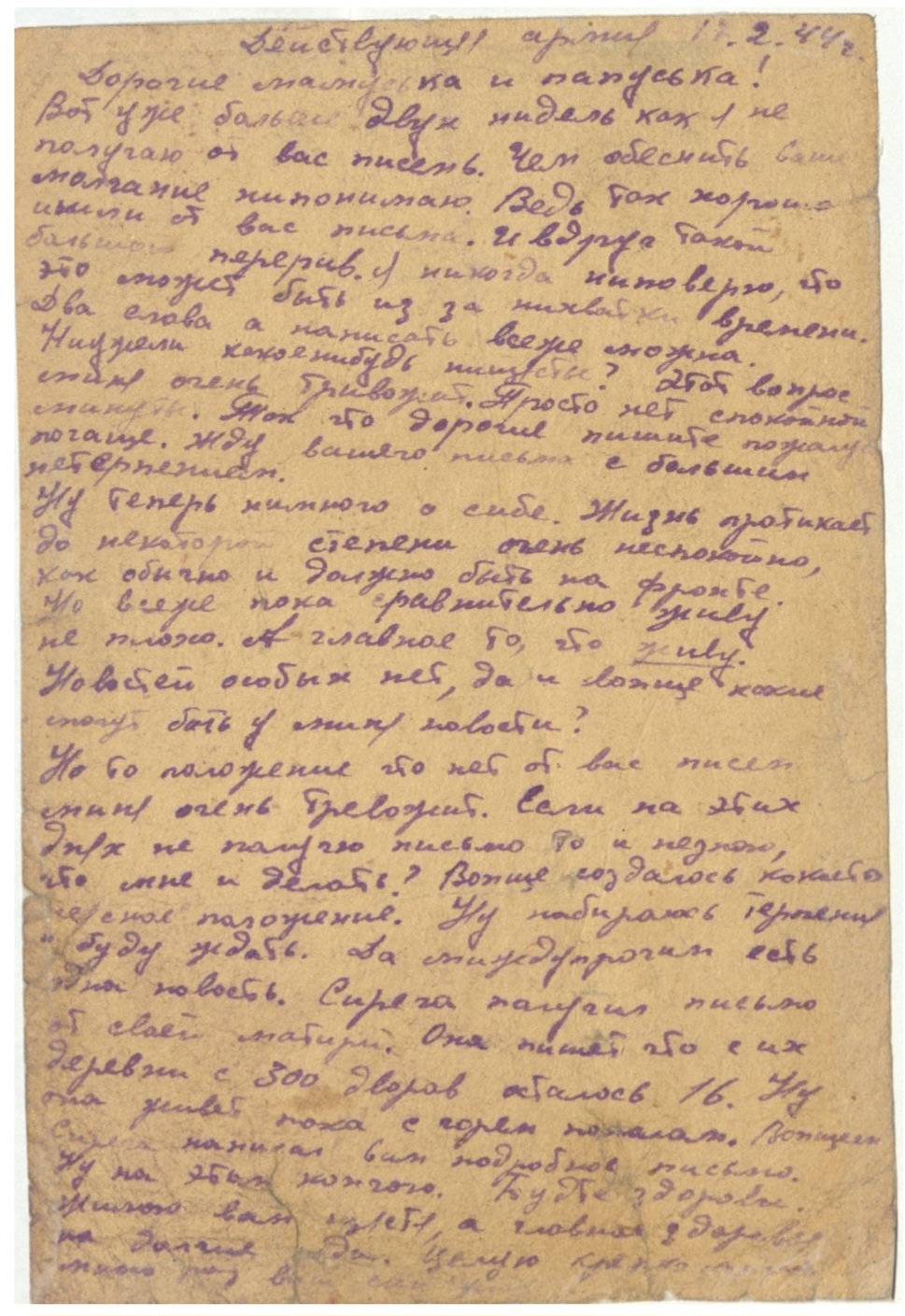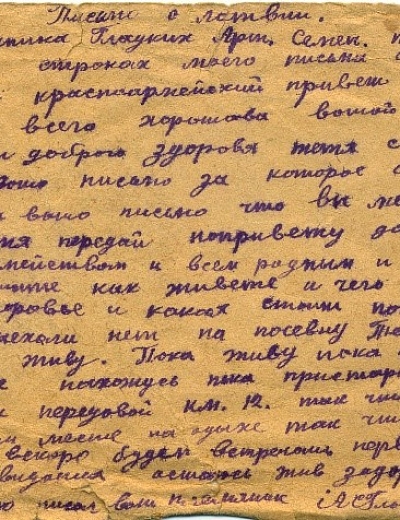 Родился в д. Смирнова Пышминского района Свердловской области. Призван в армию Пышминским райвоенкоматом 10 октября 1943 года. Значится в составе морского флота. После призыва сразу попал в 25 учебный строевой полк 35-ой стрелковой дивизии. Воинское звание – рядовой. Окончил службу 29 марта 1950 года. Награжден орденом Отечественной войны II степени, медалью «За победу над Германией в Великой Отечественной войне 1941-1945 гг.» Письмо написано своей тете Никоновой Зое Ивановне.
