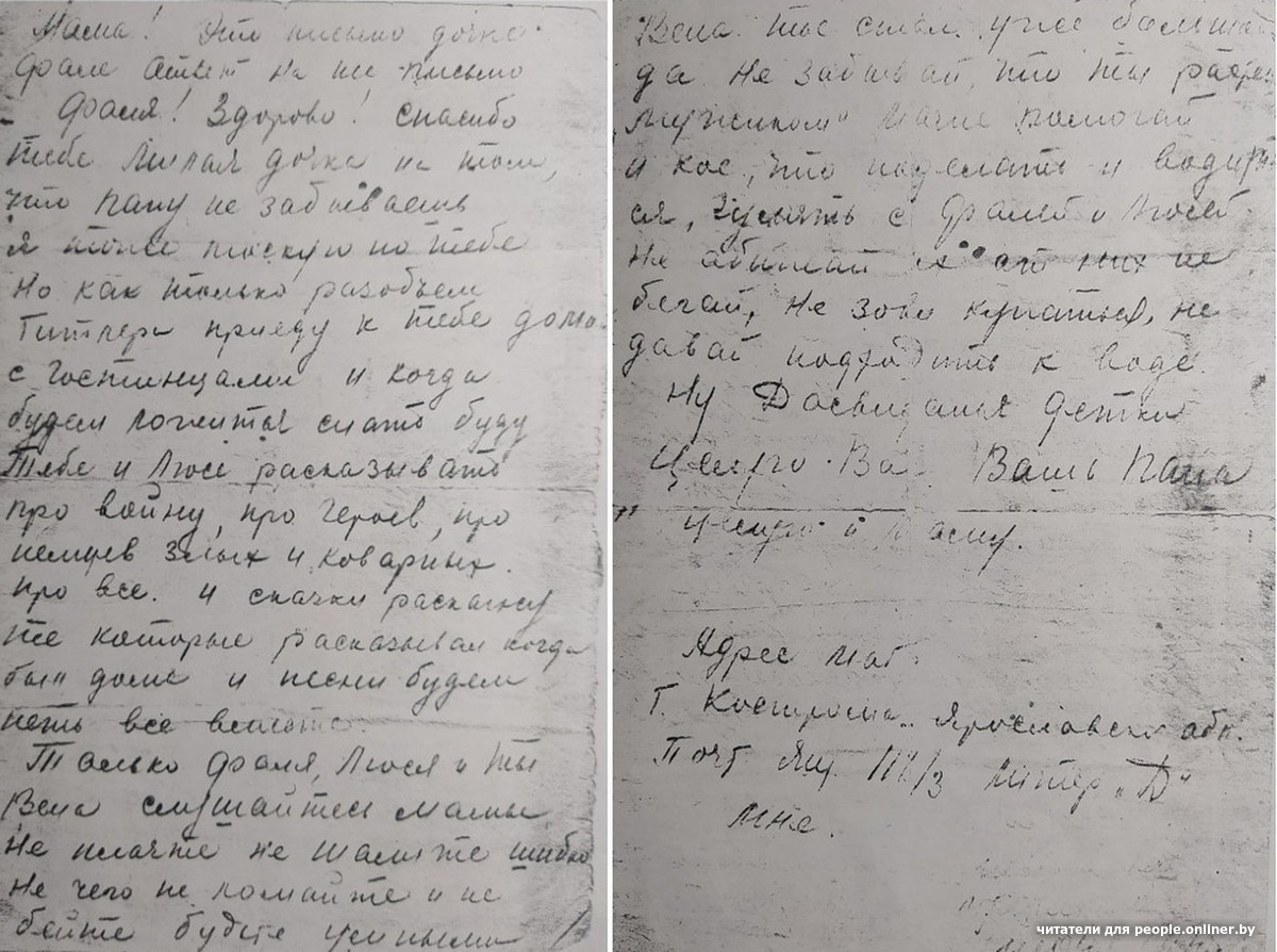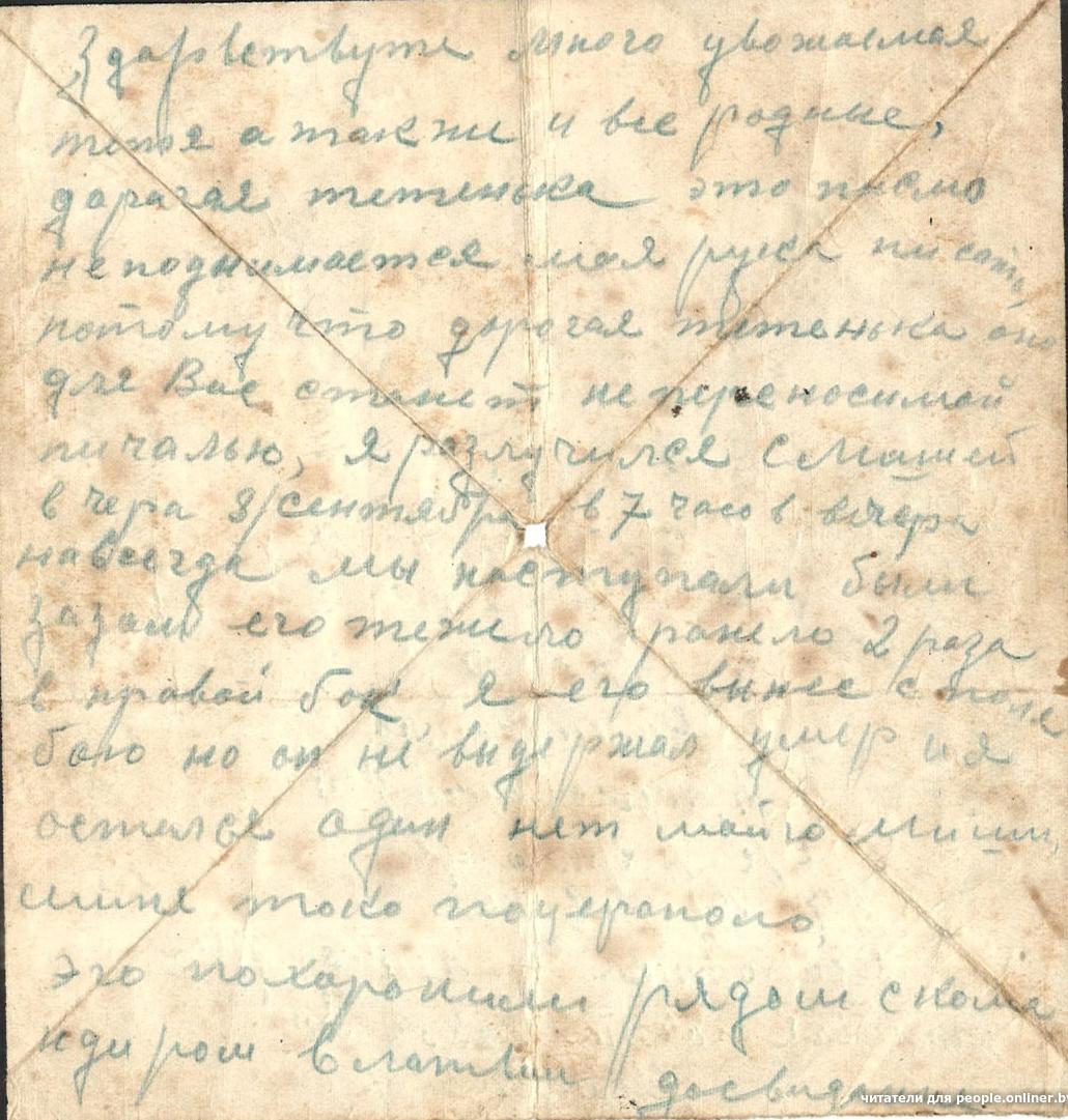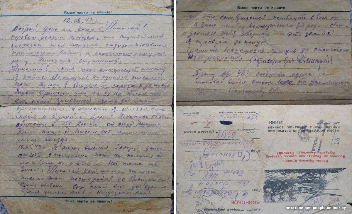 Единственное письмо с фронта от Петра Ивановича Орлова, это прадед нашего читателя Максима. Петр Орлов из деревни Починок Ивановской области (сейчас Россия). У него была семья: жена Анна, дочери Евфалия и Людмила и сын Венедикт.Вскоре после этого письма полк направили подо Ржев, где проходили страшные кровопролитные бои. Восьмого августа 1942 года Петр Иванович Орлов погиб. Его похоронили в деревне Подсосенье Ржевского района Калининской области, а потом перезахоронили в братской могиле в Тверской области, — рассказывает правнук. — Стихотворение Александра Твардовского «Я убит подо Ржевом» — это страницы его биографии.