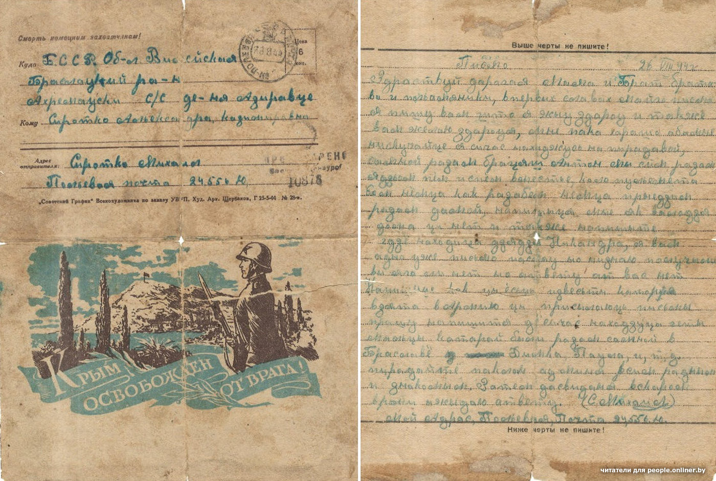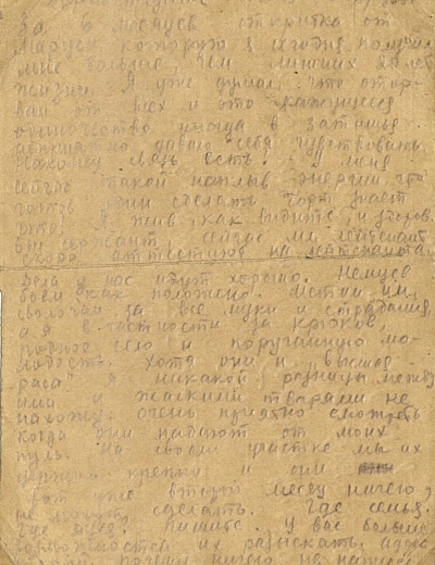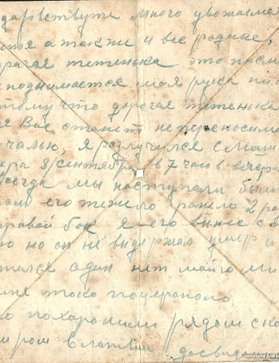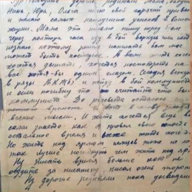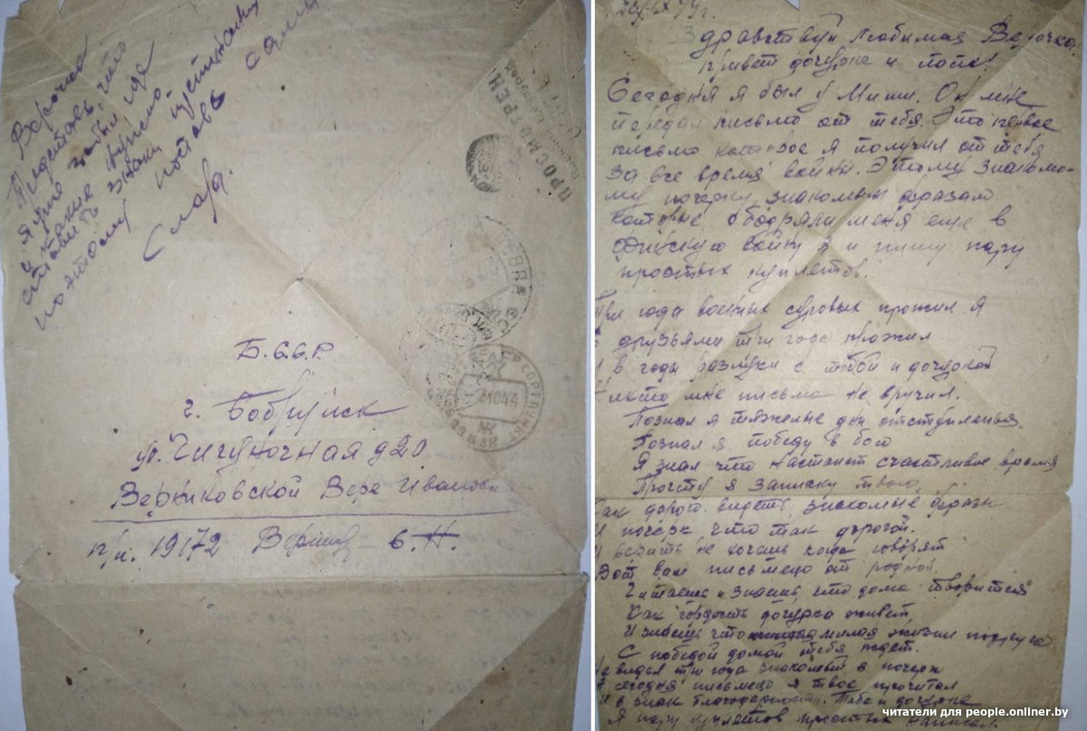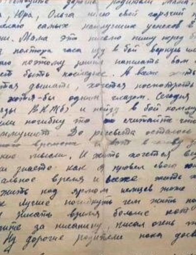Единственное письмо с фронта от Петра Ивановича Орлова, это прадед нашего читателя Максима. Петр Орлов из деревни Починок Ивановской области (сейчас Россия). У него была семья: жена Анна, дочери Евфалия и Людмила и сын Венедикт.Вскоре после этого письма полк направили подо Ржев, где проходили страшные кровопролитные бои. Восьмого августа 1942 года Петр Иванович Орлов погиб. Его похоронили в деревне Подсосенье Ржевского района Калининской области, а потом перезахоронили в братской могиле в Тверской области, — рассказывает правнук. — Стихотворение Александра Твардовского «Я убит подо Ржевом» — это страницы его биографии.