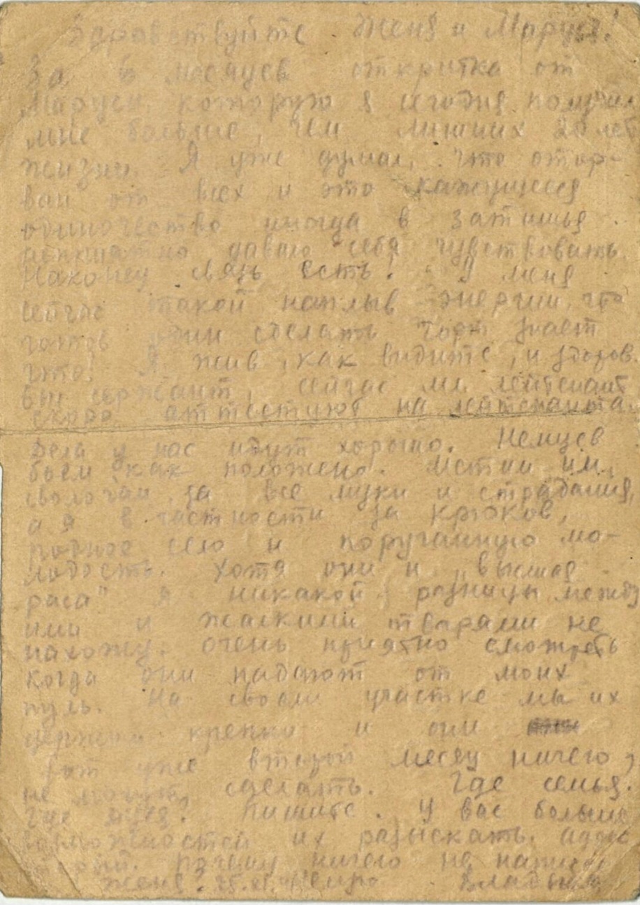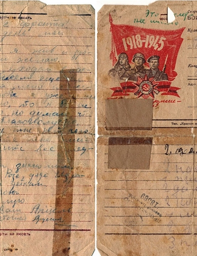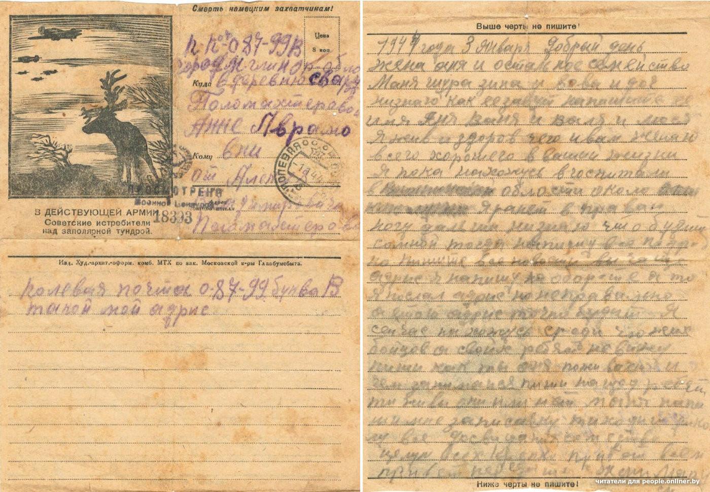 Писал домой из госпиталя и Алексей Поломахтеров, это было в январе 1944-го. Его письма и открытки жене и родителям полевая почта доставляла в Брянскую область (сейчас Россия).Рассказывал, что ранен в правую ногу. Писал, в каком госпитале находится, но эта информация вымарана. Вероятно, это сделал цензор, который читал письмо перед отправлением. На посланиях Алексея, как и на многих других, проставлена печать «Просмотрено военной цензурой».Спустя неделю он снова с тревогой писал домой:Выписался из госпиталя мужчина ближе к концу января.1944 года 24 января, письмо на родину.