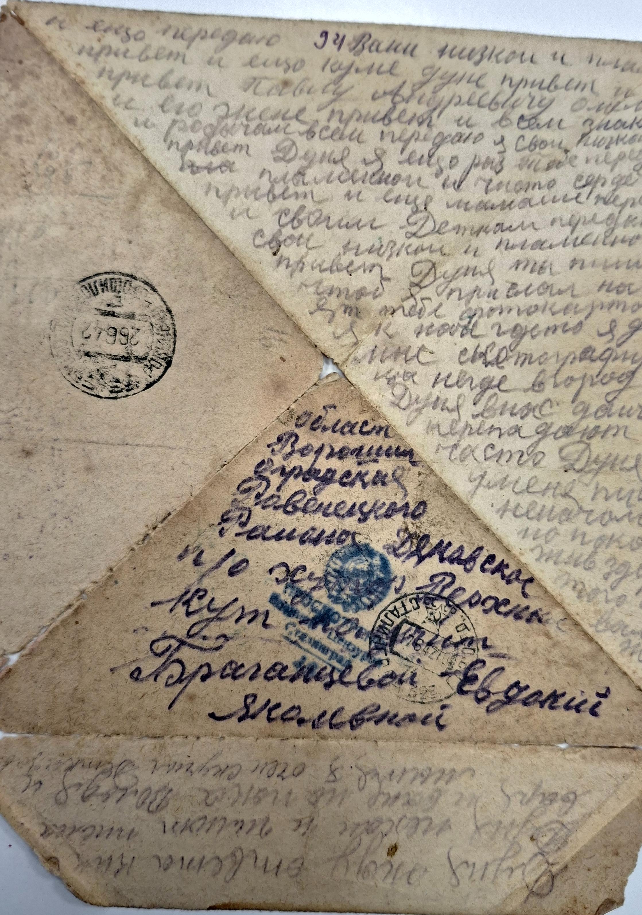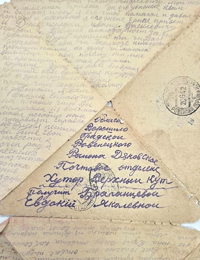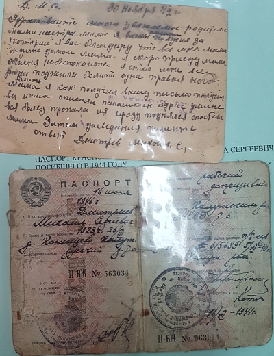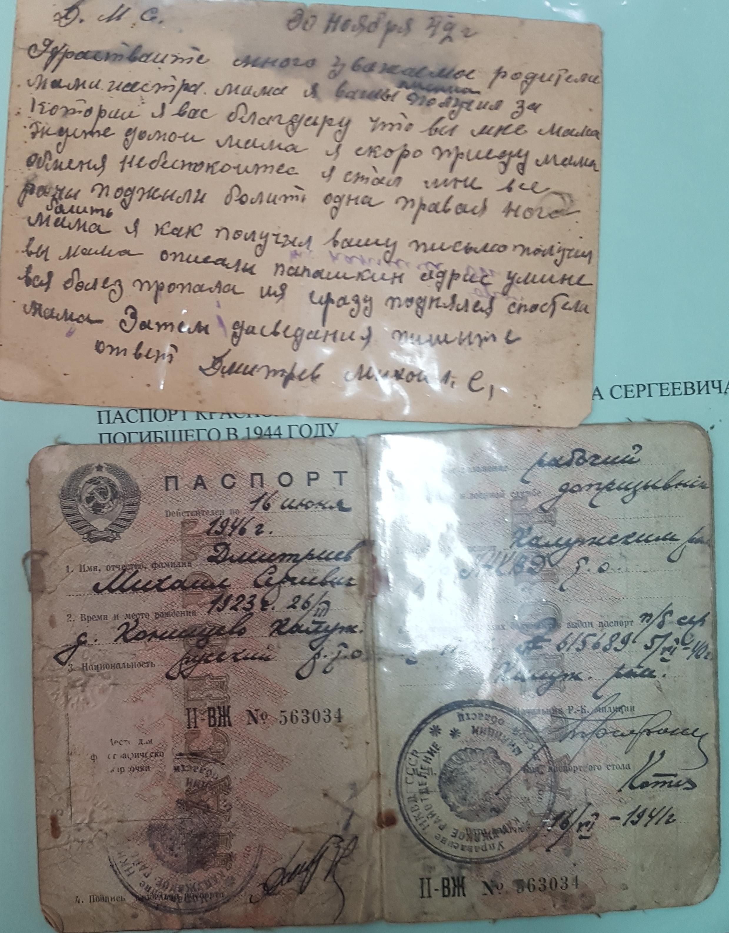 Фронтовые письма 18-летнего красноармейца Михаила Дмитриева, сына Героя Сергея Дмитриева, чье имя носит одна из улиц деревни Канищево. Сергей Дмитриевич родился на этой улице в 1889 году. В школе работала учителем математики его правнучка. Она и передала в музей фронтовые письма.