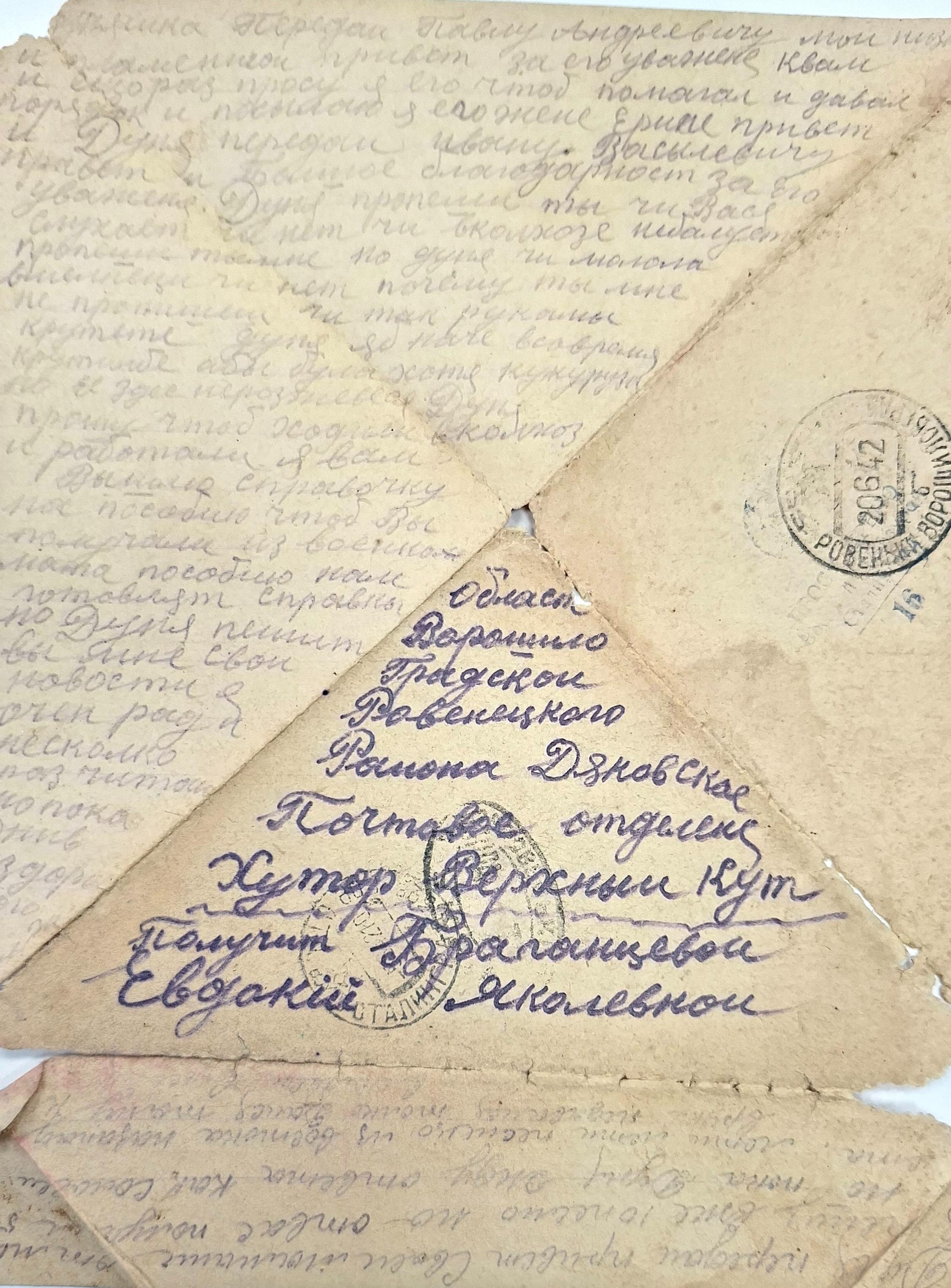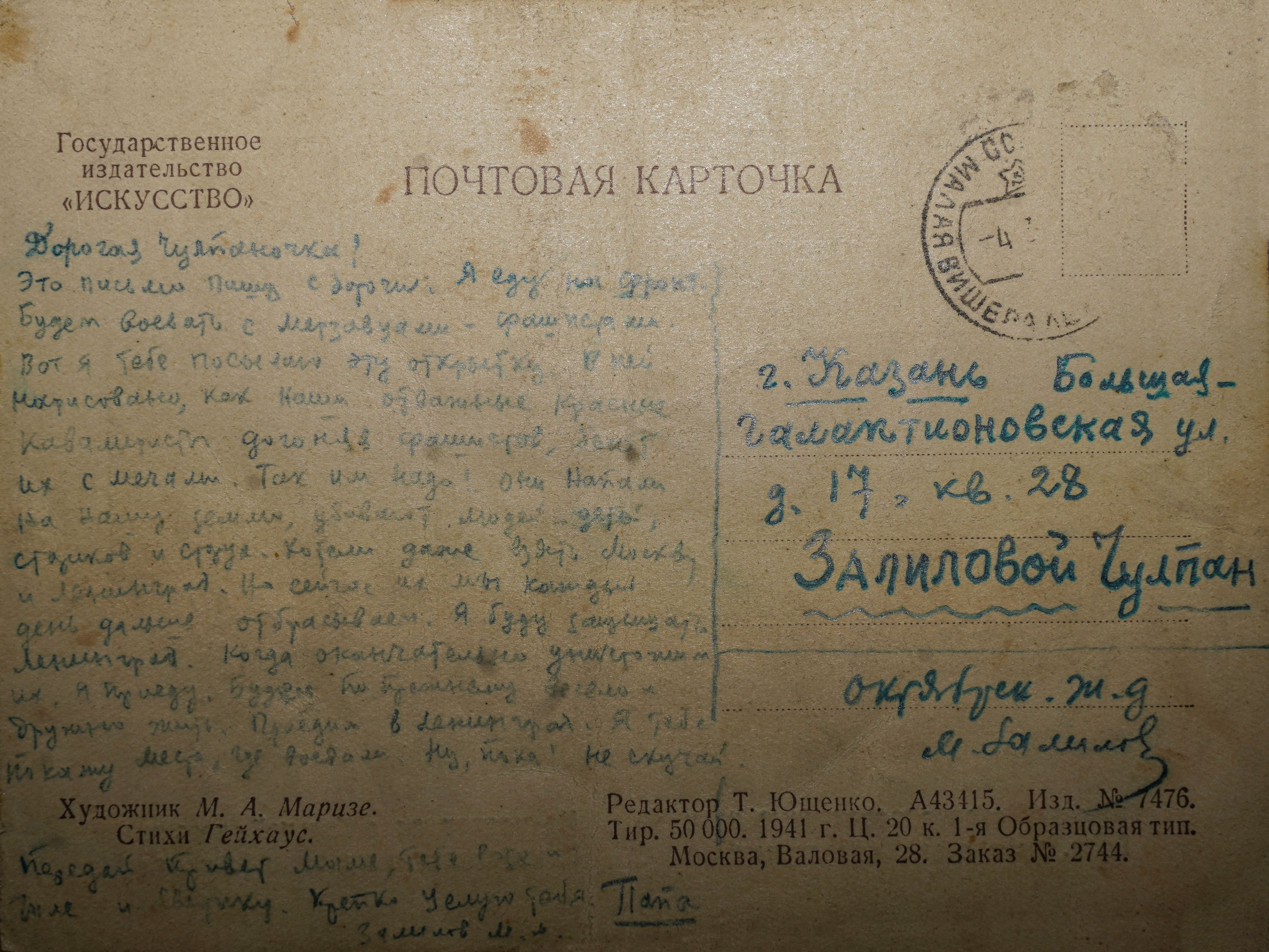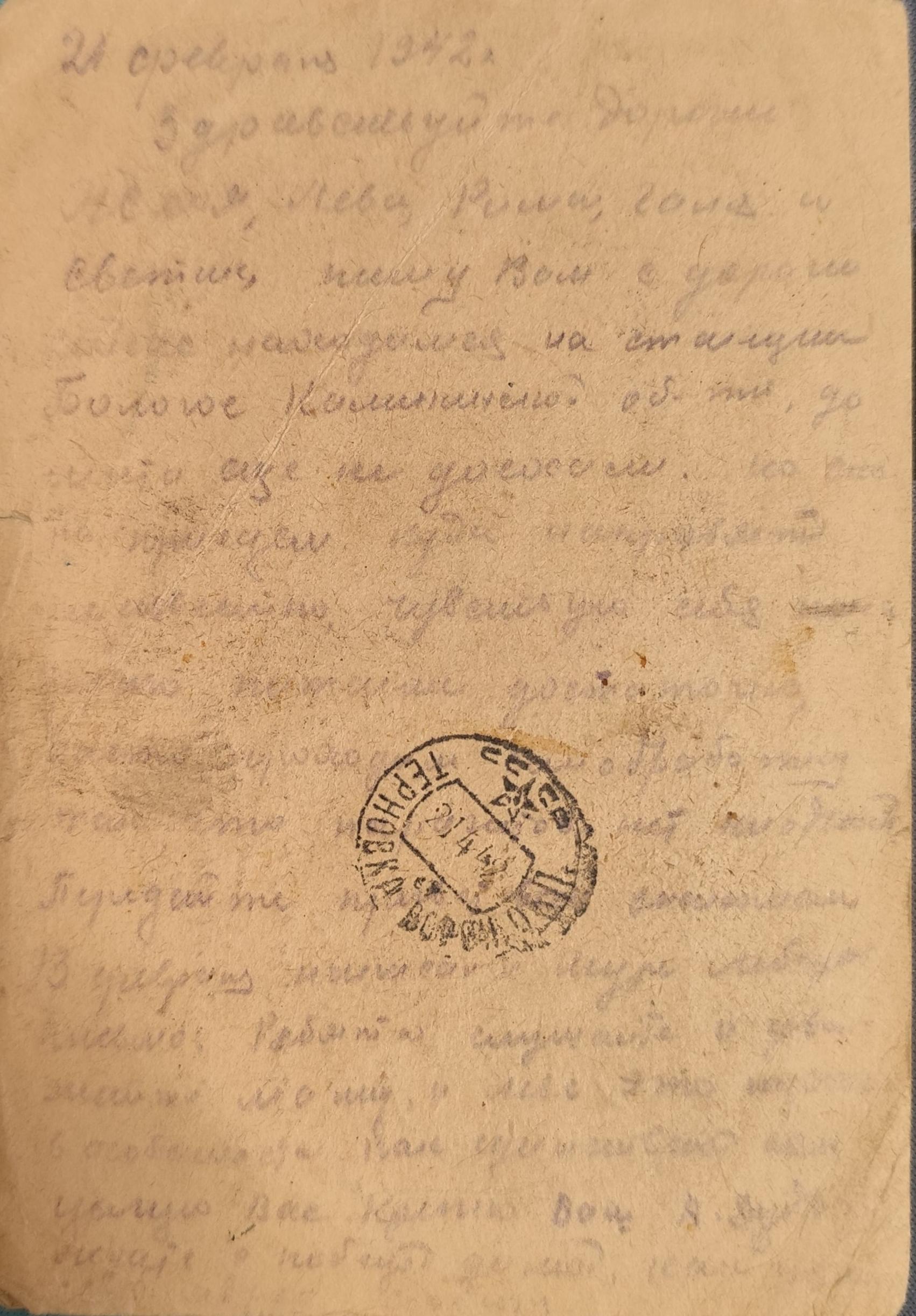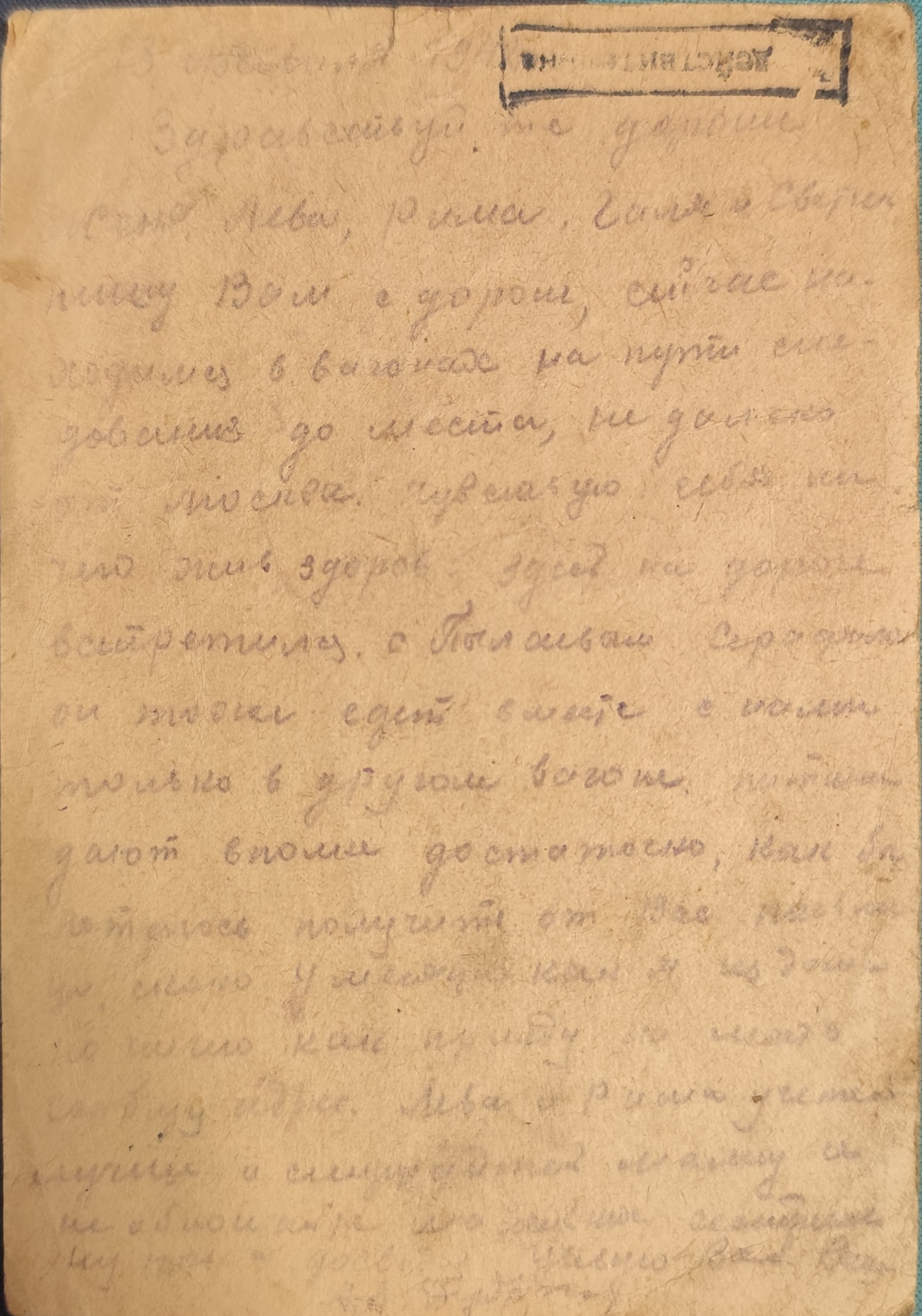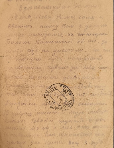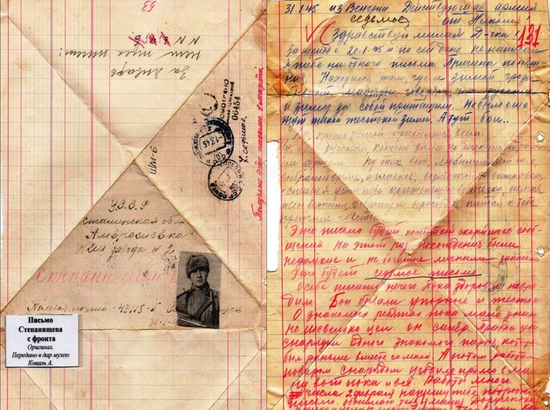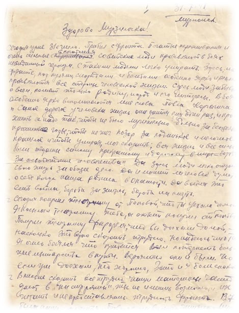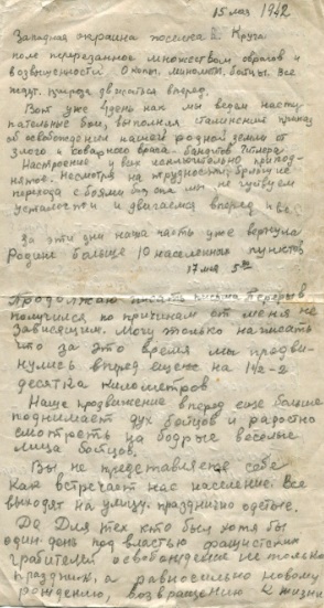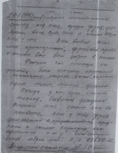 В музее «Десант памяти. Лиговский рубеж» ГБОУ школы № 217 хранятся 7 писем - все они написаны одной рукой - рукой младшего политрука 699 стрелкового полка 393 стрелковой дивизии – Иткина Бориса Ильича. Эти письма принесла в музей Прийменко Елена Валерьевна. Письма деда. Семейная реликвия. Себе Елена Валерьевна оставила только одно - последнее, написанное в 1942 году. На всех письмах одинаковый адрес: город Мичуринск, улица Социалистическая дом 51, Иткиной Нине Ивановне, и обратный адрес полевой почты -1415. Два письма имеют удовлетворительную сохранность. Они написаны на обычных тетрадных листах в широкую полоску чернилами фиолетового цвета. Эти письма писались в штабе, во время передышки между боями. Три письма написаны в 1941 году, четыре датированы 1942 годом, эти письма выглядят иначе и имеют лучшую сохранность, они написаны химическим карандашом и хорошо читаемы. А седьмое письмо — это исписанный убористым почерком листочек из блокнота, размером 20 см х 14 см нелинованный, с неровным верхним краем. В каждой строчке этих писем видна любовь Бориса к своим родным, близким людям, к родному городу, в котором вырос, к Родине, которая находится в опасности и ждет победы над врагом. В мае 1942 года начались отчаянные попытки частей Красной Армии вырваться из окружения. Выжившие солдаты Красной Армии оказались заперты на небольшом пространстве площадью примерно 15 квадратных километров в районе Барвенково. Попытки прорвать окружение с востока блокировались упорной обороной немцев при активной поддержке авиации. И даже в такой обстановке, когда на подступах к Харькову шли ожесточённые бои и РККА несла безвозвратные потери, Борис не терял присутствие духа. Его последнее письмо написано 15 мая 1942 года.