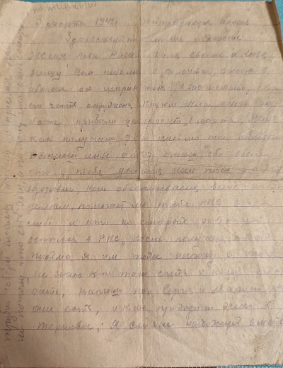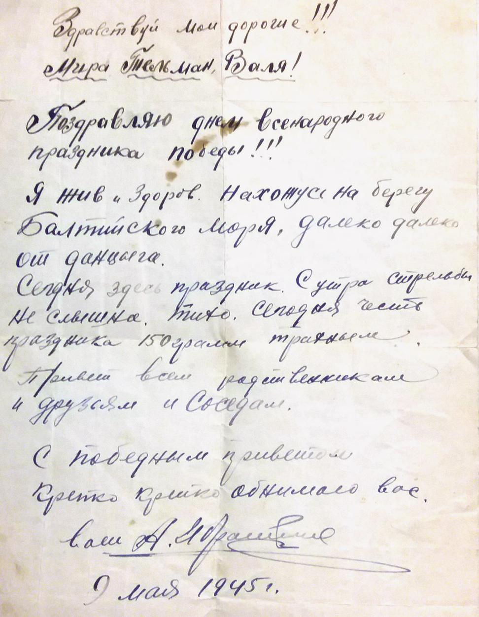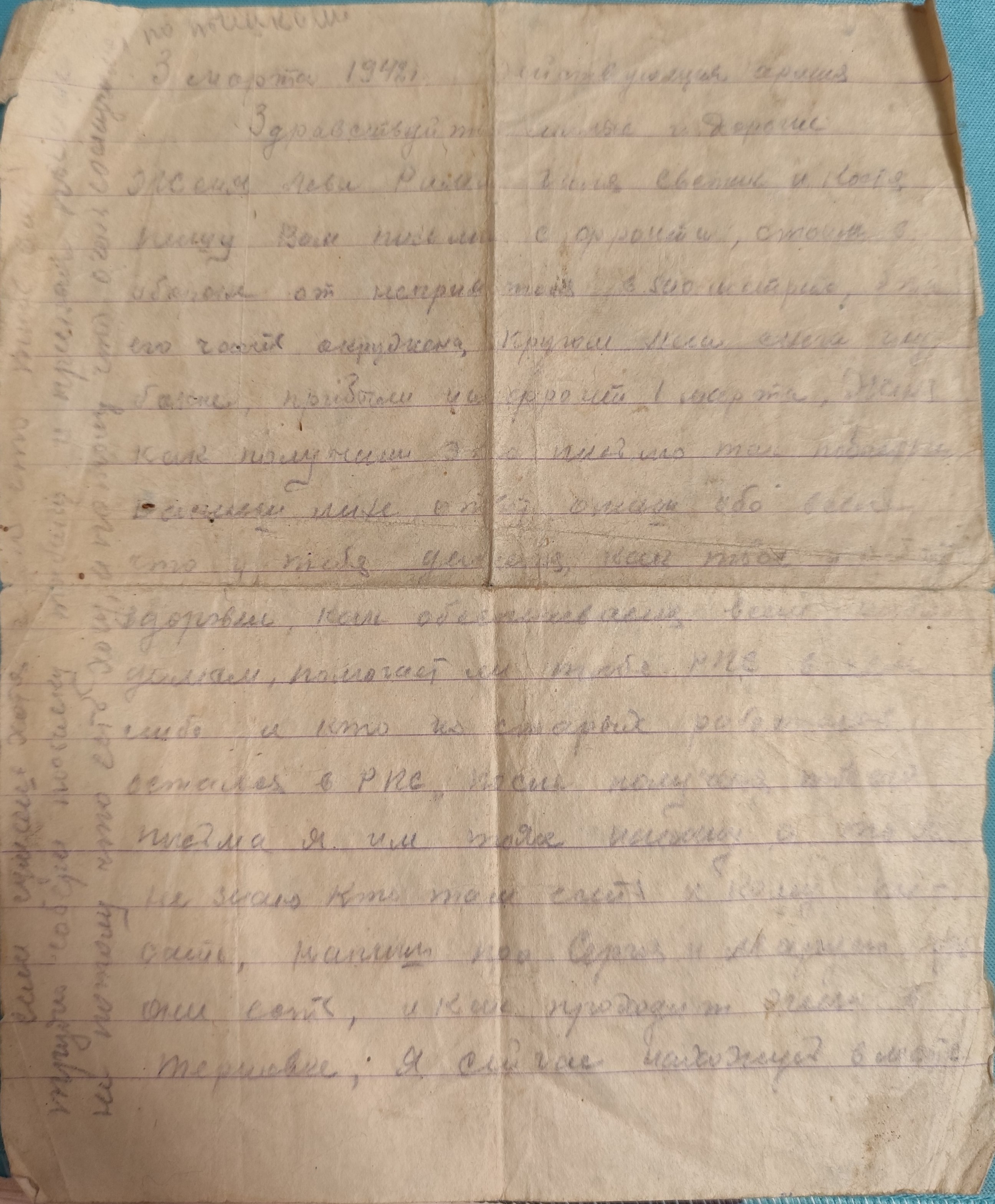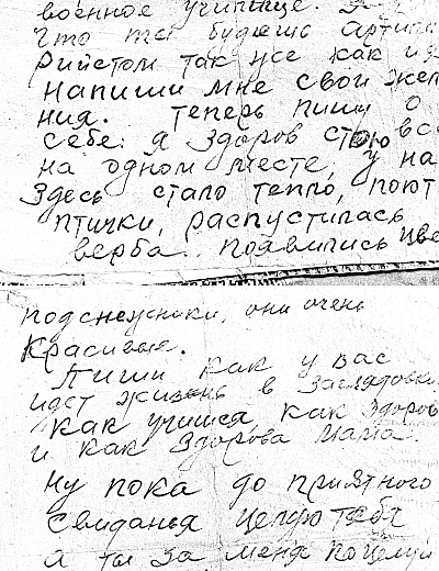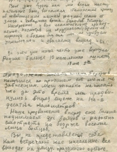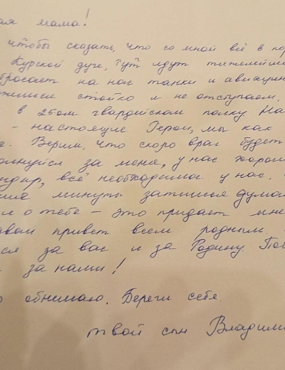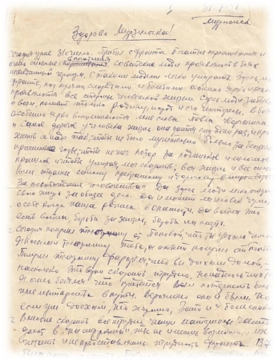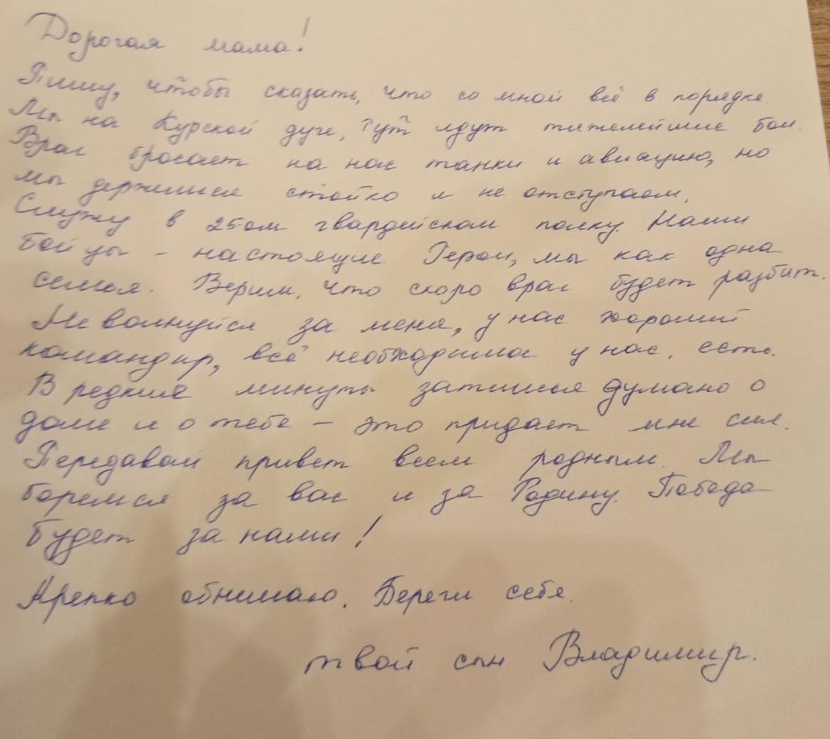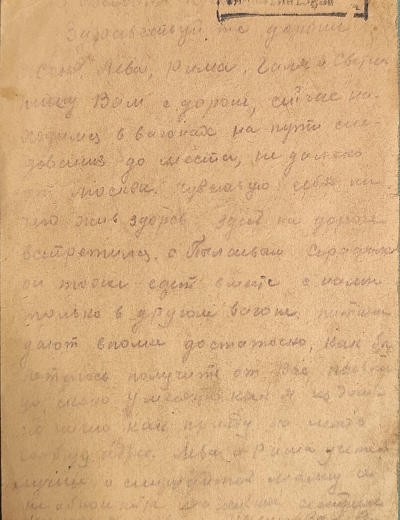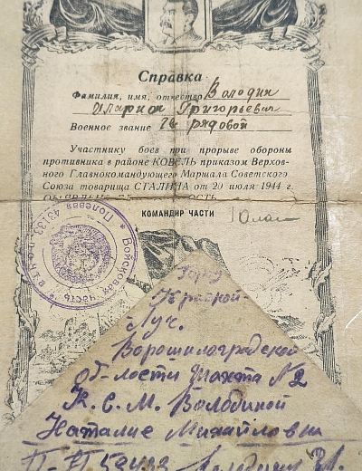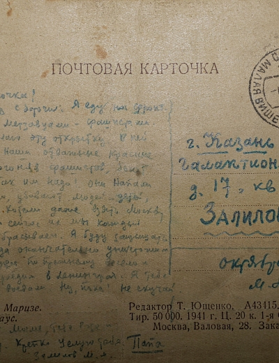 В музее «Десант памяти. Лиговский рубеж» ГБОУ школы № 217 хранятся 7 писем - все они написаны одной рукой - рукой младшего политрука 699 стрелкового полка 393 стрелковой дивизии – Иткина Бориса Ильича. Эти письма принесла в музей Прийменко Елена Валерьевна. Письма деда. Семейная реликвия. Себе Елена Валерьевна оставила только одно - последнее, написанное в 1942 году. На всех письмах одинаковый адрес: город Мичуринск, улица Социалистическая дом 51, Иткиной Нине Ивановне, и обратный адрес полевой почты -1415. Два письма имеют удовлетворительную сохранность. Они написаны на обычных тетрадных листах в широкую полоску чернилами фиолетового цвета. Эти письма писались в штабе, во время передышки между боями. Три письма написаны в 1941 году, четыре датированы 1942 годом, эти письма выглядят иначе и имеют лучшую сохранность, они написаны химическим карандашом и хорошо читаемы. А седьмое письмо — это исписанный убористым почерком листочек из блокнота, размером 20 см х 14 см нелинованный, с неровным верхним краем. В каждой строчке этих писем видна любовь Бориса к своим родным, близким людям, к родному городу, в котором вырос, к Родине, которая находится в опасности и ждет победы над врагом. В мае 1942 года начались отчаянные попытки частей Красной Армии вырваться из окружения. Выжившие солдаты Красной Армии оказались заперты на небольшом пространстве площадью примерно 15 квадратных километров в районе Барвенково. Попытки прорвать окружение с востока блокировались упорной обороной немцев при активной поддержке авиации. И даже в такой обстановке, когда на подступах к Харькову шли ожесточённые бои и РККА несла безвозвратные потери, Борис не терял присутствие духа. Его последнее письмо написано 15 мая 1942 года.