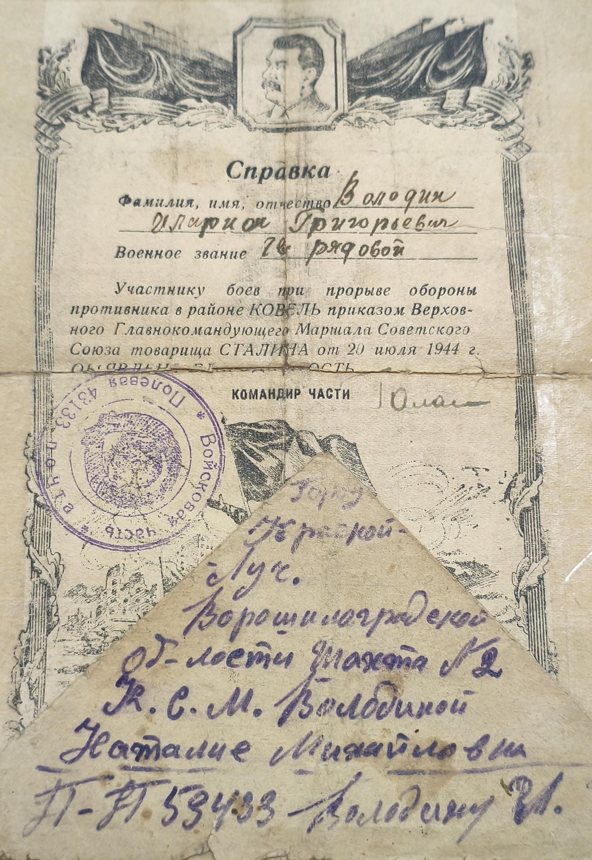 В 1944 году, при прорыве обороны противника в районе Ковель, приказом Верховного Главнокомандующего Маршала Советского Союза товарища Сталина от 20 июля 1944 года объявлена благодарность.