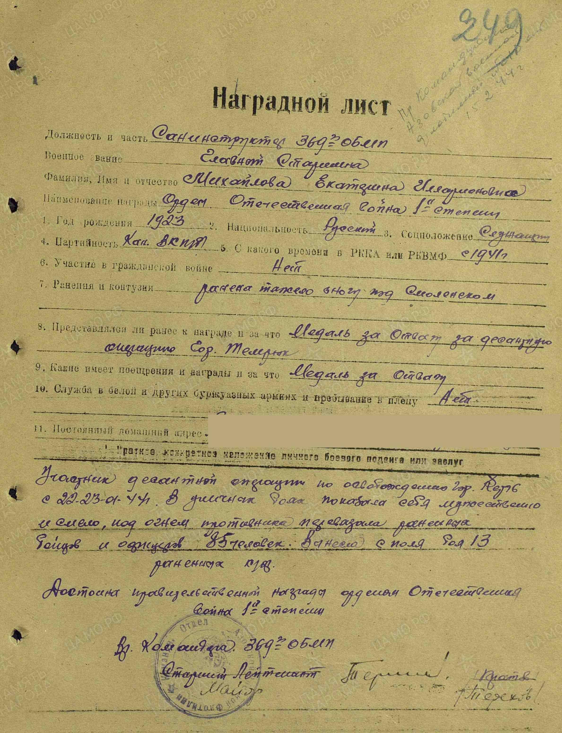 Её первая кампания – оборонительные бои под Ельней и Гжатском. В одном из боёв рядом разорвался снаряд. Ударная волна отбросила девчонку о дерево. Перелом ноги в трёх местах. На реабилитацию направили в Баку, где в январе 1942 года её зачислили на военно-санитарное судно «Красная Москва», позже – «Дагестан» и «Туркменистан». В начале 1943-го, когда «Туркменистан» стал на ремонт в Баку, она услышала о наборе в 369-й отдельный батальон морской пехоты. В феврале 1943 года Екатерину Михайлову приняли санинструктором в 369-й ОБМП Азовской флотилии. Батальон сражался под Мариуполем, Таганрогом, Темрюком. 19 сентября 1943 года Азовская флотилия получила задачу сорвать эвакуацию противника с Тамани. Высадка у Темрюка обошлась дорогой ценой, но своё она сделала: под шквальным огнём Екатерина Илларионовна оказала помощь семнадцати раненым и вывела их с оружием. Была награждена медалью «За отвагу».