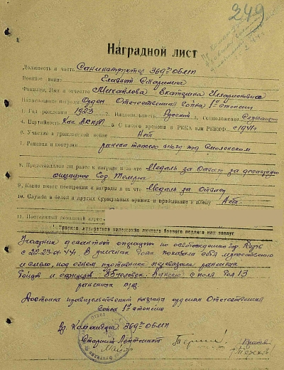 В январе 1944 года она участвовала в десанте в Керченском порту. По итогам боёв оказала помощь восьмидесяти пяти раненым и лично вынесла тринадцать тяжёлых. Её наградили орденом Отечественной войны II степени.