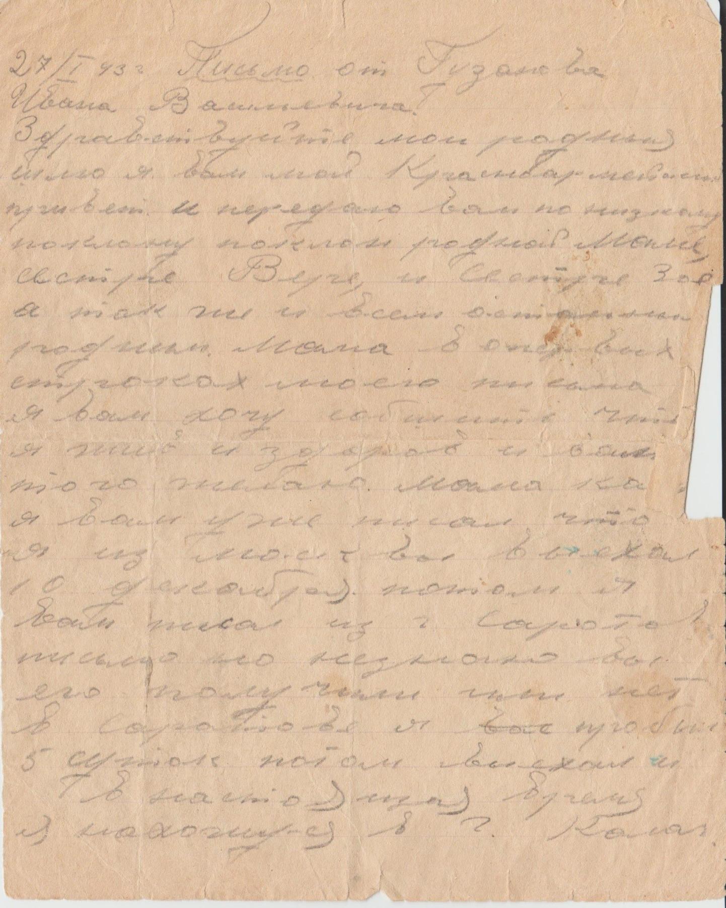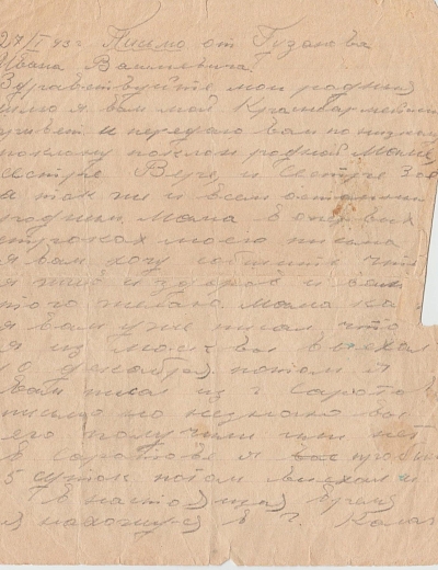 Фотографии он всё же успел послать домой. На одной из них Иван Васильевич Гузанов в форме красноармейца, молодой, красивый, ему был всего 21 год. Таким он остался для нас навсегда. 5 января 1943 года он пишет короткое письмо домой. Он ещё жив и здоров, но предупреждает, что при выполнении особого задания с ним может быть всякое, чтобы родные ждали письма. В последнем своём письме Иван подробно описывает свою жизнь, рассказывает, что у него есть хороший товарищ, с которым они живут как родные братья10. К сожалению, письмо очень плохо сохранилось.