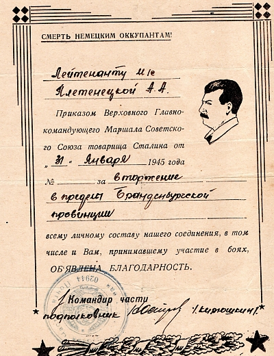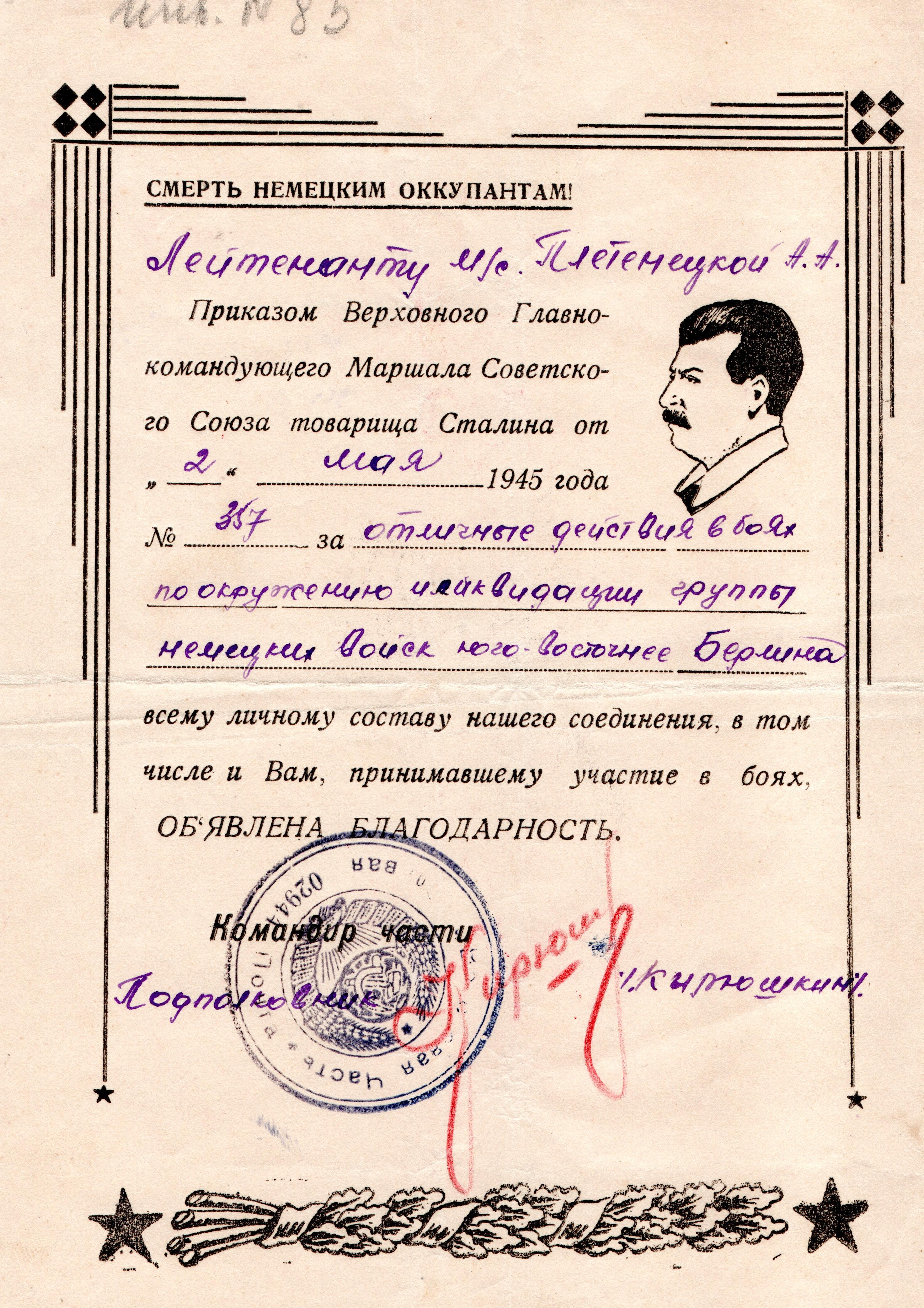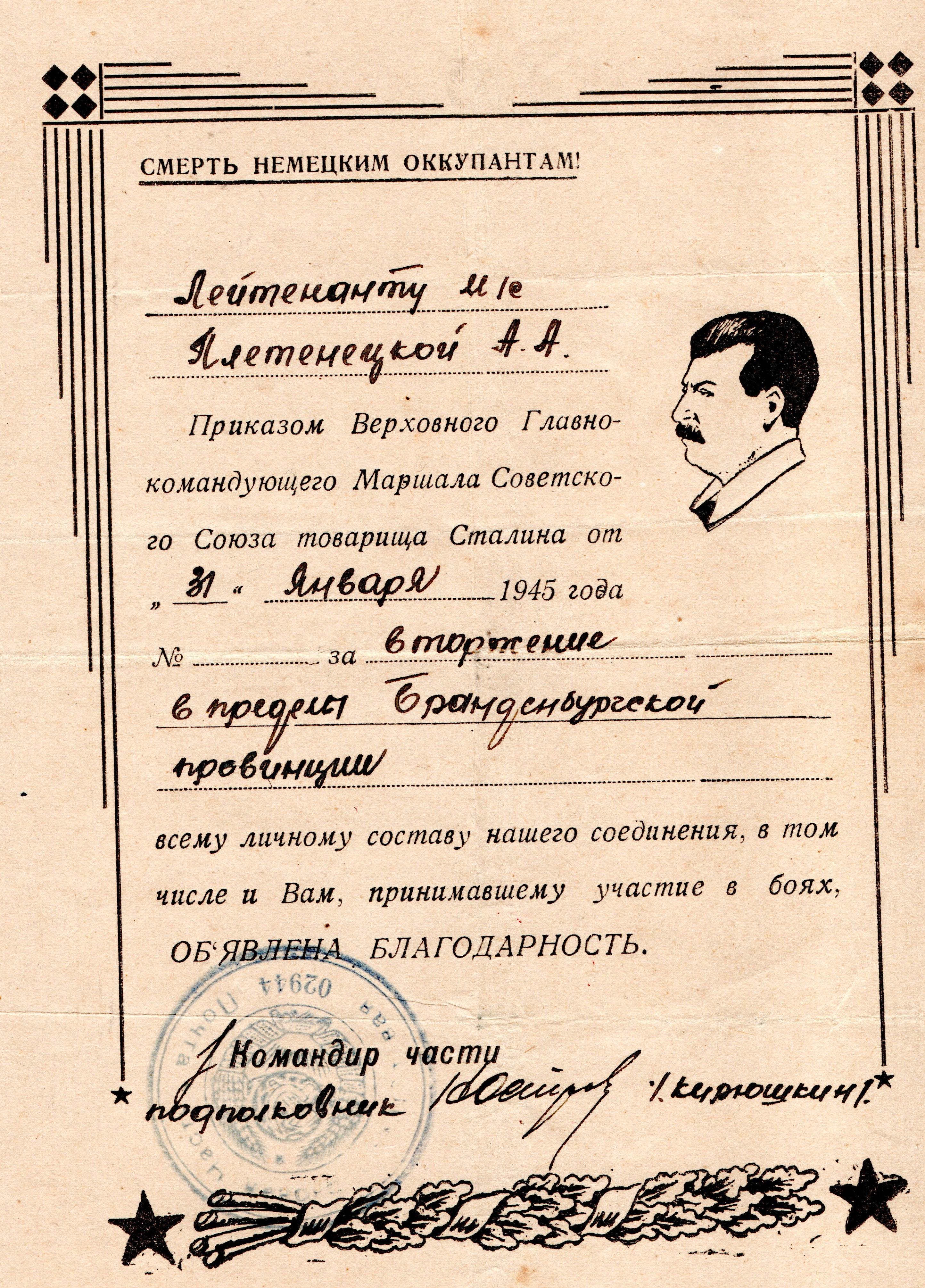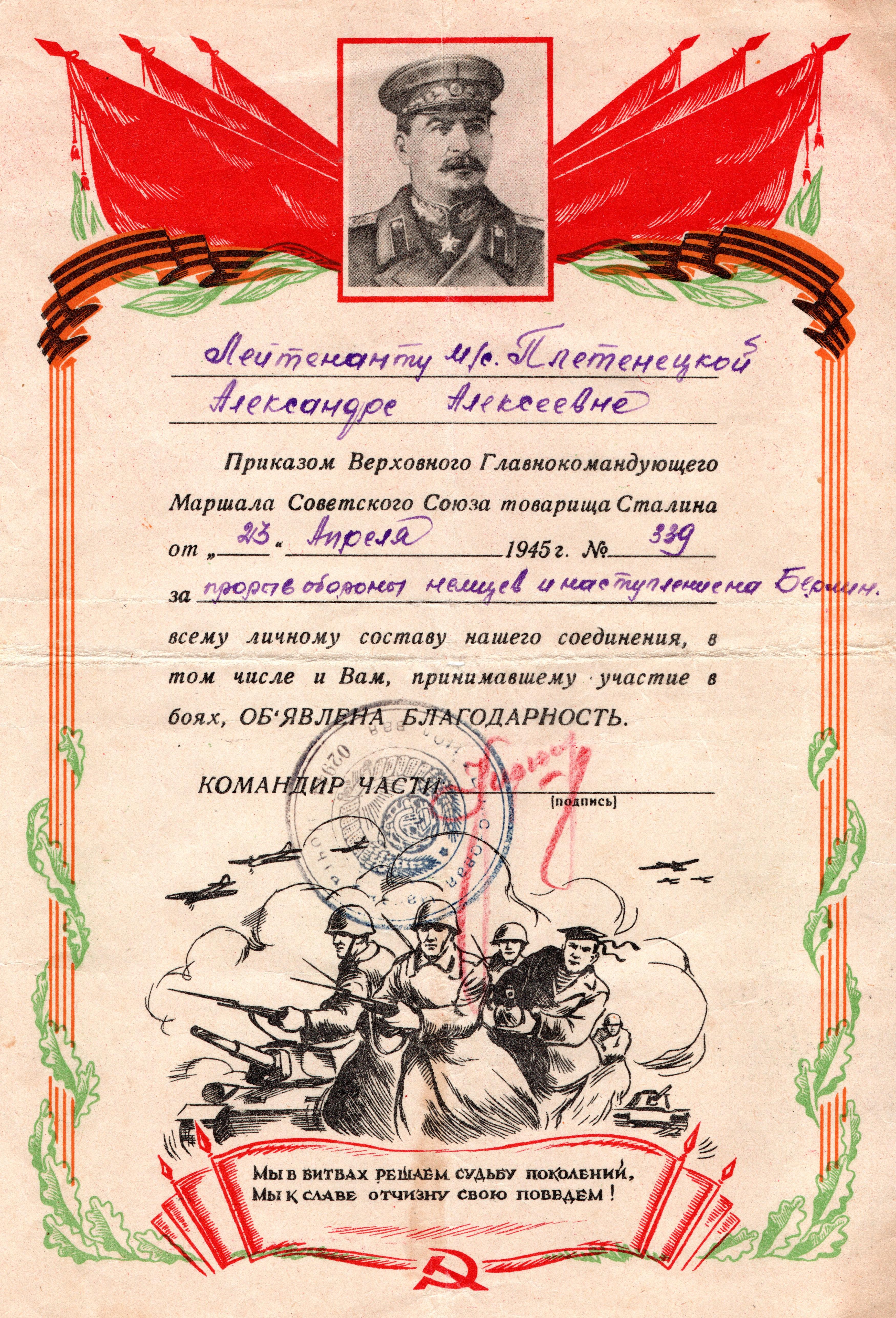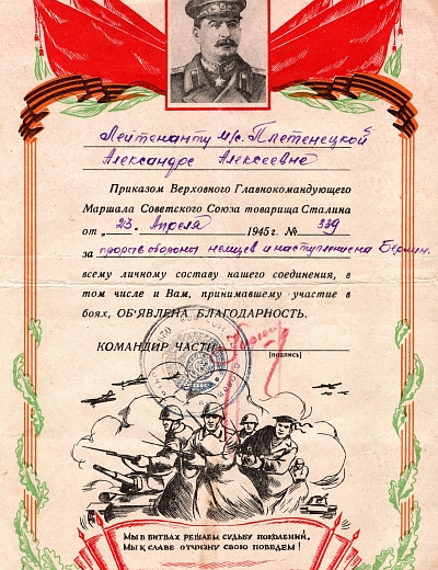 Лейтенант медицинской службы Плетенецкая Александра Алексеевна родилась в Курганской области, г. Грайворон. 26.04.1044 года призвана на воинскую службу Севастопольским ГАК, Крымской АССР. Место службы: 1133 и 1135 стрелковые полки 339 стрелковой дивизии; 892 артиллерийский полк 323 стрелковой дивизии. За время службы награждена медалью «За боевые заслуги», Орденом Красной Звезды, медалью «За победу над Германией в Великой Отечественной войне 1941-1945 гг.», медалью «За взятие Берлина». В архиве школьного музея хранятся две фотографии военных лет и благодарности Верховного Главнокомандующего Маршала Советского Союза товарища Сталина, подписанные командиром части подполковником Кирюшкиным. Дата окончания военной службы: 11.01.1046 г.