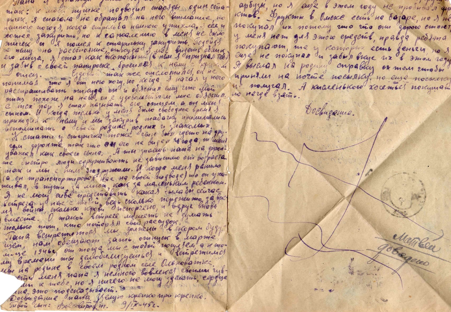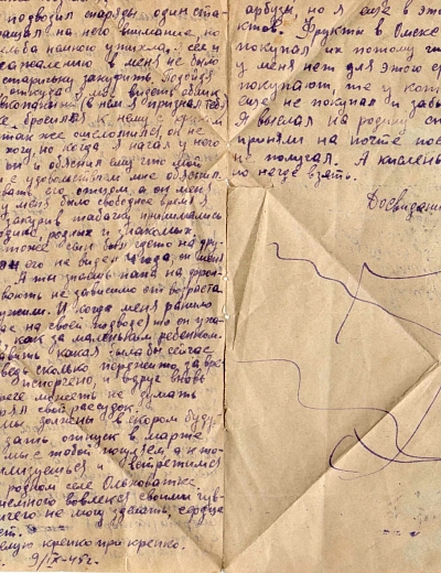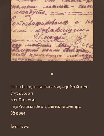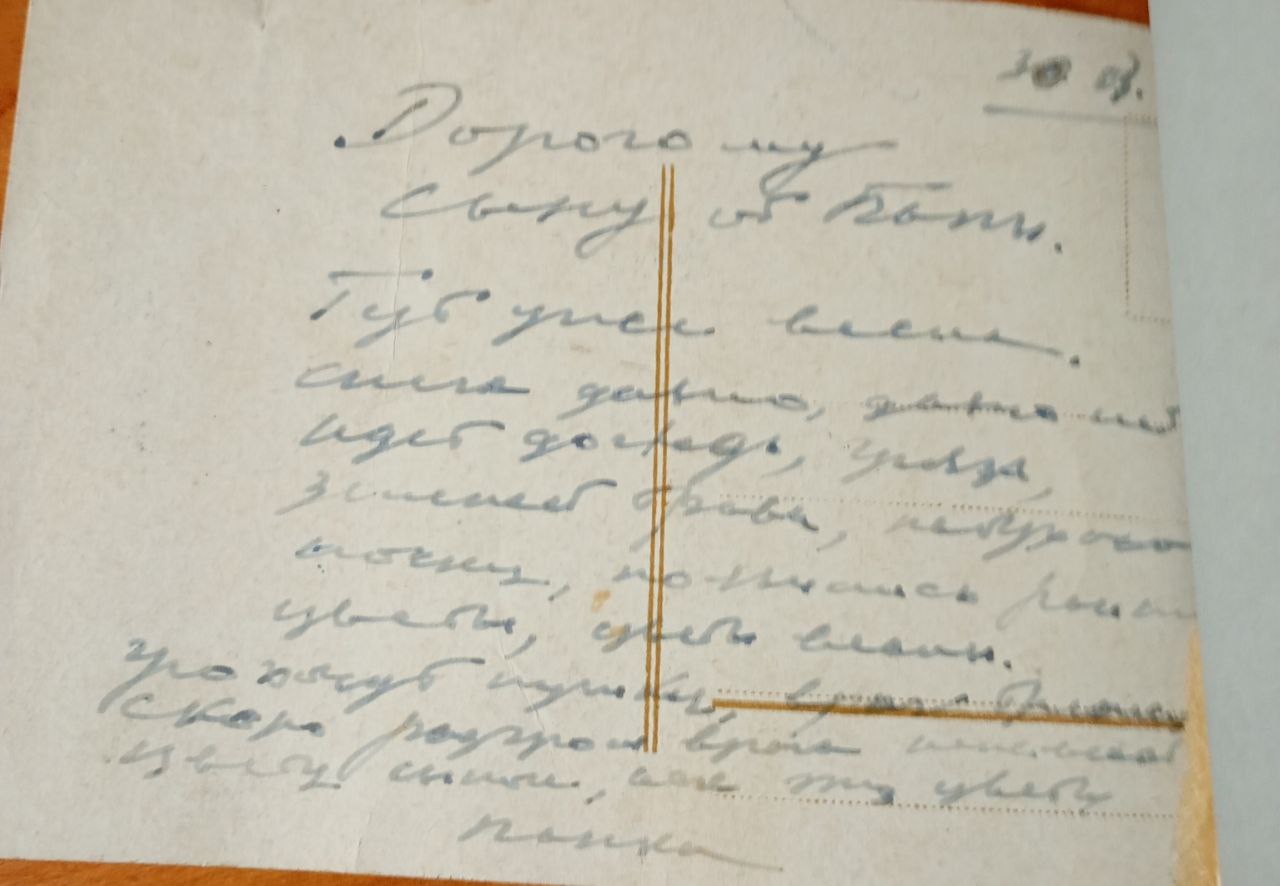 Лякин Анатолий Алексеевич 1921 г.р. Место рождения Тульская обл., Веневский р-н. Последнее место службы 1 гв. тбр ( 1 гв. тбр ). Младший лейтенант, командующий танка. Пропал без вести 14.8.1942 г. Воронежская обл., Землянский р-н, д. Рубцово. Письмо входит в коллекцию предметов семьи Лякиных, в которой хранятся документы двух братьев, Анатолия и Александра, оба брата так и не вернулись с фронта, и их младшей сестры, оставшейся дома вместе с матерью.