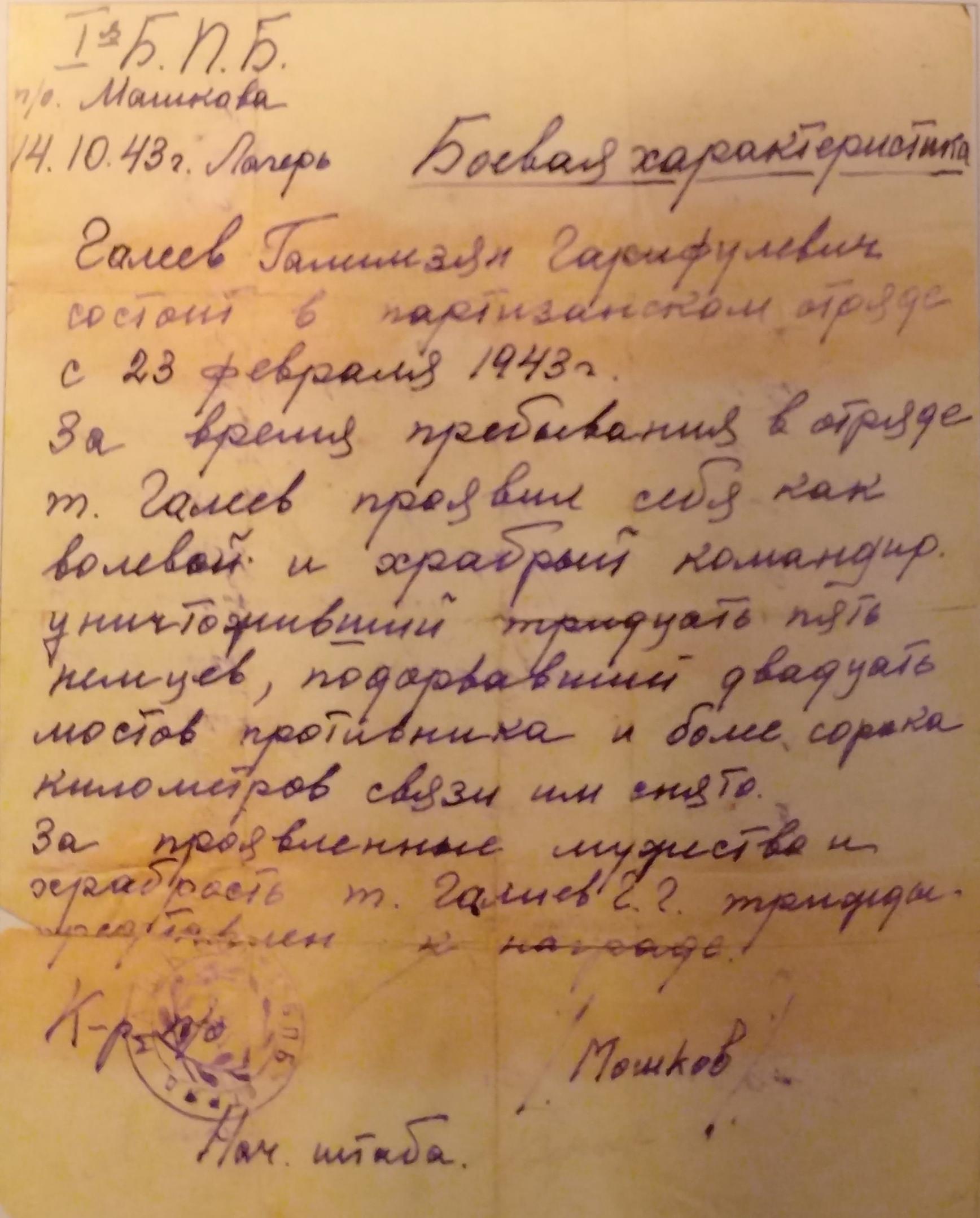Сохранилась «Боевая характеристика», в которой отражён путь воина-партизана Галеева Галимзяна Гарифулловича, который вместе со своими товарищами с оружием в руках боролся против фашизма, очищая нашу родную землю от «коричневой чумы», приближая общую Победу над врагом в Великой Отечественной войне.