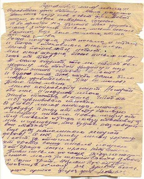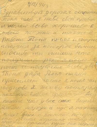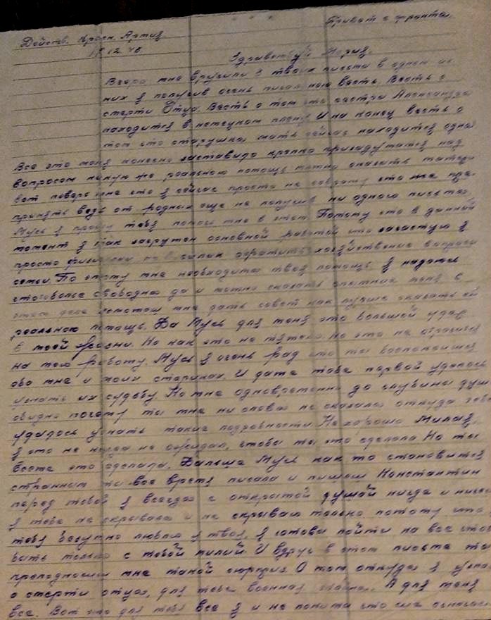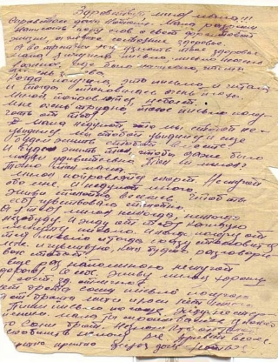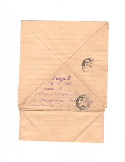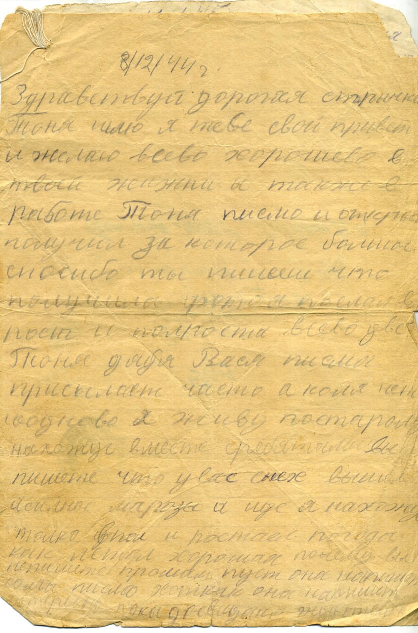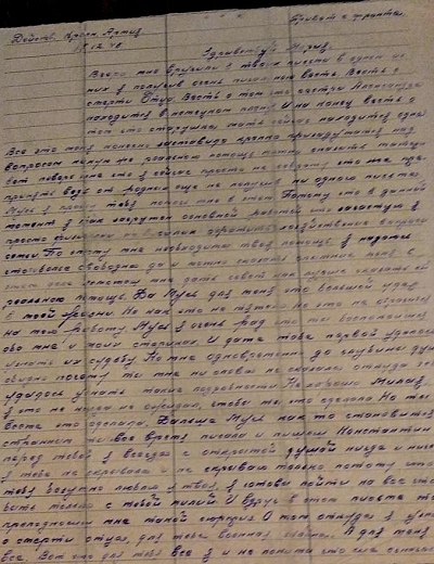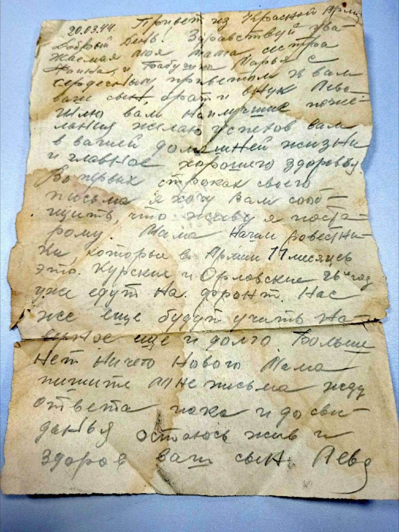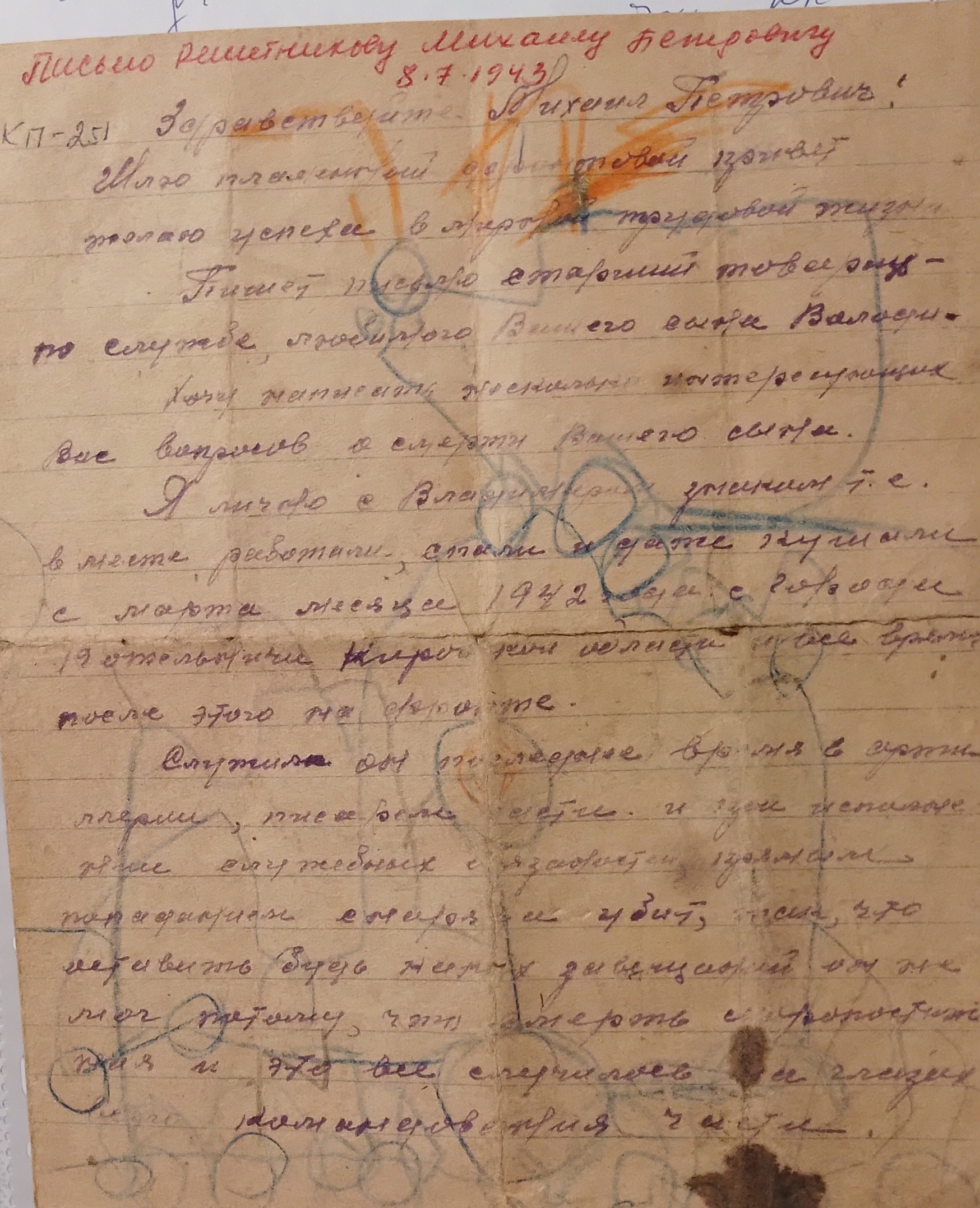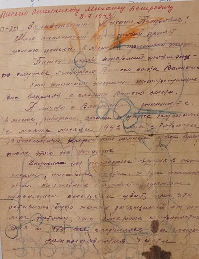 В.А. Терехов родился в д. Соболевка Сухиничского района в 1923 году. 15 января 1943 года был призван на фронт. В феврале 1944 года пропал без вести. В Соболевке осталась мать Терехова Надежда Филипповна. Больше информации об авторе письма нет.