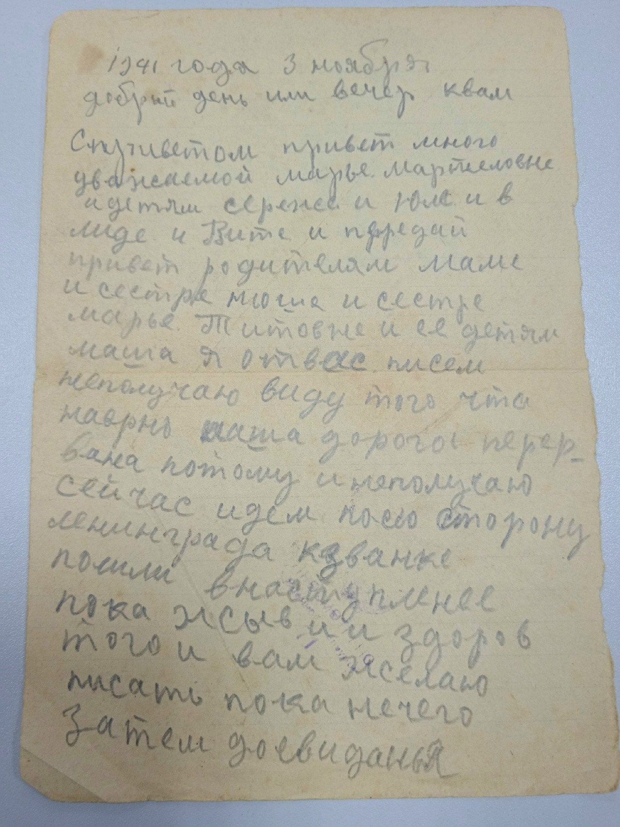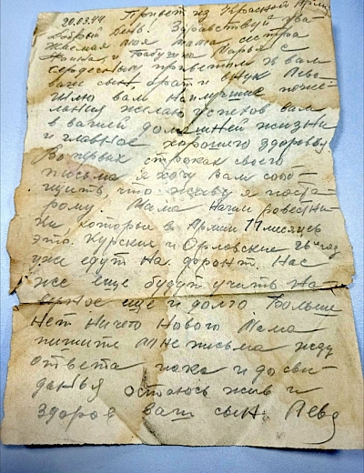 Есть сведения о дочери автора письма, кому оно и адресовано. Пивоварова Лидия Семеновна - выпускница средней школы №2 (ныне лицей №5) 1941 года, участница битвы за Москву. С первых дней войны Лидия Пивоварова поступила на курсы медсестер (курсы «Красного креста») и на практику в госпиталь. Раненые называли ее «Беленькая» (потом писали ей письма). В городе был организован военный отдел, где Лидия Семеновна стала инструктором по военно-физкультурной работе. В апреле 1942 г. вместе со своими подругами и Лидия Пивоварова (первая, за ней еще 40 девушек) подали заявление об отправке на фронт. Они + были призваны в Особую Московскую Армию ПВО Западного фронта, которым командовал Г.К.Жуков. Их направили в 51-ю Зенитно-Артиллерийскую Дивизию, 176-й полк. Сначала Лидия Семеновна была связистом-линейщиком, потом старшим прожектористом Получила звание «ефрейтор». Затем была переведена на новейшую станцию орудийной наводки (СОН – 2) наводчиком. Лидия Семеновна была бойцом-отличником, получила благодарность от И.Сталина. Была в числе тех, кто давал грандиозный салют Победы. За годы Вов была награждена орденом Отечественной войны II степени, медалями «За боевые заслуги», «За оборону Москвы», «За победу над фашистской Германией», медалью Жукова и др.