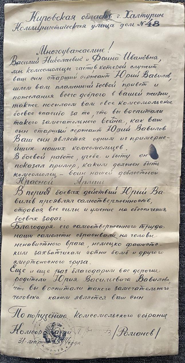 Ю.В. Вавилов родился 20.02.1924 Место рождения Кировская обл., Халтуринский р-н, г. Халтурин. Призван на фронт 20 ноября 1941 г. Авиатехник 2 эскадрильи 569-го ШАП.