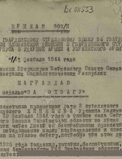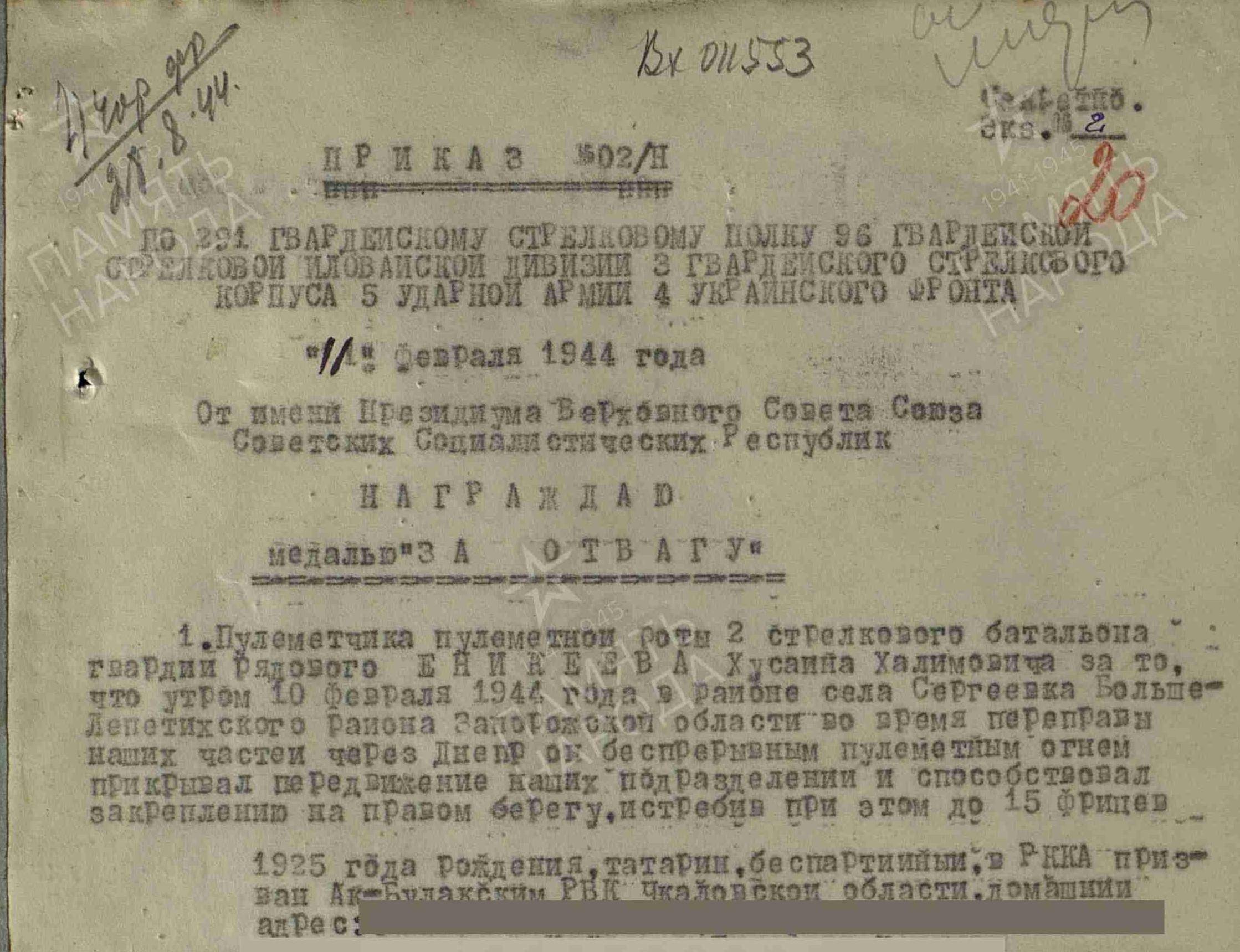 В Приказе подразделения «№: 2/н от: 11.02.1944 года» можно найти следующие слова: «Гвардии рядовой Еникеев Хусаин Халимович утром 10 февраля 1944 года в районе села Сергеевка Больше-Лепетихского района Запорожской области во время переправы наших частей через Днепр… беспрерывным пулемётным огнём прикрывал передвижение наших подразделений и способствовал закреплению на правом берегу, истребив при этом до 15 фрицев».