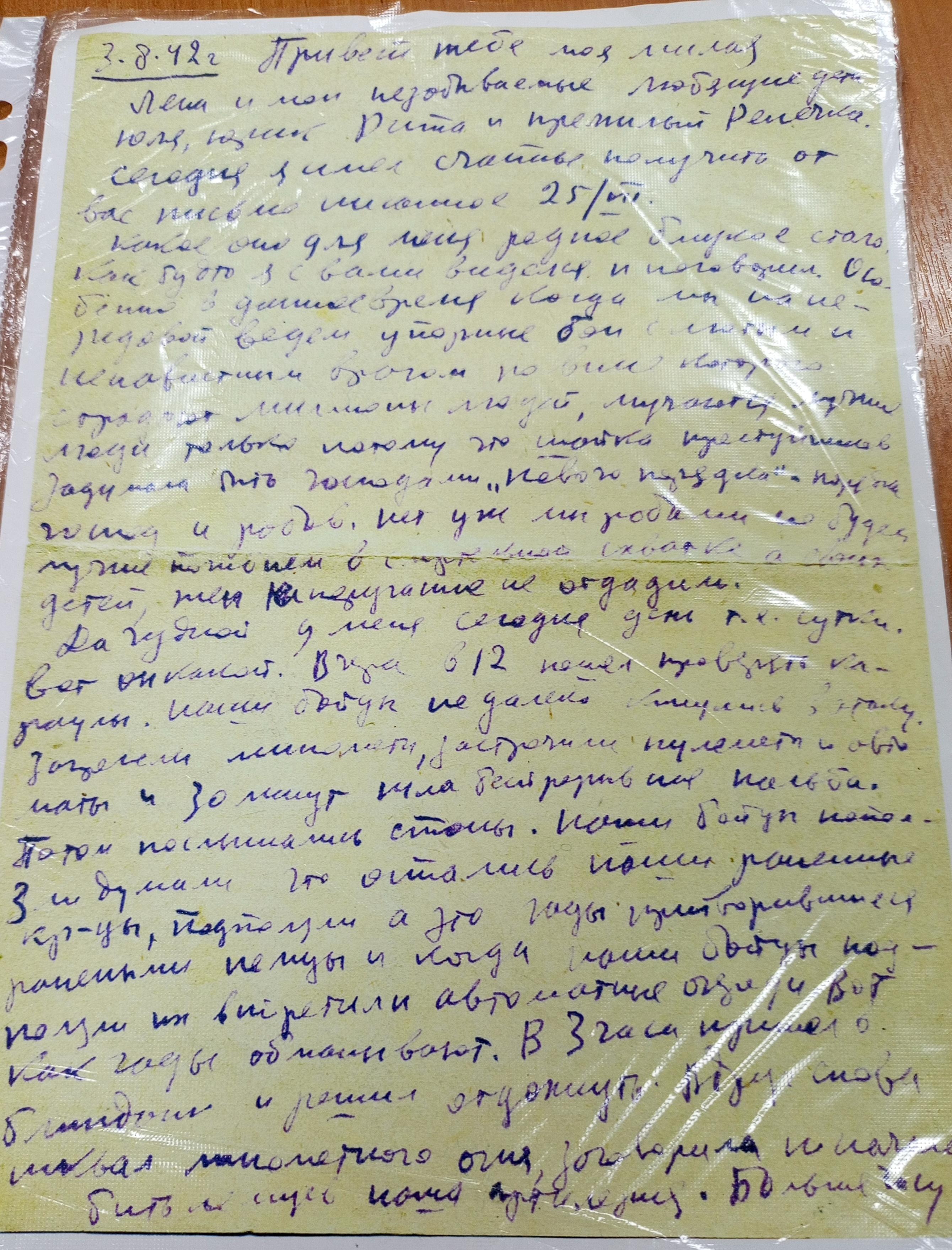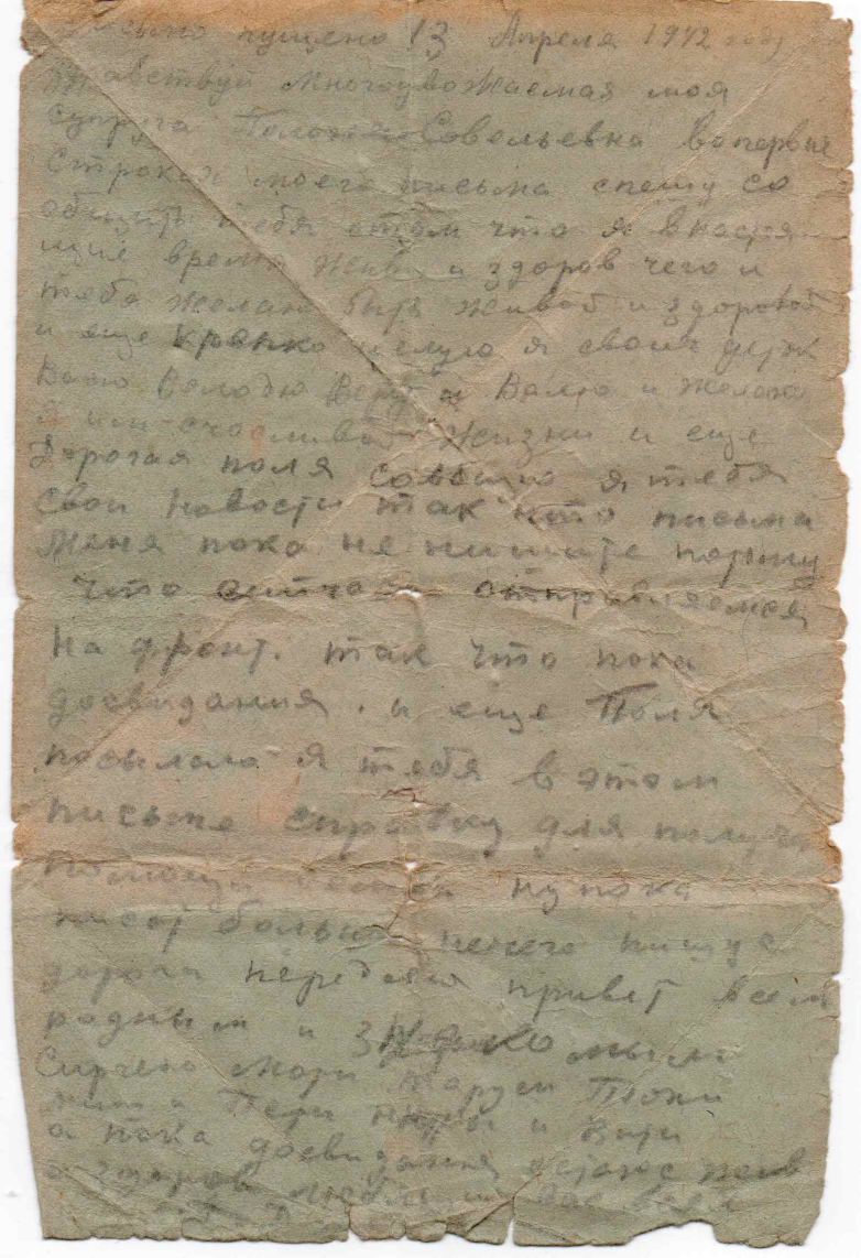 Кинько Федор Данилович - 1915 г. р. Уроженец с. Стрельцово Меловского района Луганской области. Старшина, командир взвода 3-й бригады Морской пехоты Балтийского флота 37 Армии. Умер от РАН 8.11.43г, похоронен в Полтавской области. Украина. Письма написаны в момент нахождения в 200 Запасном СП. (П.П. 11730)