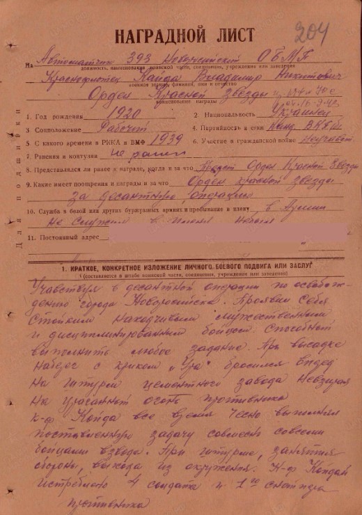 Родился 14 августа 1920 г. в селе Крючки на Украине. До войны жил на Донбассе. Участник второго Куниковского десанта, участник штурма Новороссийска, защитник четырех городов - героев Одессы, Севастополя, Новороссийска, Керчи; матрос, обошедший в годы Великой Отечественной войны два раза земной шар, принимавший по ленд-лизу грузы и военные корабли США и Англии; матрос. Награжден двумя орденами Красной Звезды, орденом Отечественной войны I степени, многими медалями.