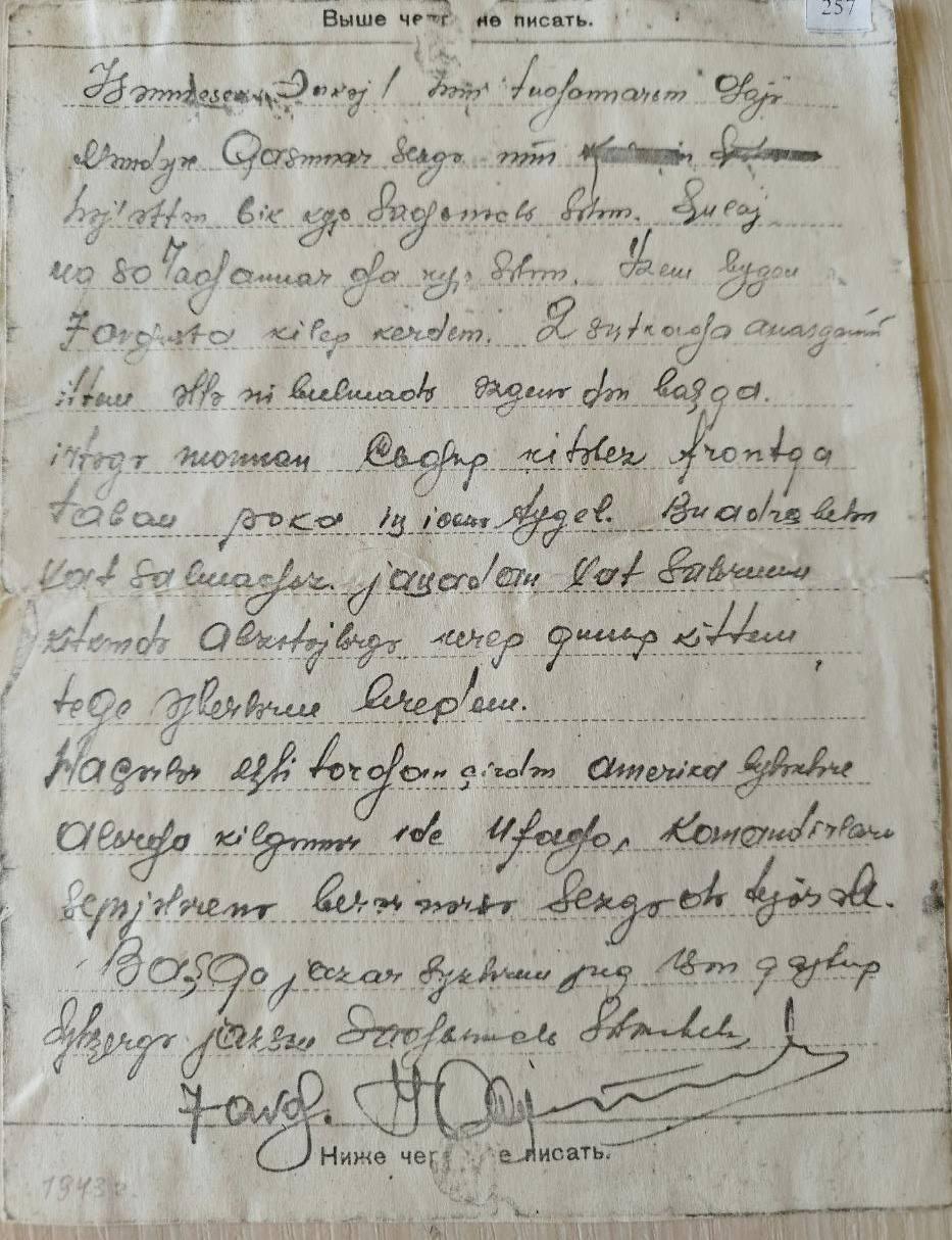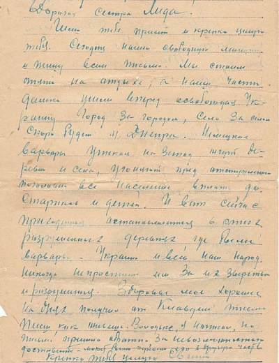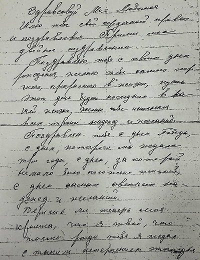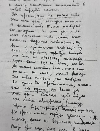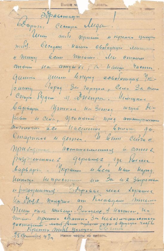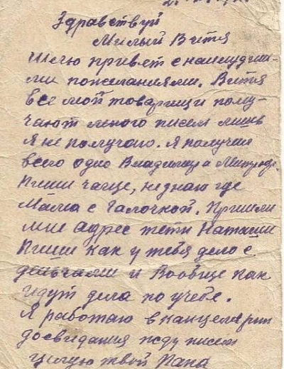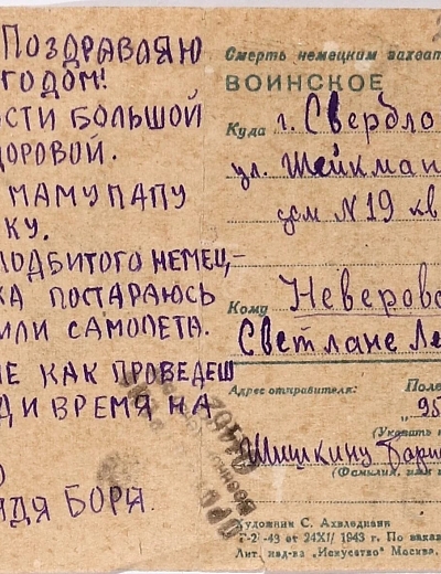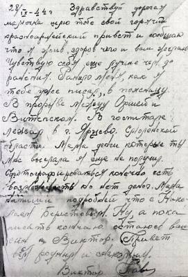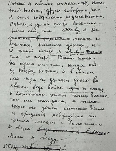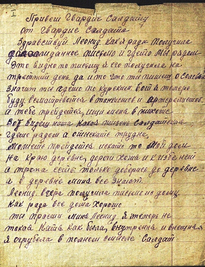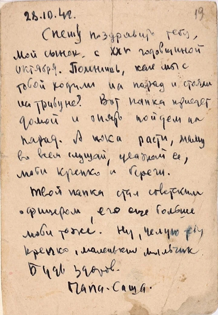«Как сейчас вижу Магадан и школу, в которой возмужал, где меня учили прекрасные советские педагоги, отдающие свои знания, свою жизнь подрастающему поколению! Здесь, на фронте, мы неустанно громИм врага. В день получения подарков от трудящихся Дальнего Востока мы уничтожили огнем орудий три вражеских наблюдательных пункта и несколько блиндажей. Таков ответ врагу, который вторгся на нашу родную землю!