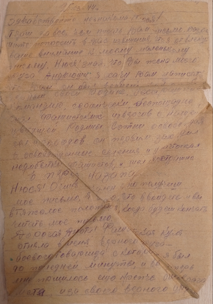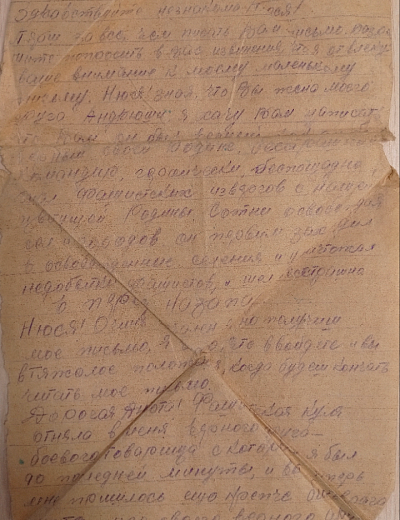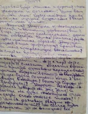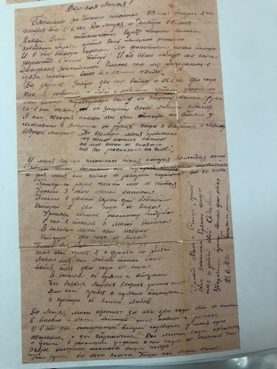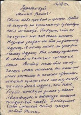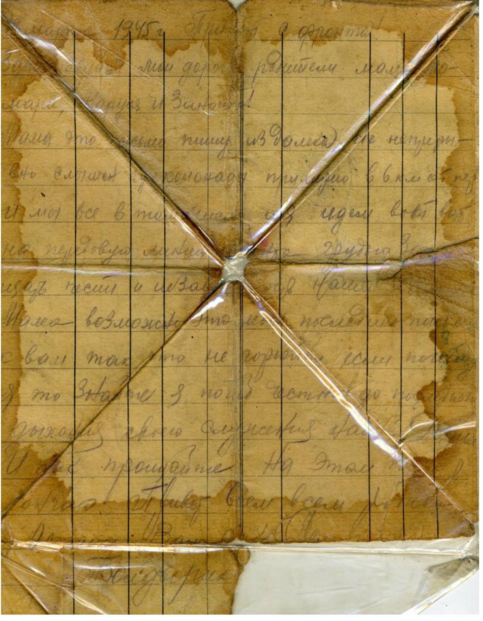 Как только началась война, его сразу же направили в Саратов, где он получил назначение на должность комиссара эвакогоспиталя. Почти год семья жила в Саратове, хотя эвакогоспиталь все время курсировал между Саратовом и фронтом, вывозя раненых. Но и этого ему показалось мало. Он рапорт за рапортом подавал с просьбой отправить его в действующую армию. В конце концов, просьбу его удовлетворили. Он прошел большой путь на войне, познал горечь отступления. А как он радовался, когда его часть пошла в наступление, освобождая город за городом, каким патриотизмом дышали его письма! С фронта дед присылал нежные, трогательные письма – белые треугольнички с указанием № полевой почты. Он писал, что они изо всех сил бьют фрица, что пуля - дура его не берет… Она настигнет его позже.
