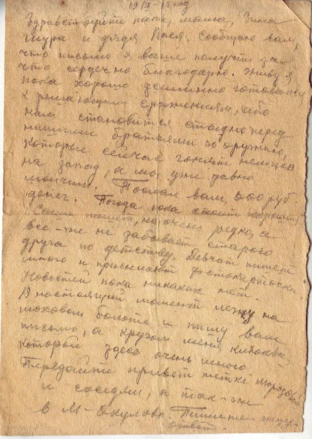 Он прошел большой путь на войне, познал горечь отступления. С фронта дед присылал нежные, трогательные письма – белые треугольнички с указанием № полевой почты. Он писал, что они изо всех сил бьют фрица, что пуля - дура его не берет… Она настигнет его позже. Наша Армия освобождала город за городом, область за областью, каждый метр земли, политой кровью. Погиб и мой дед, освобождая село Красностав, 90 км от города Николаев. Он погиб замполитом в чине капитана.