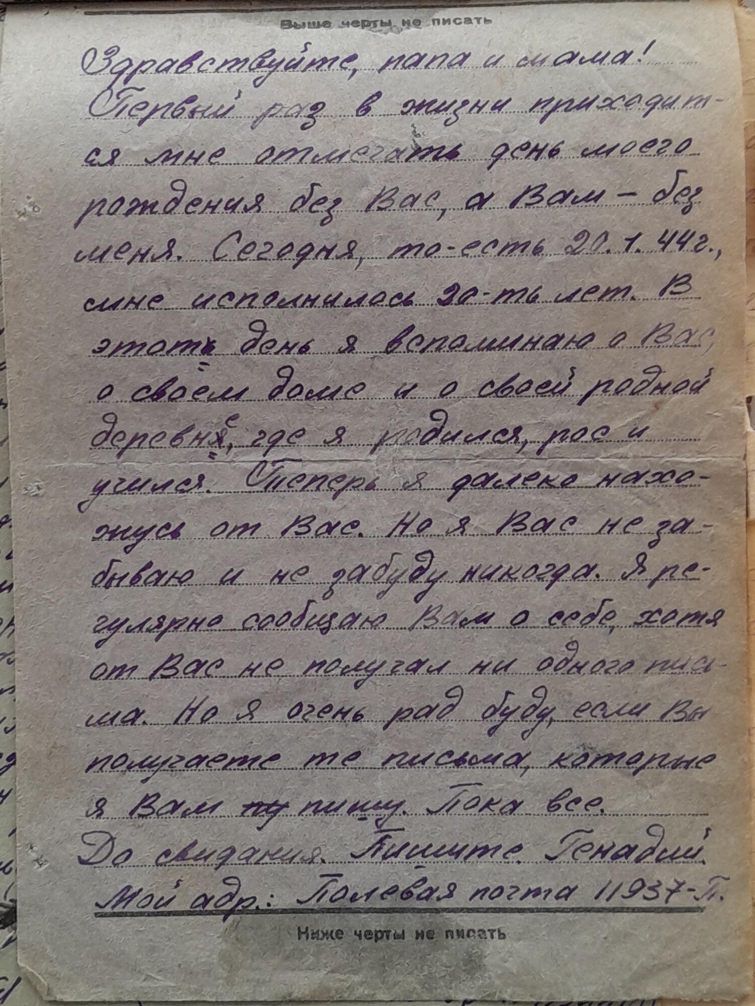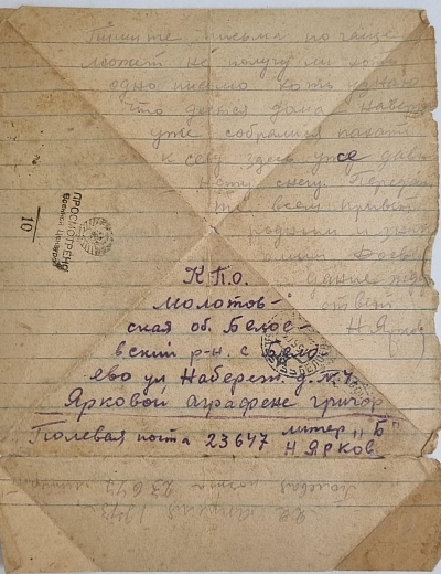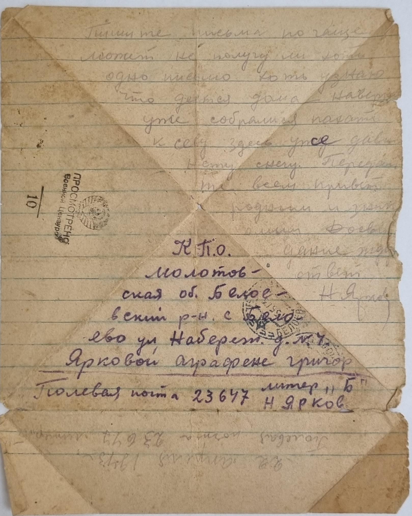 Ярков Николай Александрович - дядя Нечаевой Татьяны Федоровны, сохранившей письма. Родился в 1923 году в с. Белоево Молотовской области (сейчас Пермский край). Николай был младшим сержантом, командиром отделения 32 отдельной стрелковой бригады. В феврале 1943 года был ранен. В личном архиве сохранились документы, личные письма, похоронка, письмо о смерти от комсомольцев. Погиб при выполнении спецзадания 2 июля 1943 года. Похоронен с воинскими почестями в д. Гришино Калининской обл.