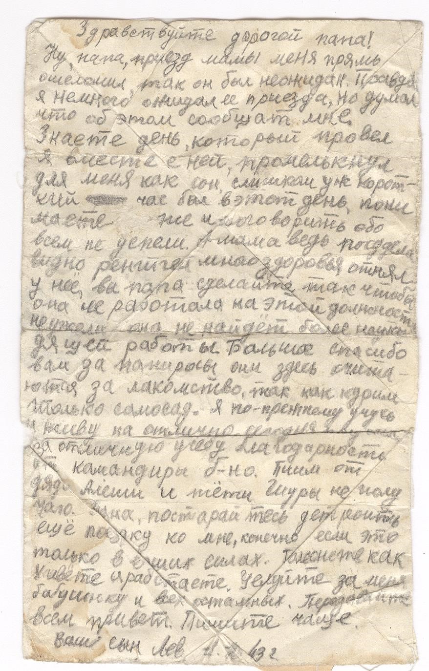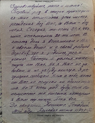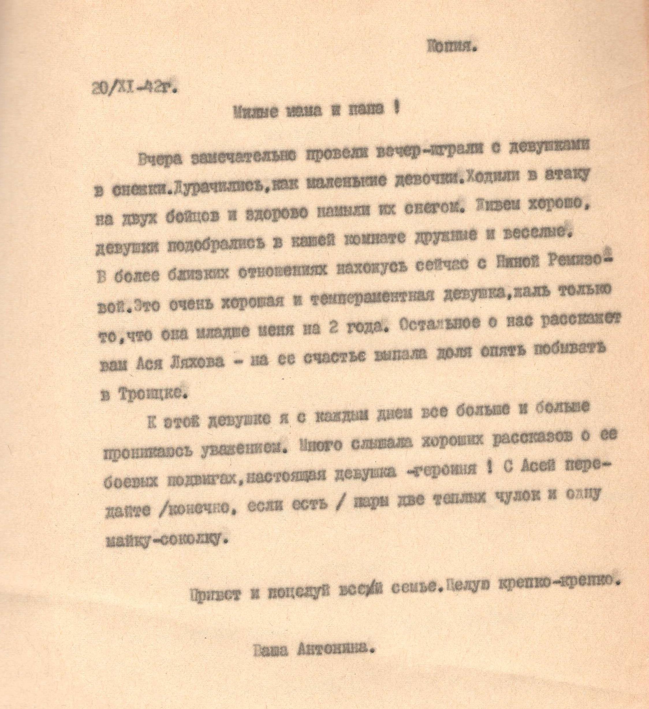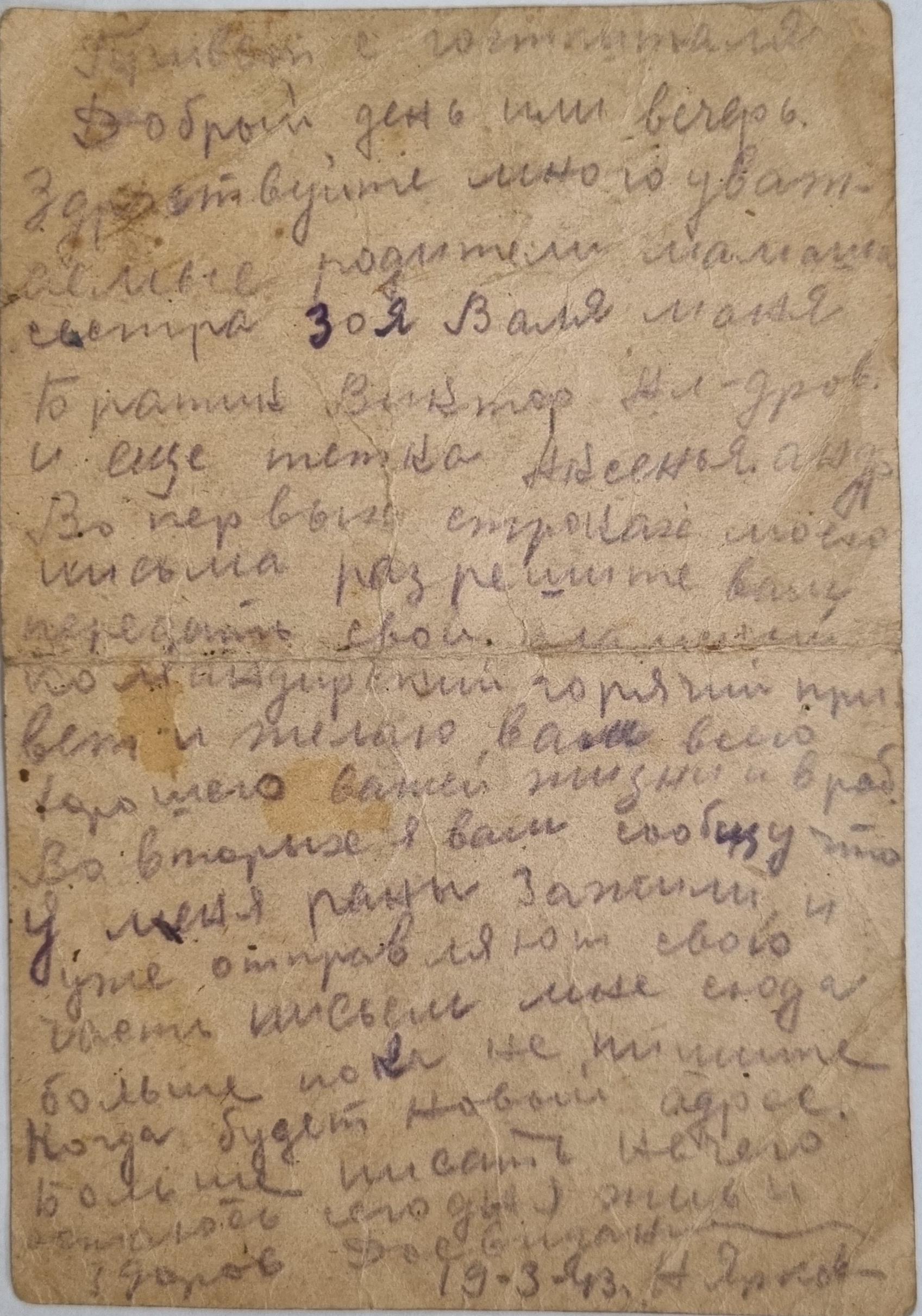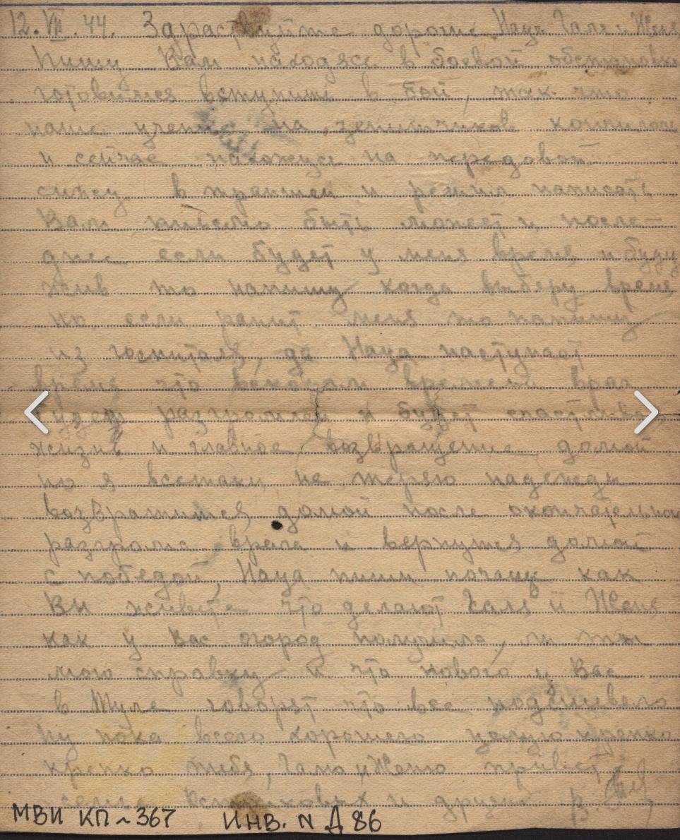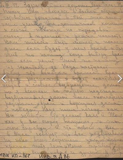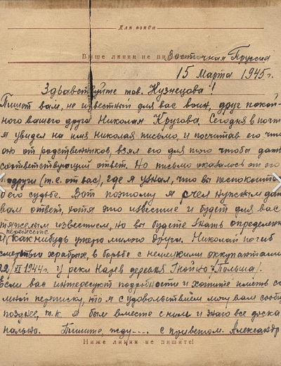 Ярков Николай Александрович - дядя Нечаевой Татьяны Федоровны, сохранившей письмо. Родился в 1923 году в с. Белоево Молотовской области (сейчас Пермский край). Николай был младшим сержантом, командиром отделения 32 отдельной стрелковой бригады. В феврале 1943 года был ранен. В личном архиве сохранились документы, личные письма, похоронка, письмо о смерти от комсомольцев. Погиб при выполнении спецзадания 2 июля 1943 года. Похоронен с воинскими почестями в д. Гришино Калининской обл.