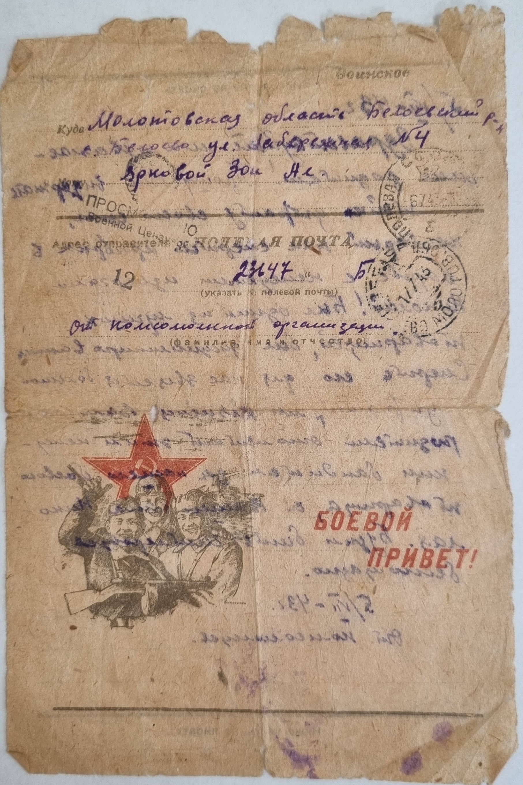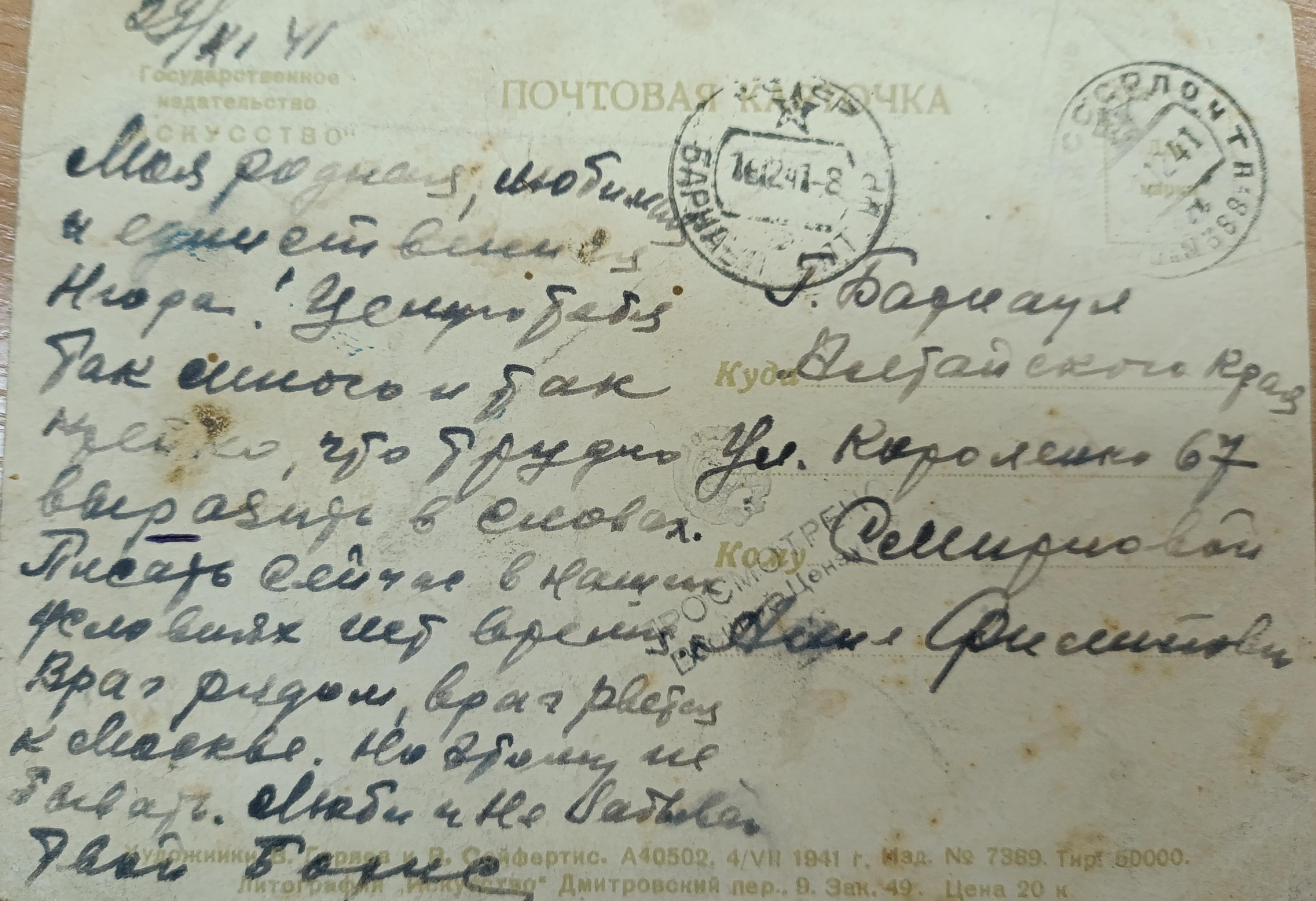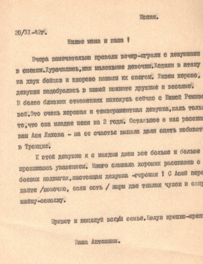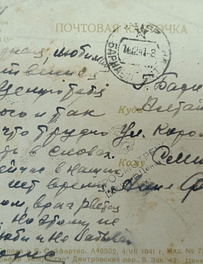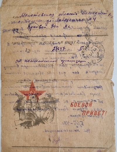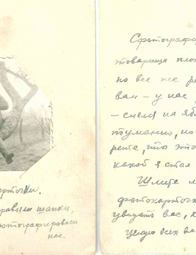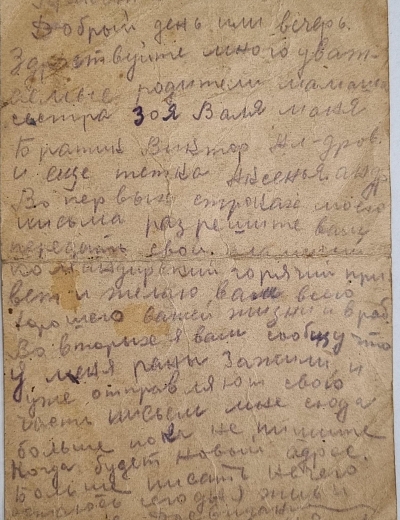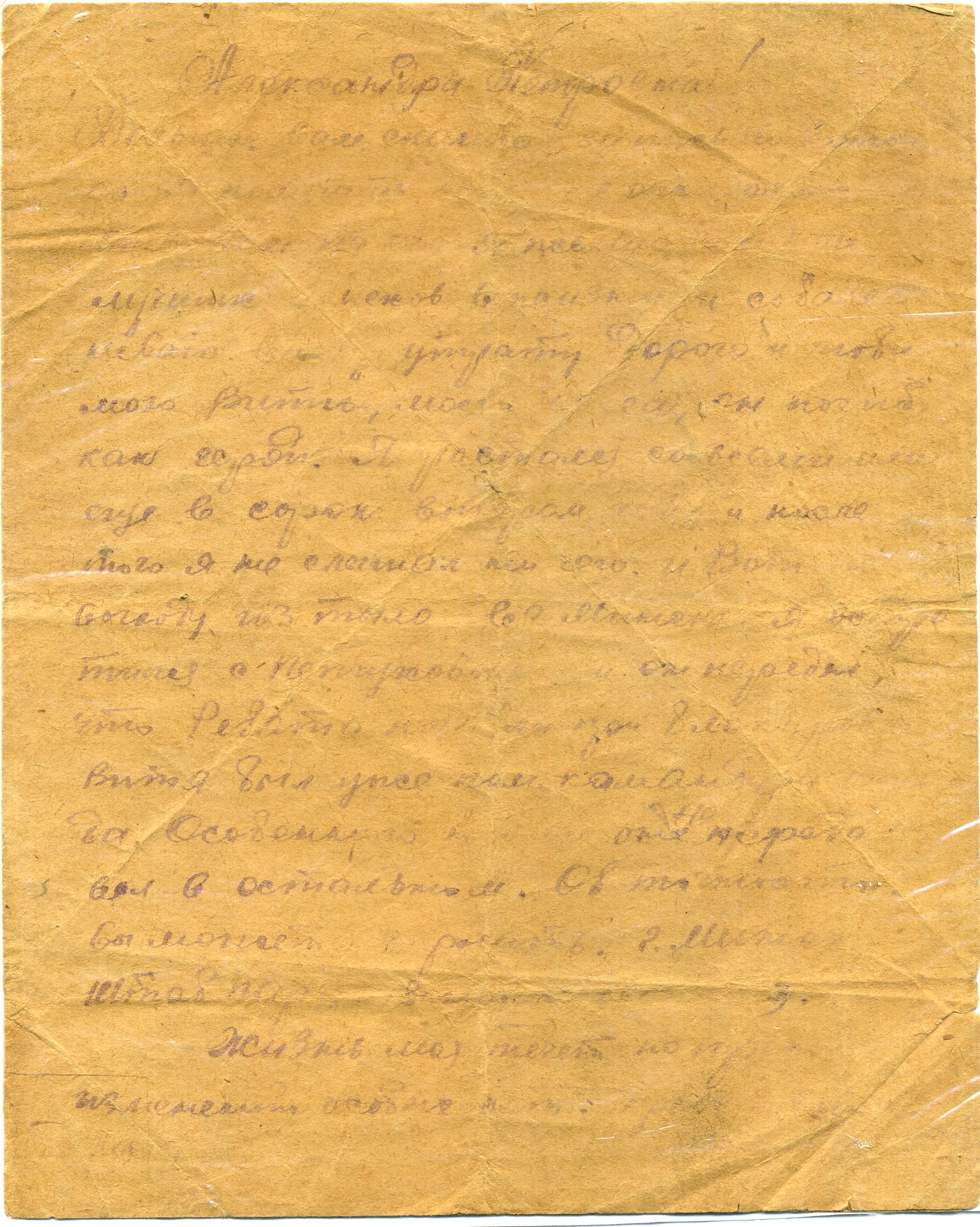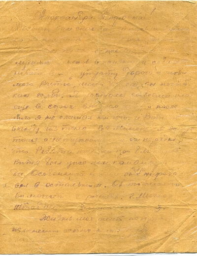 Письмо адресовано Александре Петровне Щербаковой. Автором письма является Сергей, друг и боевой товарищ Виктора Щербакова, погибшего в 1944 в Вязьме.
