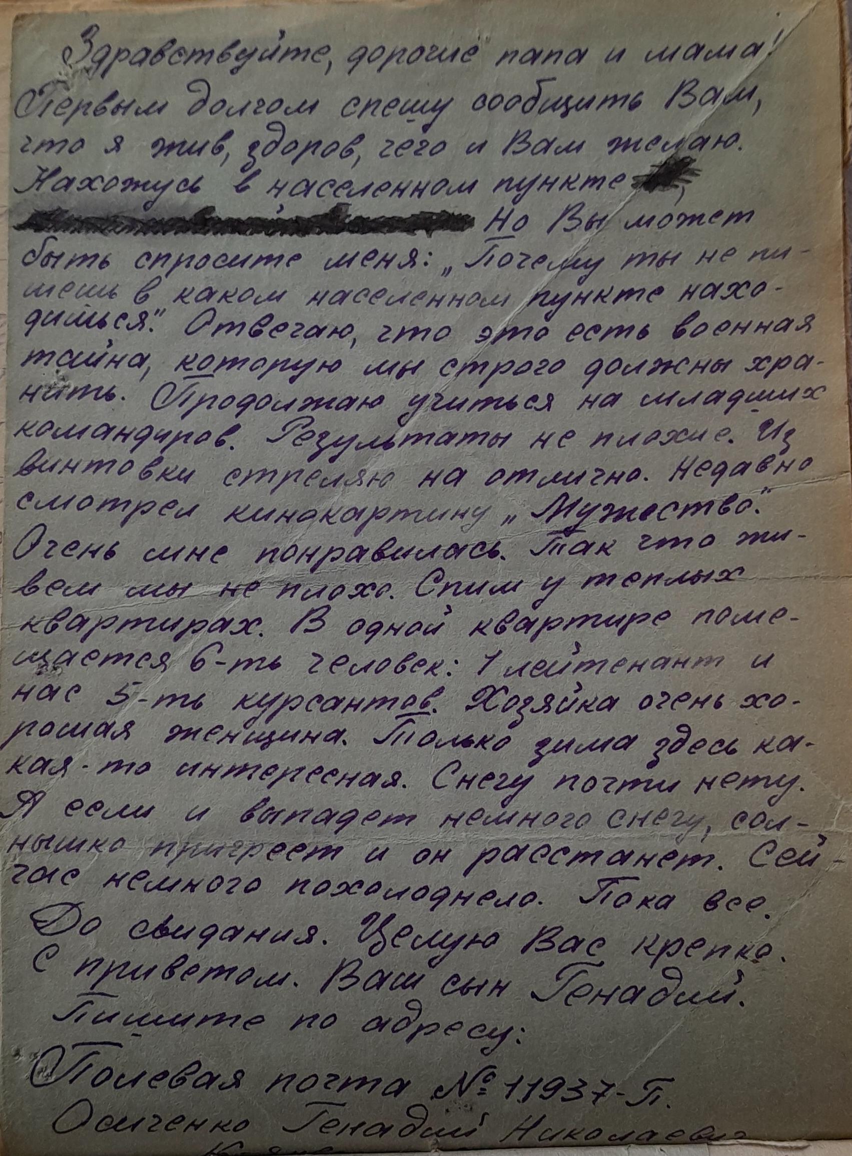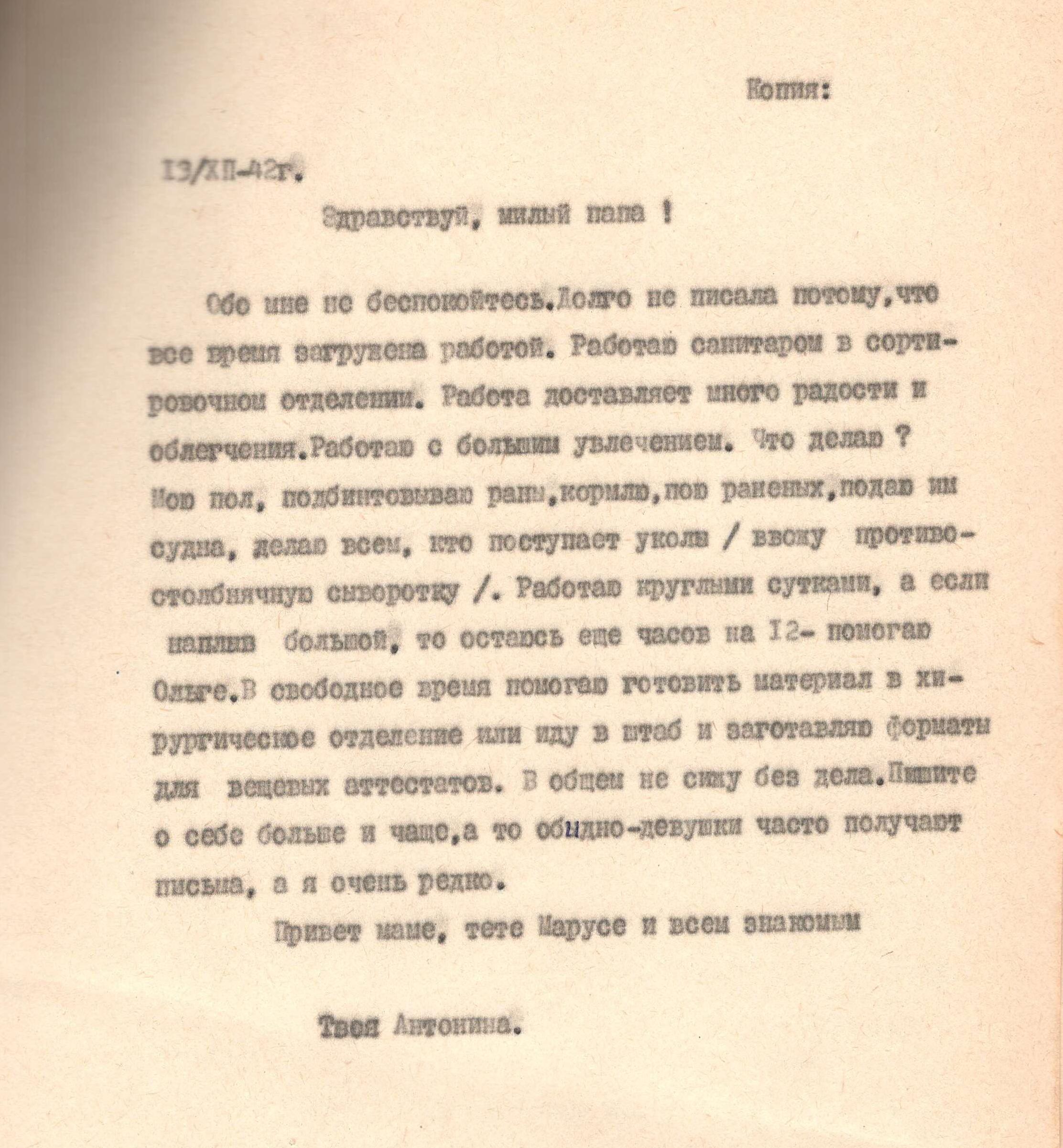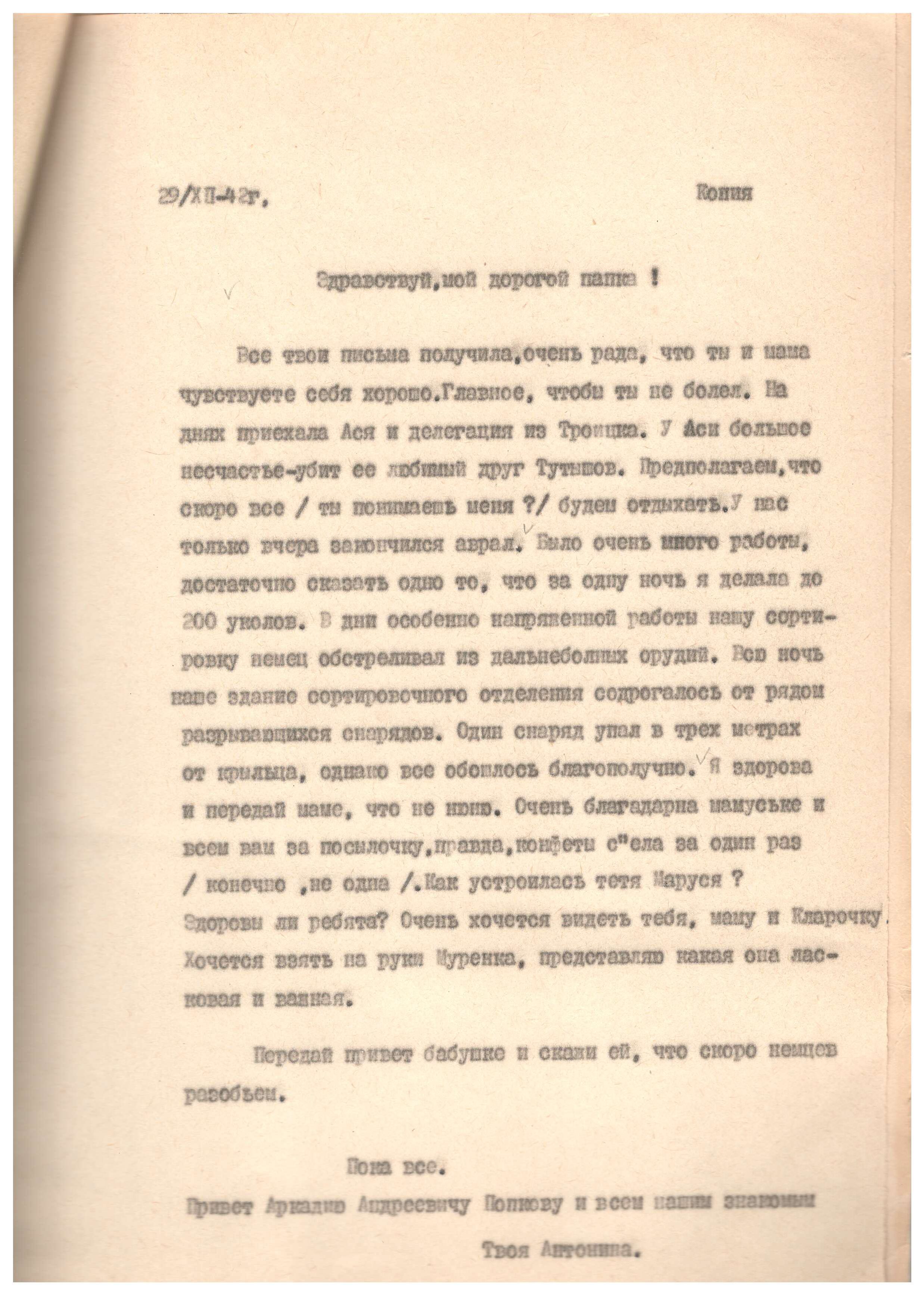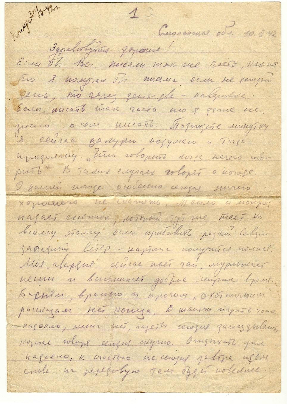 Письмо адресовано Александре Петровне Щербаковой. Автором письма является Сергей, друг и боевой товарищ Виктора Щербакова, погибшего в 1944 в Вязьме.