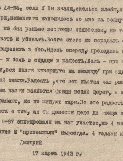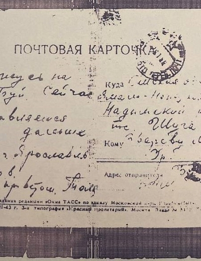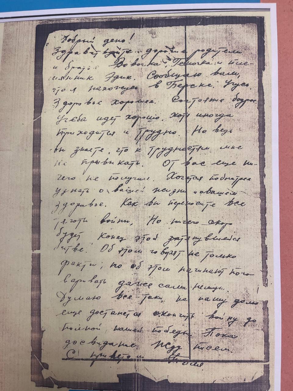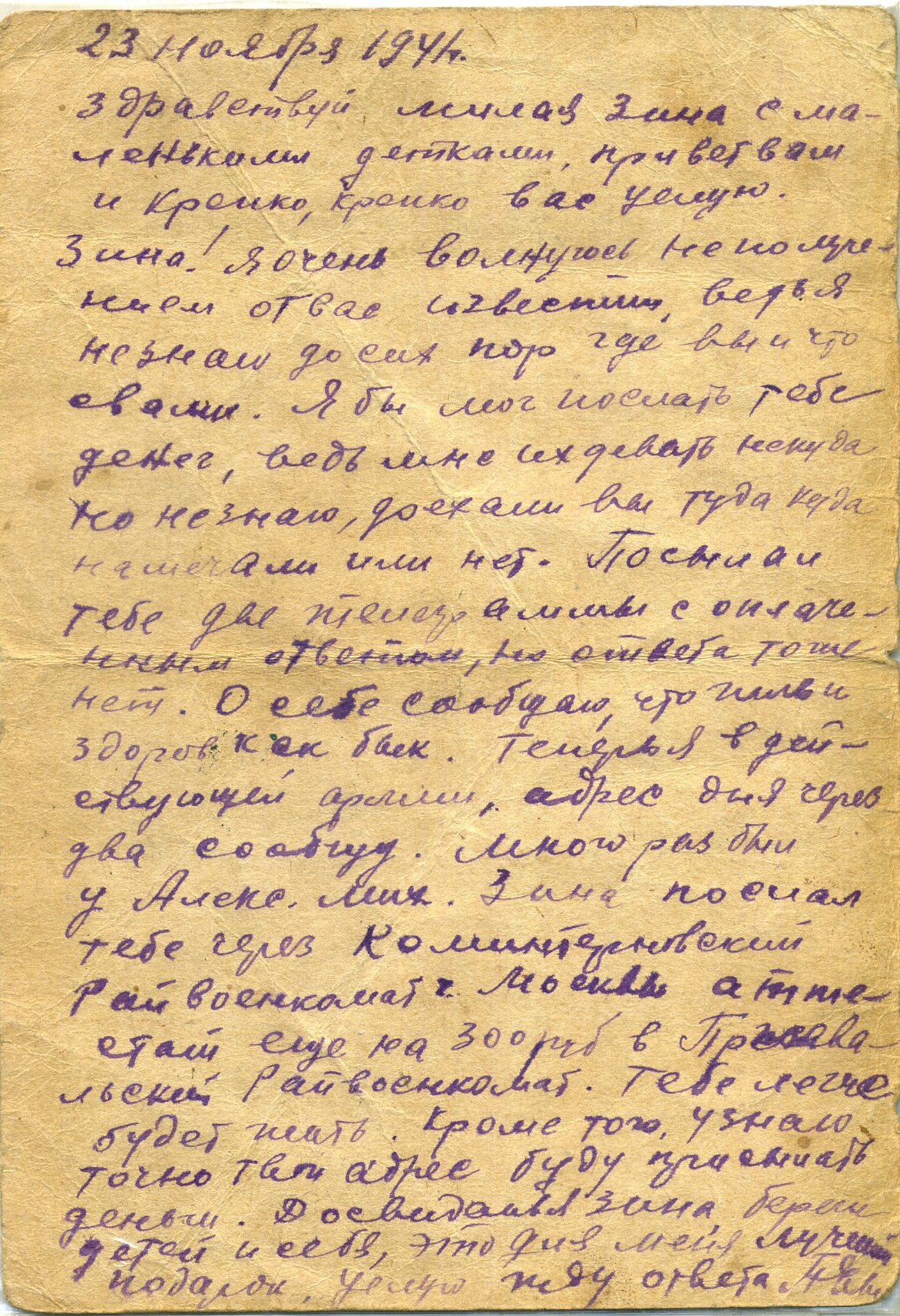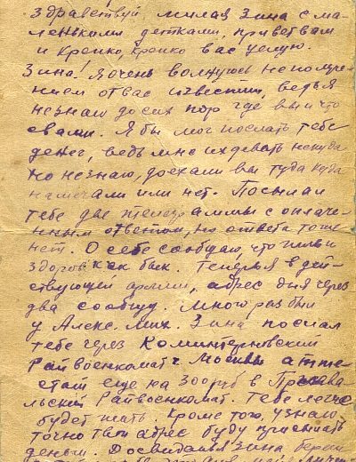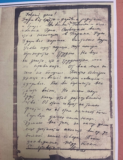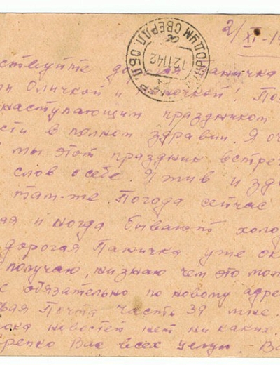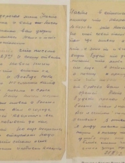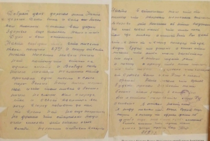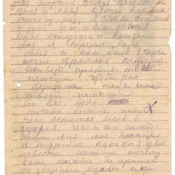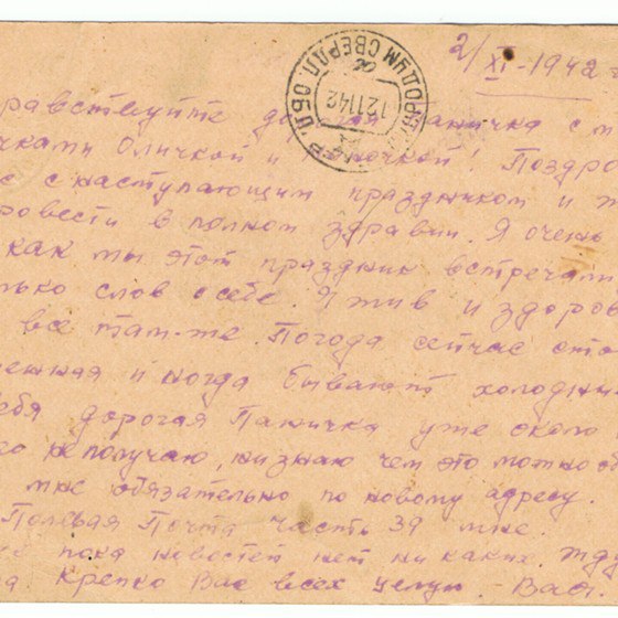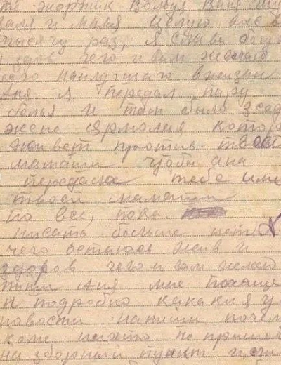 Здравствуйте, дорогие Аня и дети Жоржик, Володя, Ваня, Шура, Валя и Маня. Целую вас всех тысячу раз. Я,слава богу, жив и здоров, чего и вам желаю, всего наилучшего в жизни. Аня, я передал пару белья и там было 3 жене Ярмолия, которая живёт против твоей мамаши, чтобы она передала тебе или твоей мамаше. Но всё, пока. Писать больше нечего. Остаюсь жив и здоров, чего и вам желаю. Пиши, Аня, мне почаще и подробно, какие у вас новости. Напиши, почему ко мне никто не пришёл на сборный пункт или вы, может быть, рады были, что я от вас ушёл.