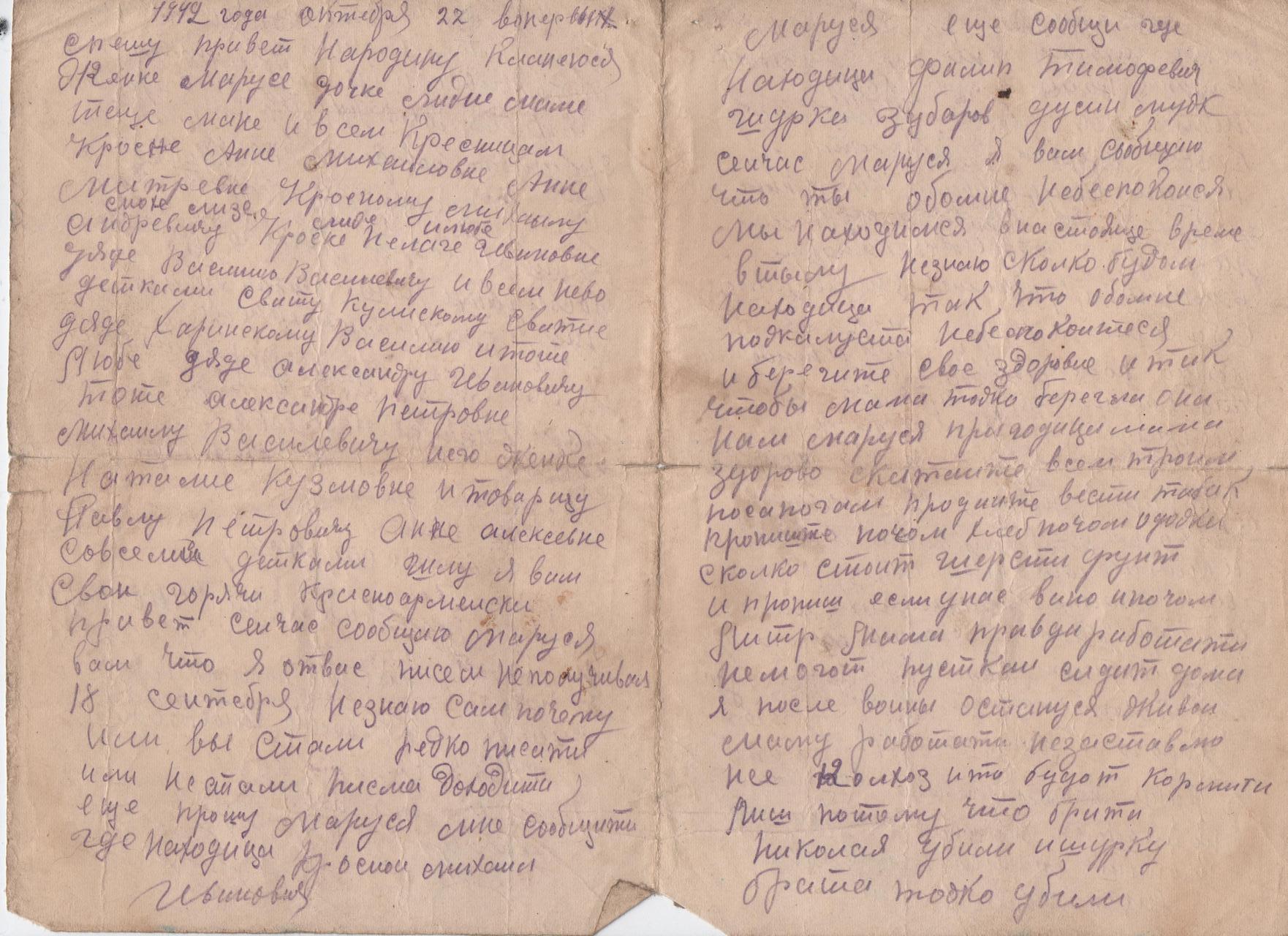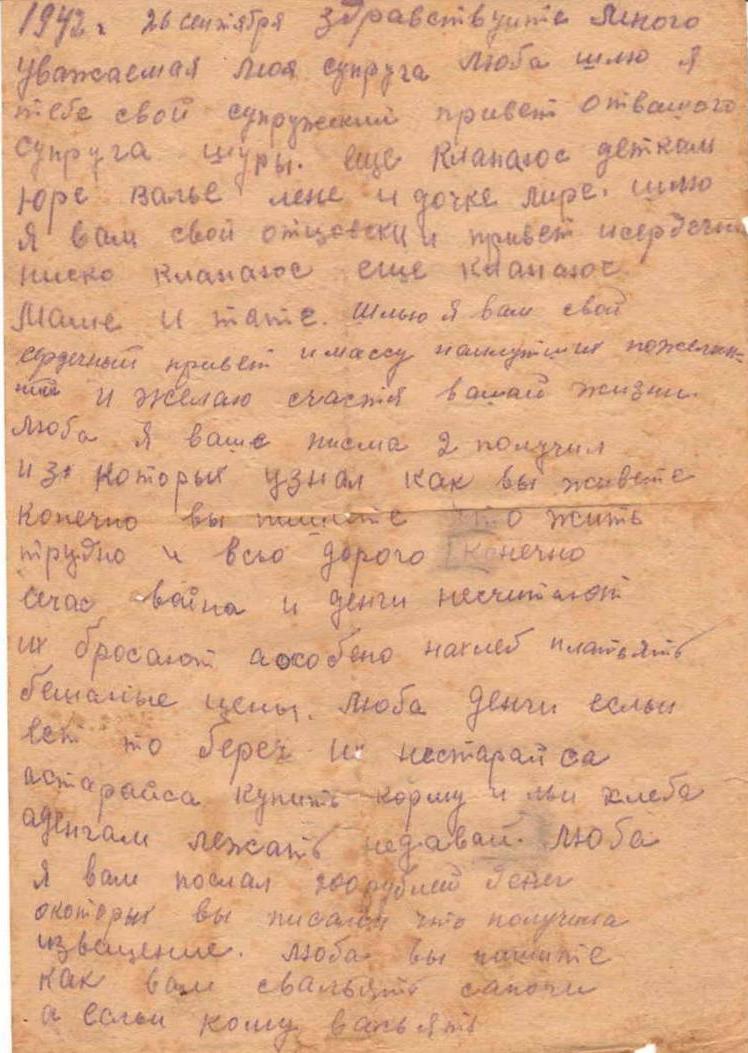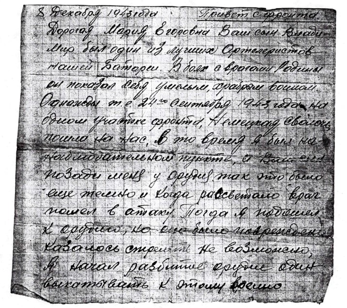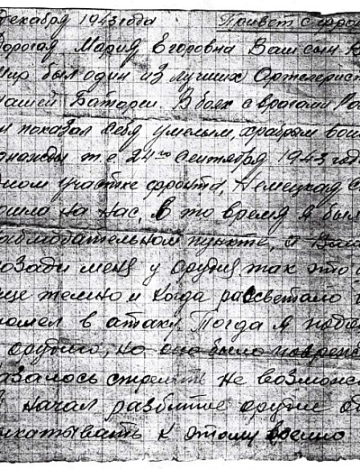 Дмитриев Александр Иванович родился в 1909 году в селе Яневск Ивановской области Суздальского района. С 14 лет Александр трудился в селе, не покладая рук: пахал землю, убирал хлеб, ухаживал за скотом, помогал большой семье. В 1930 году сочетался браком с Любовью Егоровной. В браке у них родилось 4 детей- сын Юрий, сын Леонид, сын Валентин, дочь Лира. В 1941 году Александра призвали на фронт, Любовь осталась с четырьмя детьми. Самому старшему сыну, а младшей его сестрёнке Лире всего 3 годика. Александр Иванович очень переживал за свою семью. Интересовался учебой старших детей. О своей службе писал немногословно. Писал в одном из писем, что он учится на сержанта. И один раз их повели в бой, но командиры вернули их обратно доучиваться, видимо, что-то не получилось у них. В последнем письме от 13 февраля 1943 года А.И. Дмитриев пишет, что он воюет. Бывает страшно после боя, но желание как можно быстрее прогнать немцев с родной земли сильнее. Также сообщает, что его часть перебрасывают со старого места на новое и готовится решающее наступление. Название места, где идут бои, солдат не указывает. Он передает всем родным своим привет, просит писать как можно чаще. Александр Иванович погиб 23 февраля 1943 года.