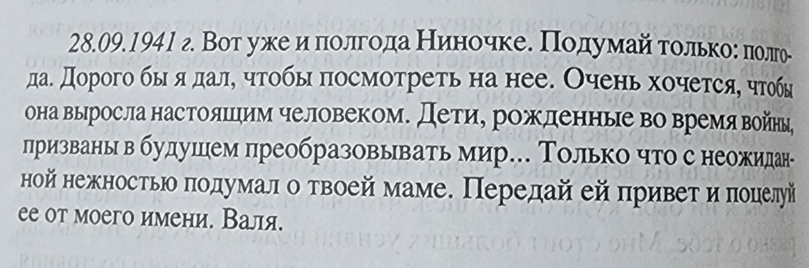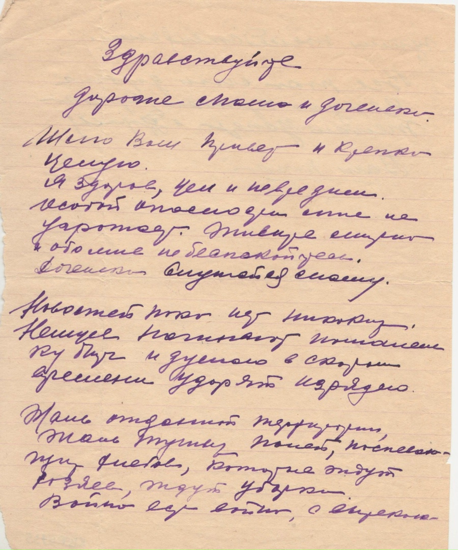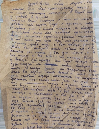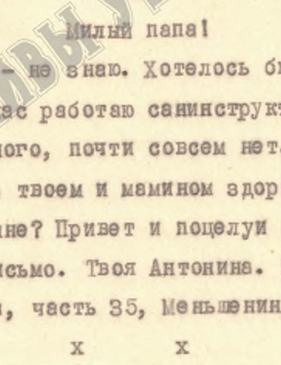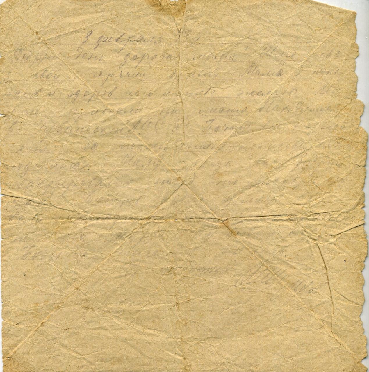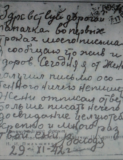 Письма фронтовика Виктора Касаткина адресованы своей дочери Нине. Это письмо было написано в эвакуацию в Молотовскую область из Ленинграда. Виктор служил в Кронштадте и Ленинграде. Был военным инженером.