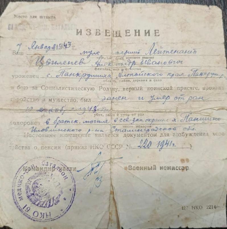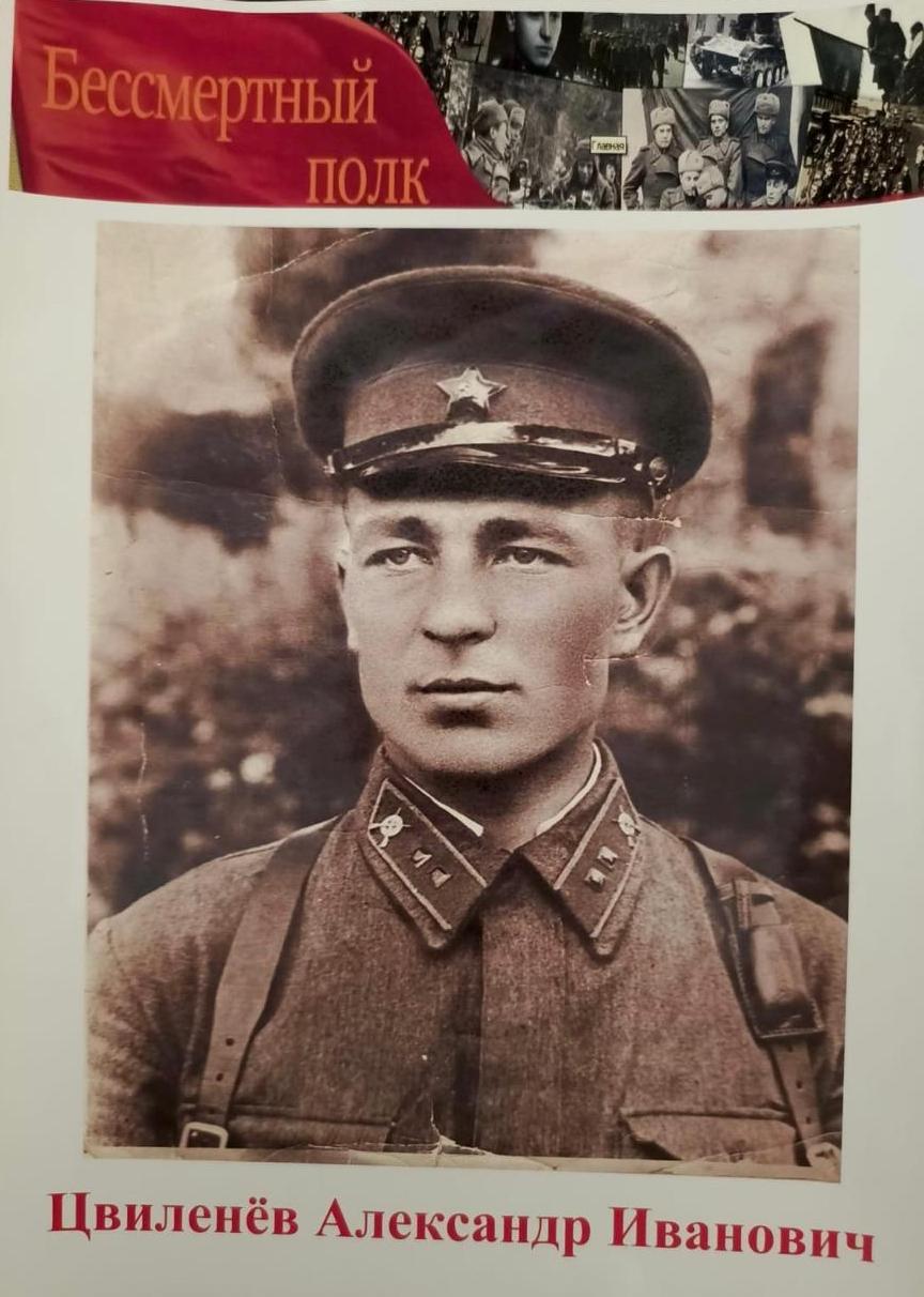 Цвиленев Александр Иванович, род. 1918,русский. Призван 1941 г, Ст.л-т. Умер от ран декабрь 1942г. Похоронен хутор Бабурино Иловлинсого района Сталинградской области." Судьба Александра Ивановича Цвиленева и проста, и необычна. После окончания Каменского педучилища Александр Иванович был направлен на работу в Кривинскую восьмилетнюю школу имени В. С. Ляпустиной Панкрушихинского района. Так как он окончил педучилище успешно, его назначили на должность завуча школы. Позже Александр Иванович Цвиленев почти три года возглавлял коллектив Кривинской школы, был её директором. В 1939 году его перевели в Панкрушихинскую среднюю школу,, а вскоре он был призван на военную службу. В 1942 году после окончания пехотного училища Александр Иванович сражался против фашистов на Ленинградском направлении на подступах к Сталинграду. Бой у хутора Паньшино за высоту 1245 метров был последним для Александра Ивановича. Был ранен и умер от ран. За счастье людей,за прекрасное будущее нашей Родины отдал свою молодую жизнь учитель - Александр Иванович Цвеленев.