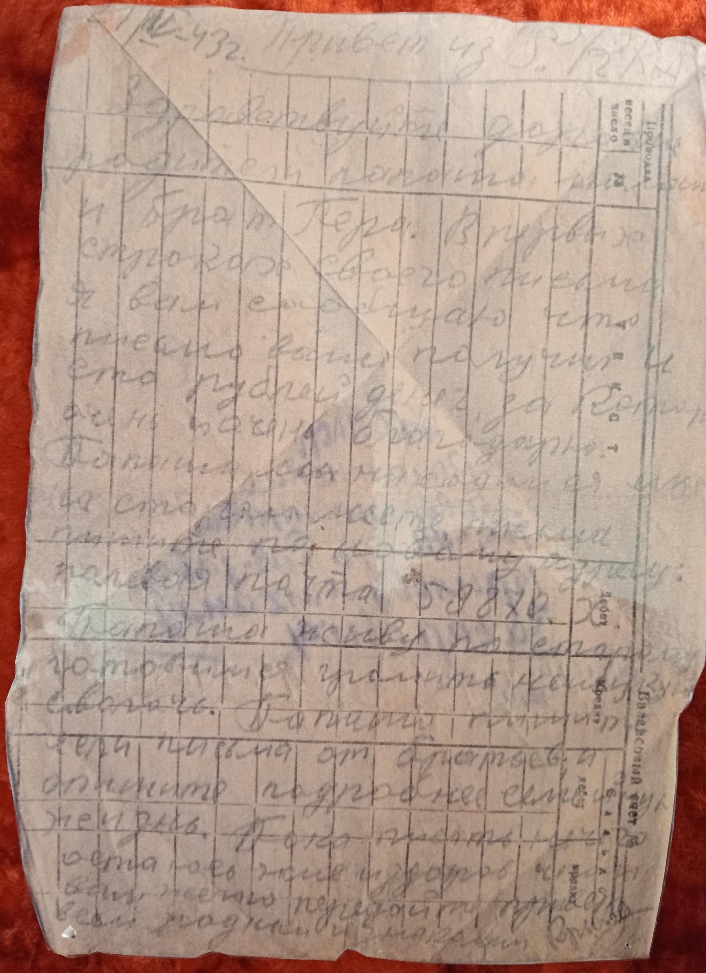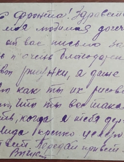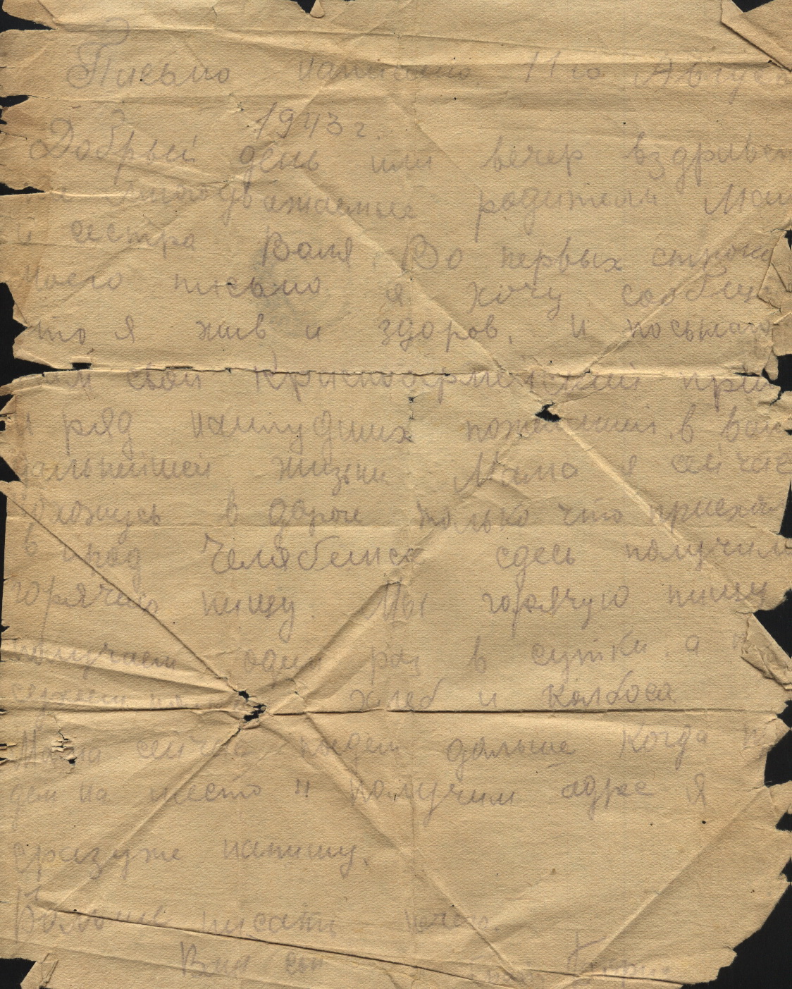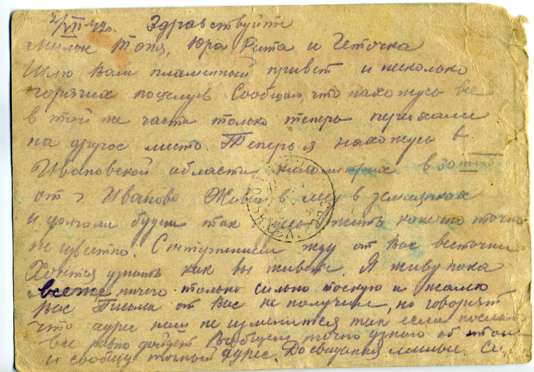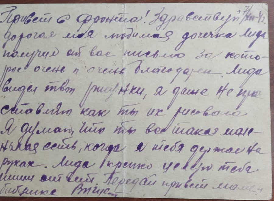 Письмо было написано 24 июня 1942 года Рыбальской Прасковье Михайловне в Свердловскую обл., Зайковский р-он, ст. Худяково, с. Скородум. В архиве хранится много писем этого автора. Читая их строки, понимаешь, какие теплые и нежные отношения были между супругами.