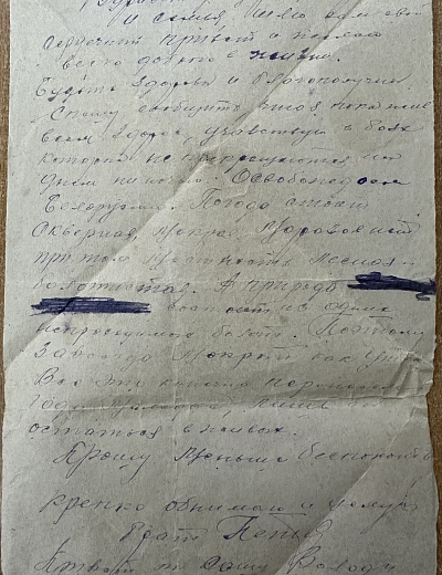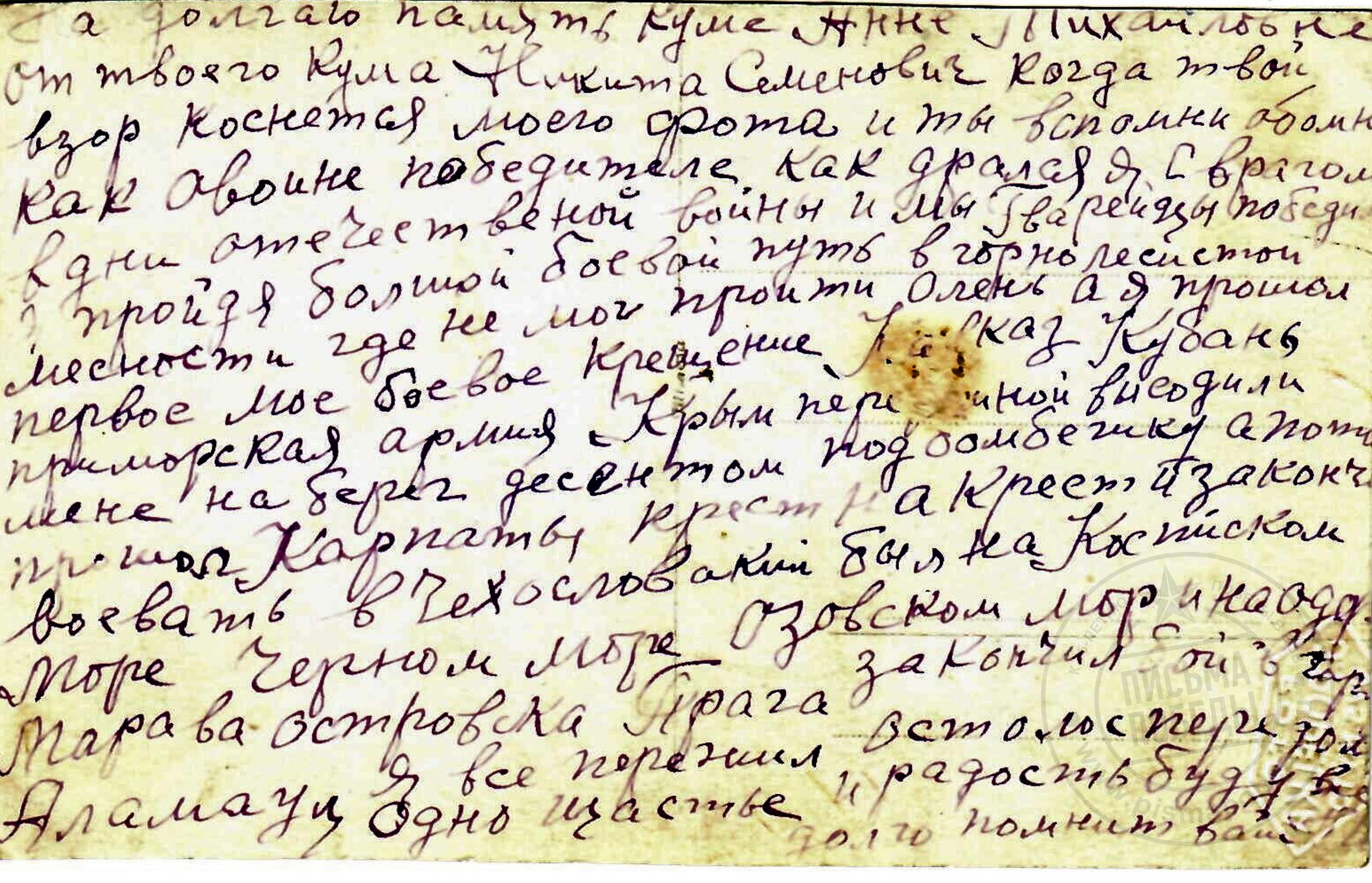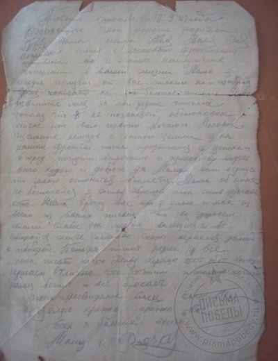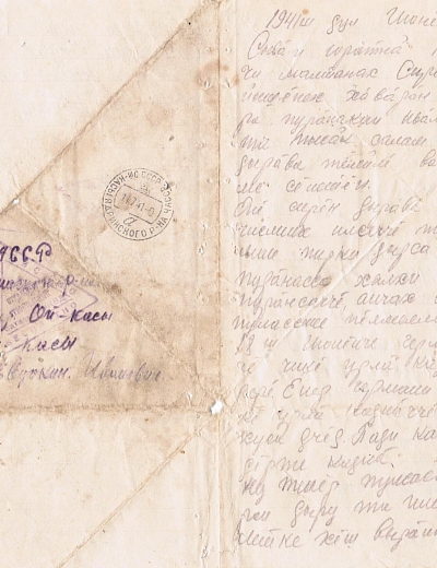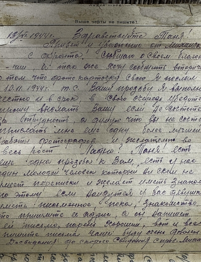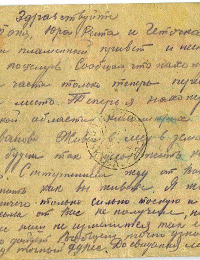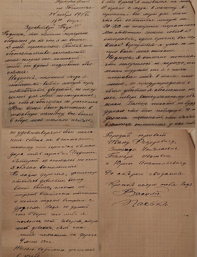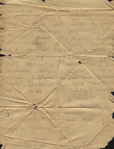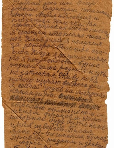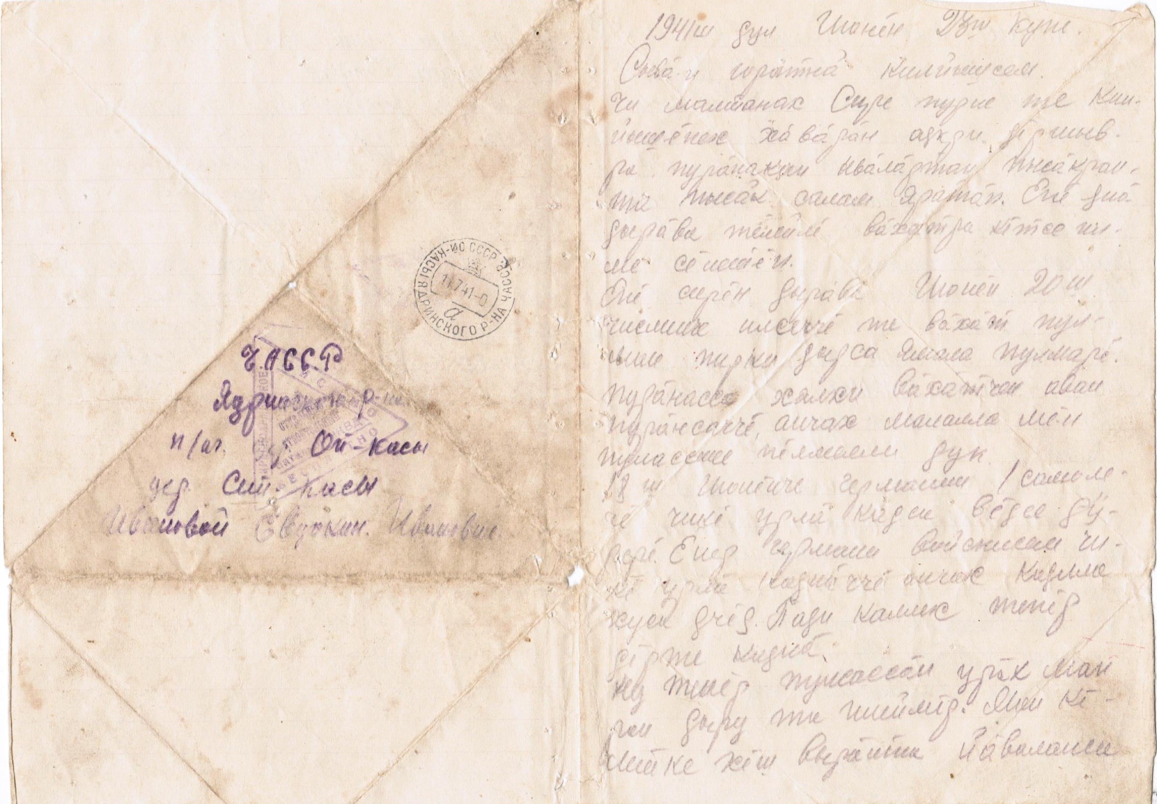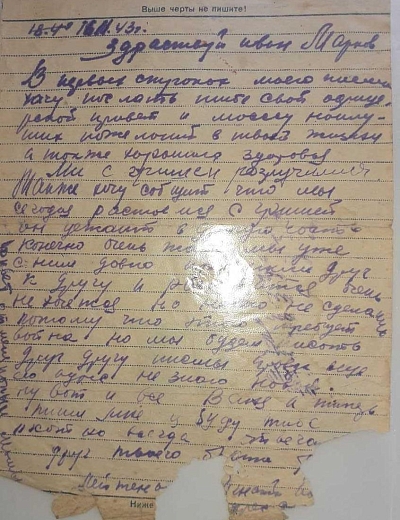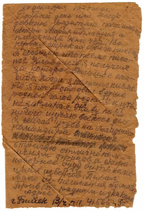 Письмо было написано 24 июня 1942 года Рыбальской Прасковье Михайловне в Свердловскую обл., Зайковский р-он, ст. Худяково, с. Скородум. В архиве хранится много писем этого автора. Читая их строки, понимаешь, какие теплые и нежные отношения были между супругами.