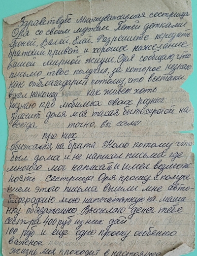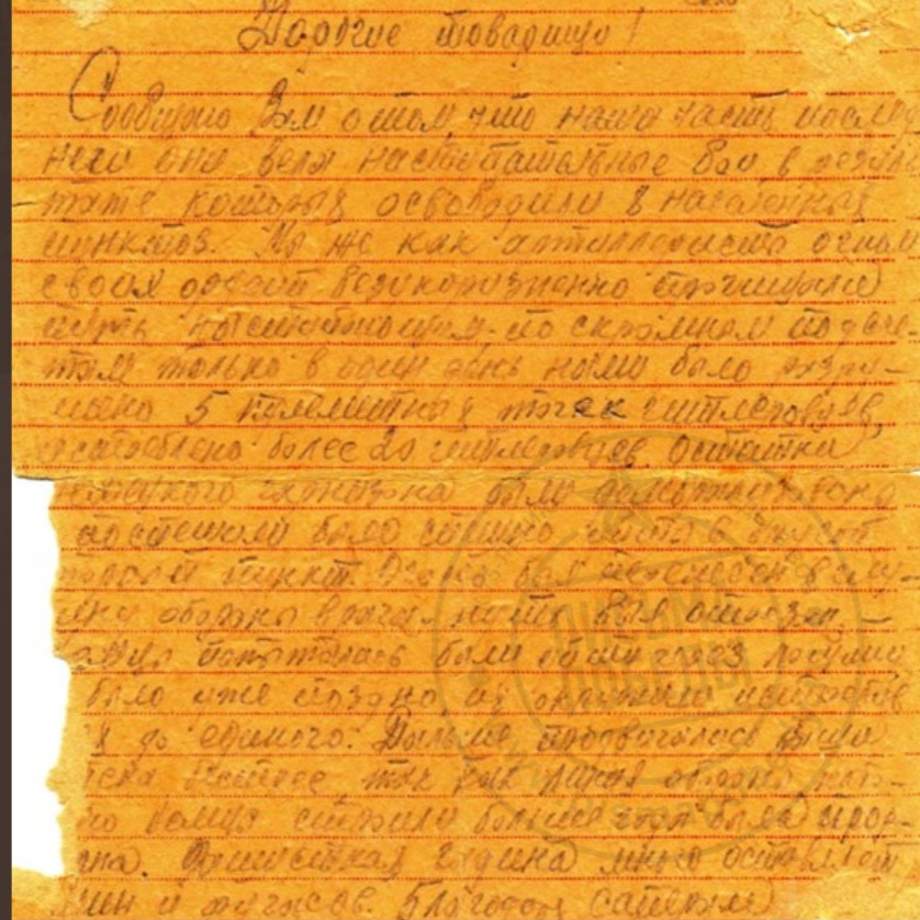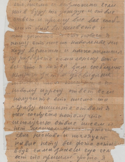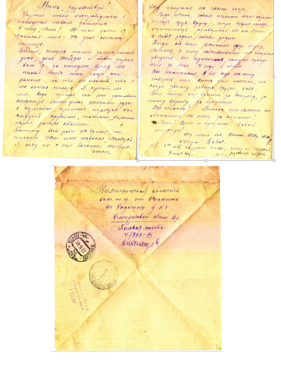 Письмо 2. Князев Иван Дмитриевич родился в 1911 году в городе Ленинграде, окончил 7 классов. В 1940 году приехал из Ленинграда жить в пос. Гузятино Калининской области. Имел семью. Жена - Мария Васильевна 1913 года рождения и 2 сына. Перед самой войной переехал на постоянное место жительства в Бологое-2 Бологовского района Калининской области и через несколько месяцев Ивана Дмитриевича призвали в армию. Из Бологое мобилизованного И.Д. Князева в 1941 году отправили в Волочек на призывной сборный пункт, из под Смоленска от Ивана Дмитриевича пришли последние два письма (которые были озвучены) и больше весточек не было. В 1943 году из Москвы пришло сообщение о том, что он пропал без вести и семье сразу перестали платить как семье солдата. А в 1944 году пришло сообщение из Москвы, что Князев Д.И. погиб как герой, но не даты смерти, ни место нахождение могилы не указано. Письма в музей Бологовского колледжа передал сын Ивана Дмитриевича Князев Виктор Иванович, а так же последнюю сохранившуюся фотографию отца.