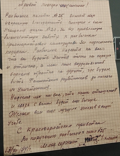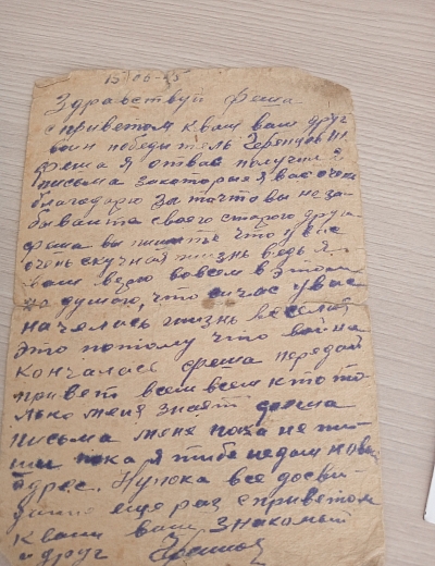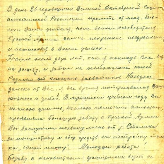 Мельник Иосиф Евменович, ст. лейтенант 27 артиллерийского полка 5 стрелковой дивизии, однополчанин Решетникова Владимира Михайловича, погибшего 12.12. 1942г в Тульской области, Арсеньевского района, д. Савинки ( место захоронения: в центре села у школы). Иосиф Евменович пишет письмо отцу погибшего солдата, Решетникову Михаилу Петровичу, (1892-1976 гг.), рассказывая о судьбе его сына. Его отец Михаил Петрович был знаменитым краеведом Корочанского района. Создал 9 тетрадей рукописей, одна из которых хранится в нашем школьном музее.