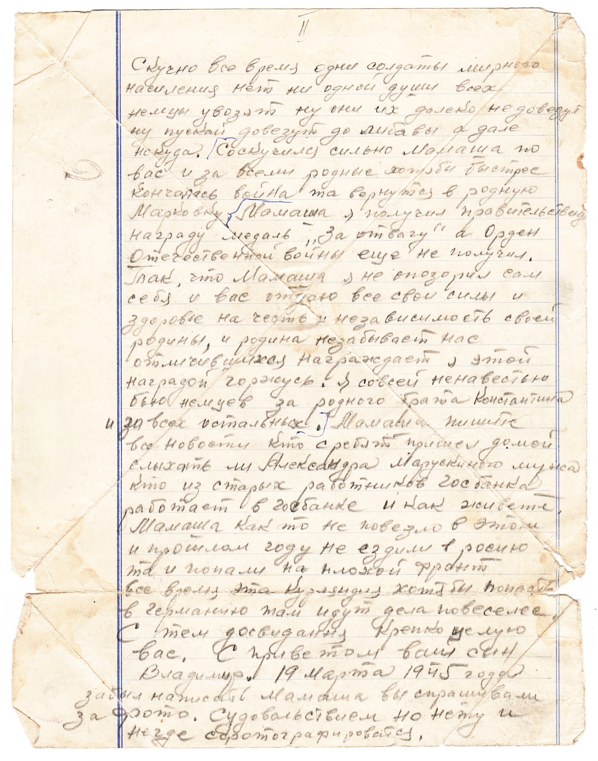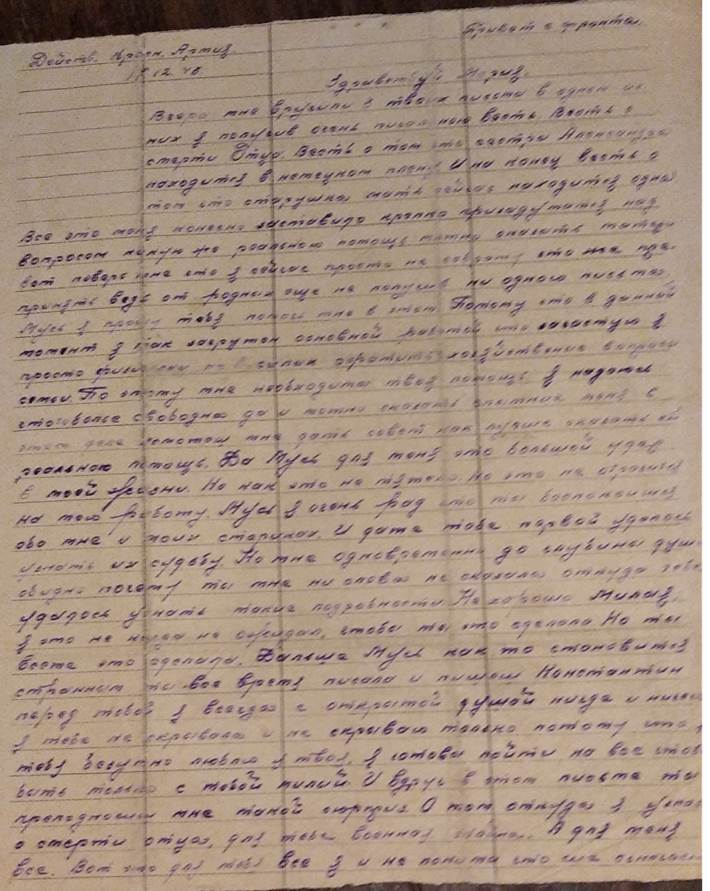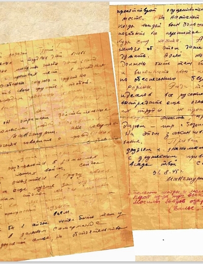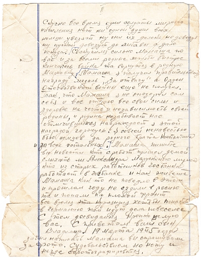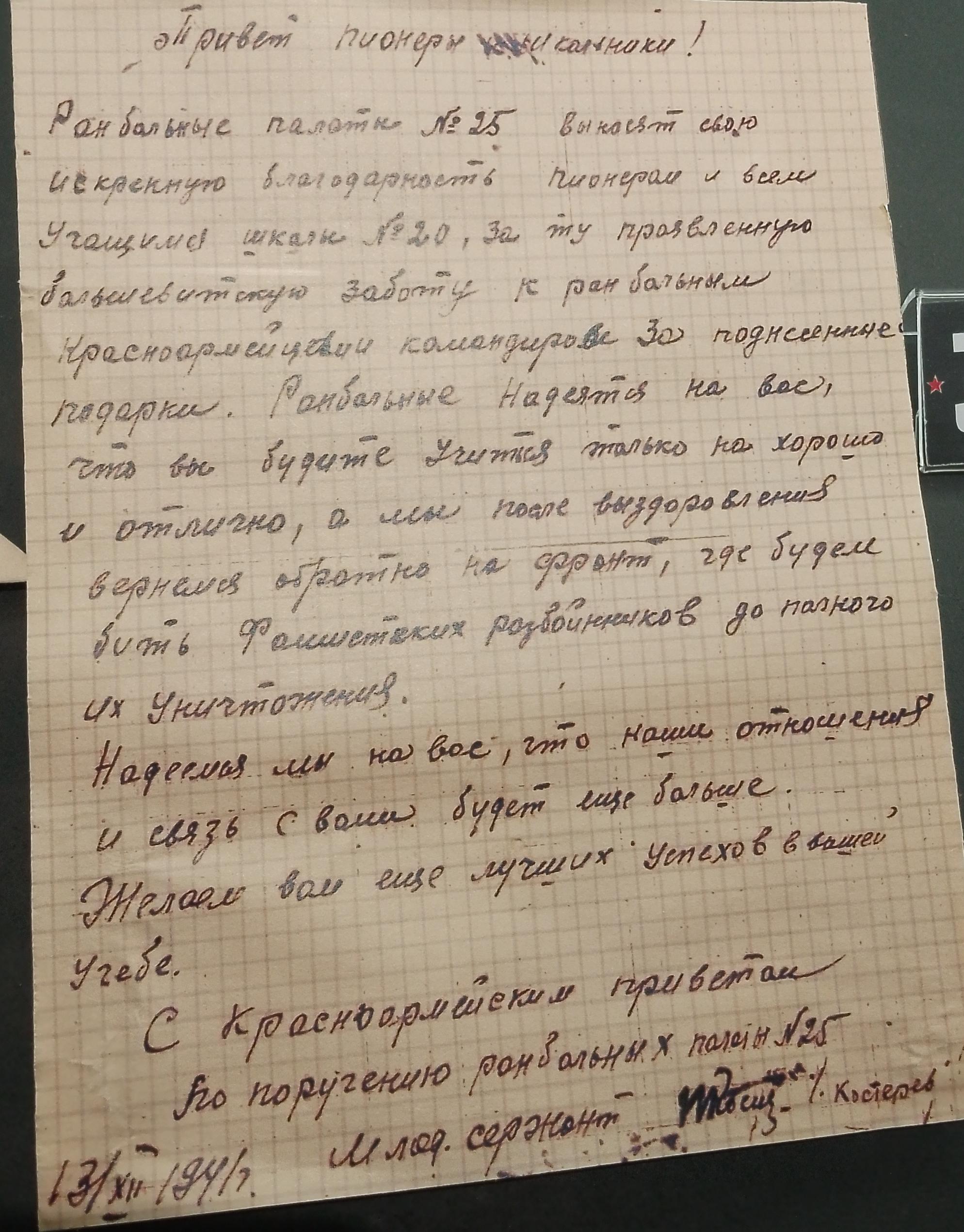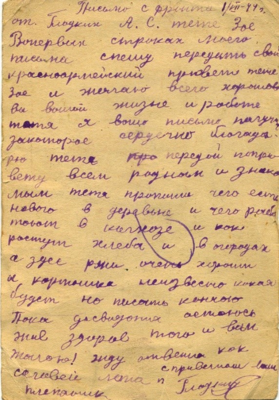 Гладченко Константин Иванович родился в 1912г., уроженец с. Сурско-Михайловское Солонянского района Днепропетровской области. В мае 1943 г. командир 26 гвардейской танковой бригады К. И. Гладченко познакомился с Кидановой Марией в г. Короча, Курской области (ныне Белгородская). В с. Пушкарное г. Короча дислоцировались войска для подготовки к Прохоровскому сражению. Данное письмо было последним, которое он написал, 23.06. 1944 г. майор Гладченко К.И., командир батальона 26 гвардейской танковой бригады погиб.