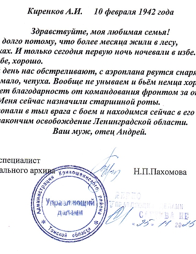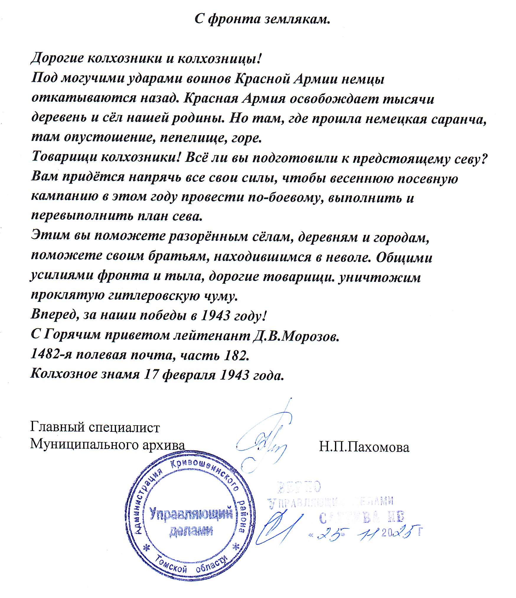 Обращение лейтенанта Д.В. Морозова к землякам через районную газету "Колхозное знамя" от 17 февраля 1943 года.