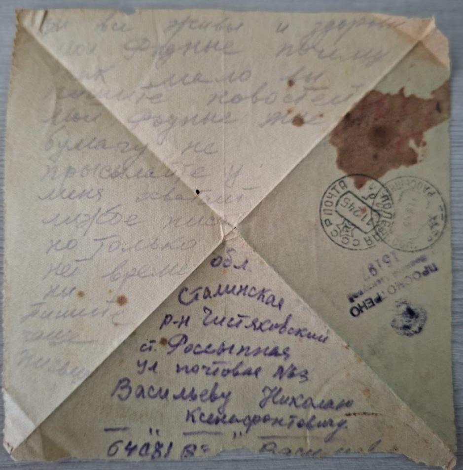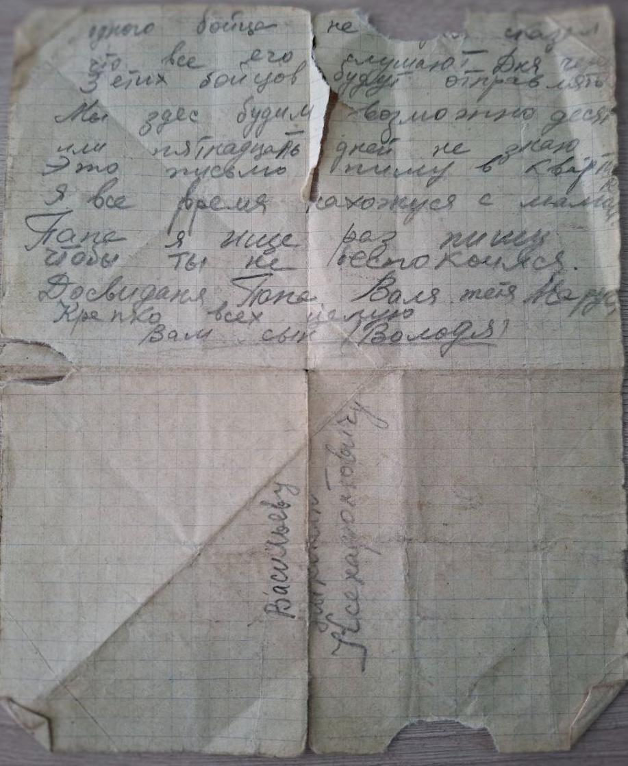 Васильев Владимир Николаевич родился 7 апреля 1924 года в Сталинской области, Чистяковского района, улица Почтовая, 83. Был призван в 1941 году. Был ранен, лежал в госпитале. Погиб в Восточной Пруссии.