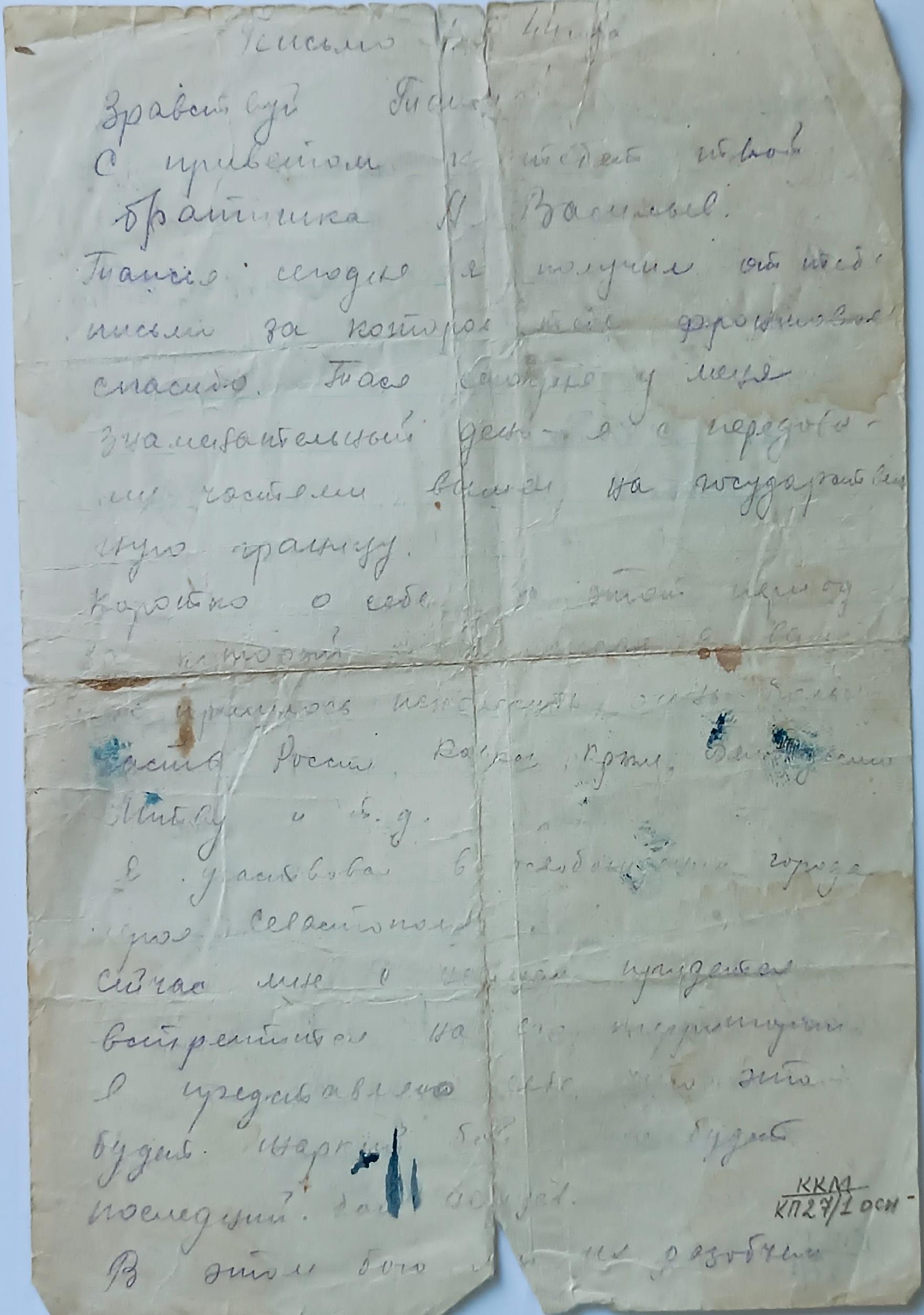 Лейтенант Васильев воевал на Кавказе, в Крыму, Белоруссии, Литве, участвовал в освобождении Севастополя. Дважды был ранен, но возвращался в строй. Письма его полны оптимизма и горячей веры в победу над врагом.