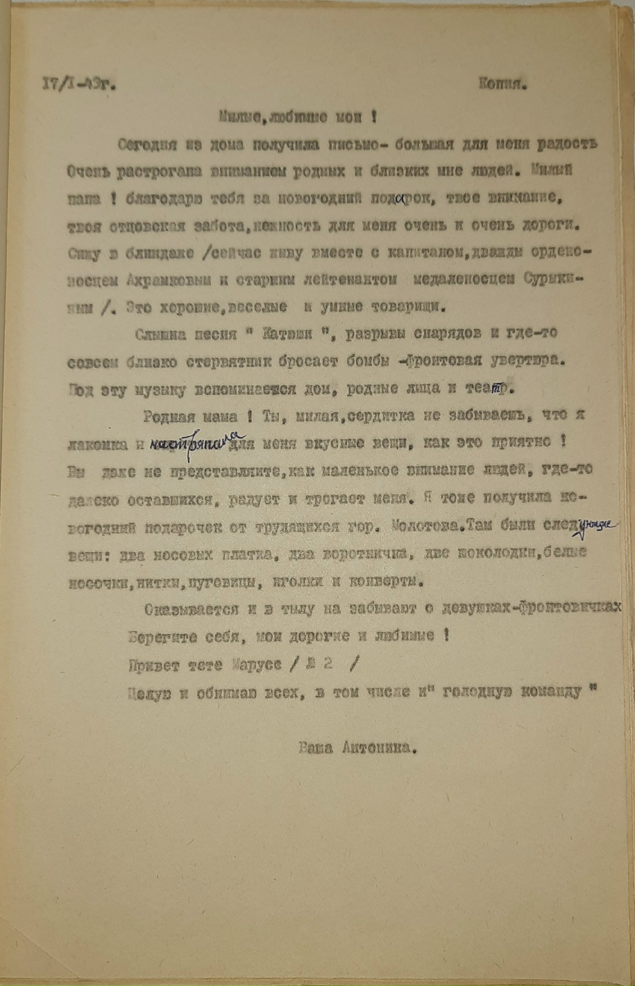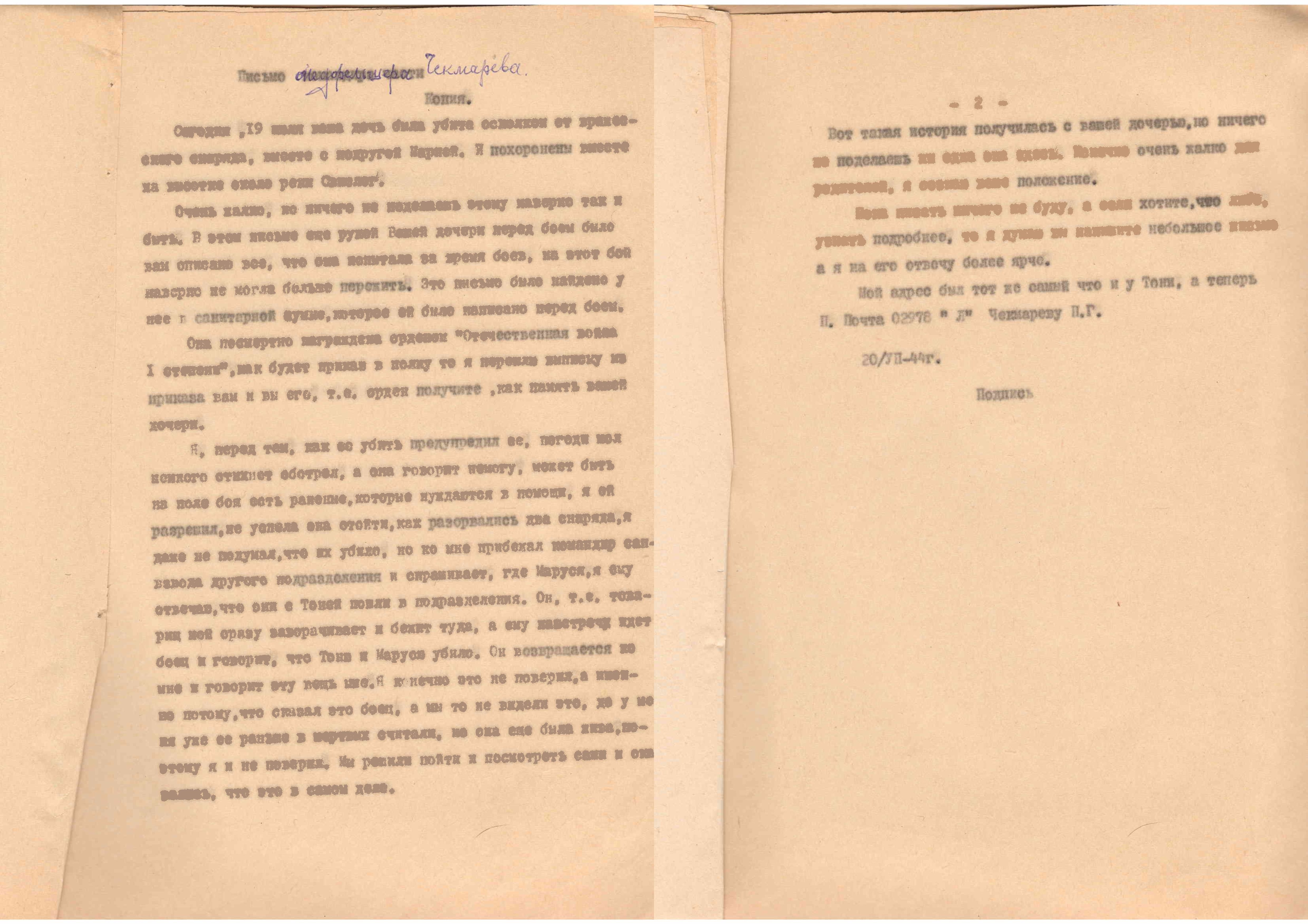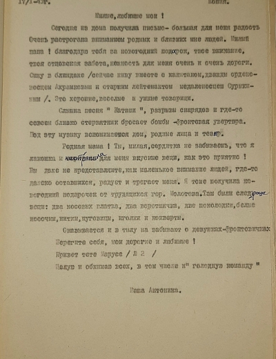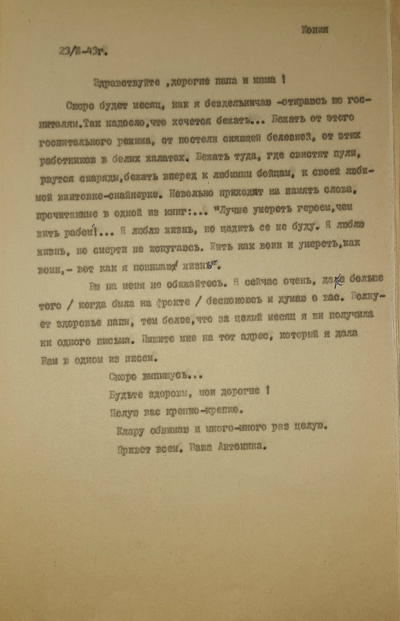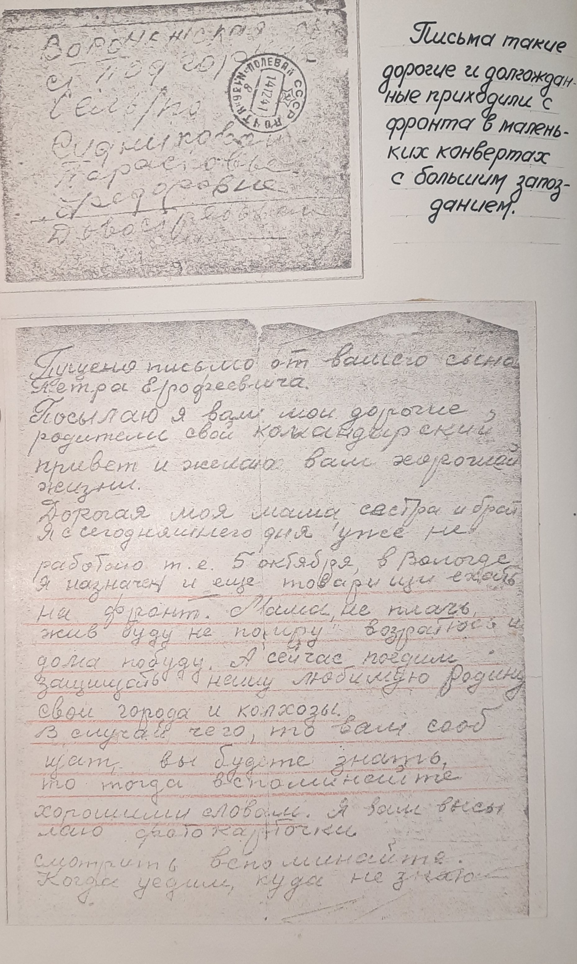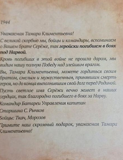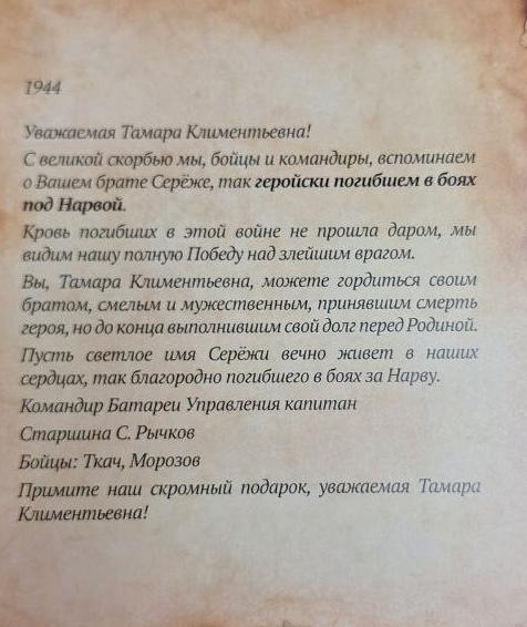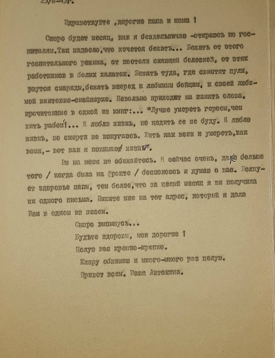 «Я жив, а что будет дальше, конечно, сказать нельзя. На днях вышел приказ о присвоении мне звания заместителя политрука и политотдел нашего полка назначил меня на должность комиссара роты. Это высокое и почетное звание. Я буду стараться выполнять с честью».