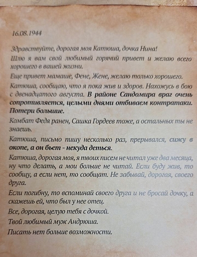 Письмо Сергея Николаевича хранится в школьном музее очень давно, в папке "Семья Тороповых". В этой удивительной семье было 4 сына, все они были участниками Великой Отечественной войны. Это письмо было написано другом одного из сыновей, а именно Валентина. В нём Муравьёв Сергей Николаевич сообщает родителям о смерти их сына, вместе с которым они воевали в одном экипаже, они были танкистами.