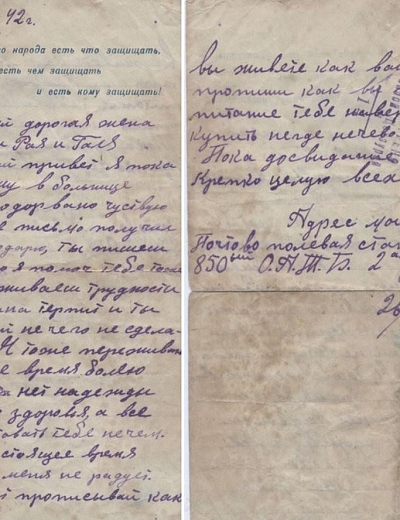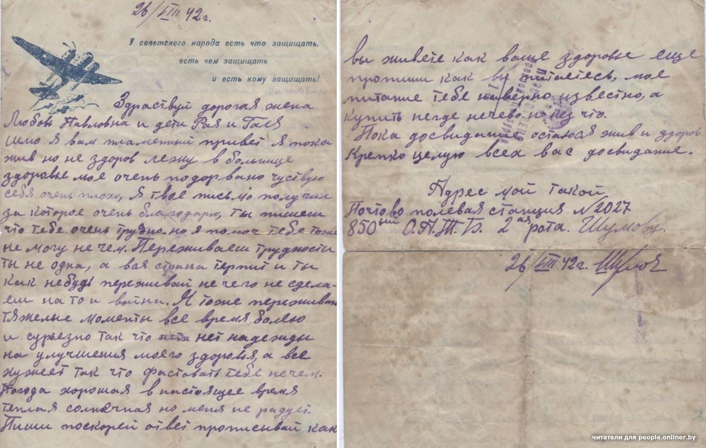 Это письмо Федор Петрович Шумов написал из госпиталя 26 августа 1942 года. И сам солдат, и его жена Любовь были родом из деревни Медухово Логойского района.